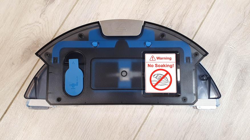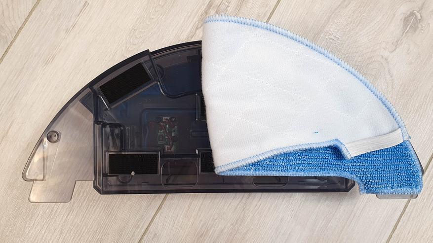 Вторая насадка используется для влажной уборки. У нее бак для воды на 300 мл и встроенная помпа, которая качает воду на тряпку. Помпа электрическая, так что погружать в воду целиком насадку тоже нельзя, заливается вода в специальную горловину, которая закрывается резиновой заглушкой.
