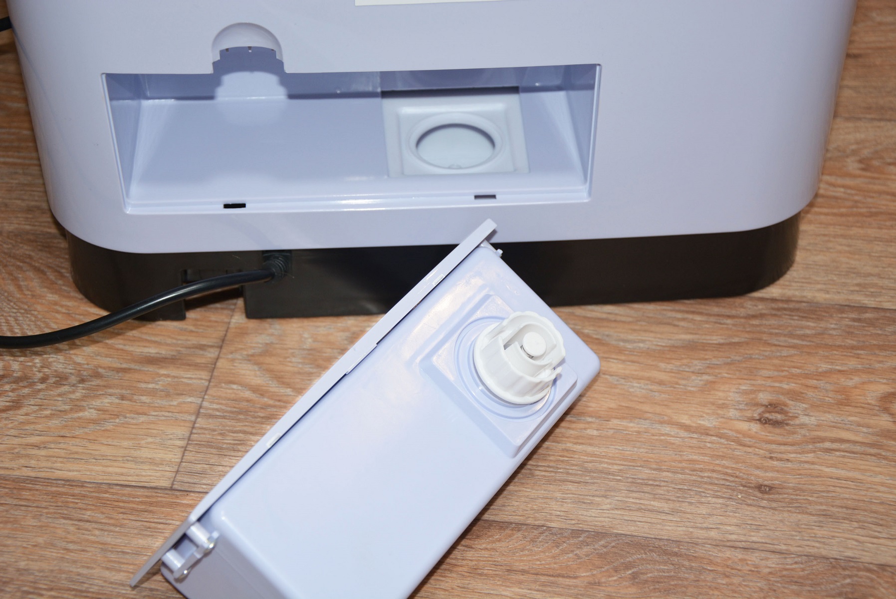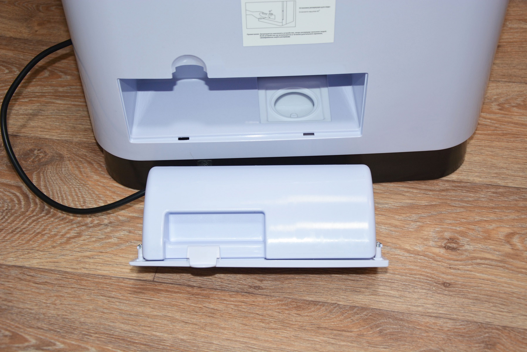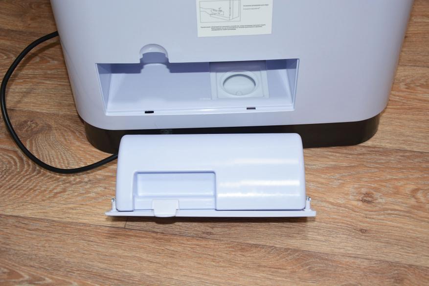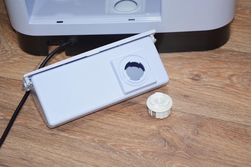 В нижней части тыльной стороны находится отсек резервуара увлажнителя воздуха. Открывается он точно также, как лючок фильтра на стиральных машинах. Вместимость бачка два литра, хотя визуально и не скажешь. Интенсивность работы увлажнителя поменять возможности нет — всегда работает в одной поре и емкости хватает на 12 часов работы. Для заливки воды нужно немного повернуть пробку-клапан против часовой стрелки. Само собой разумеется, что воду лучше заливать очищенную, а не из-под крана. Внутри корпуса, под бачком расположен поддон для сливного отверстия которого в комплекте и идет запасная силиконовая пробка. Слив воды предусмотрен на случай транспортировки увлажнителя.