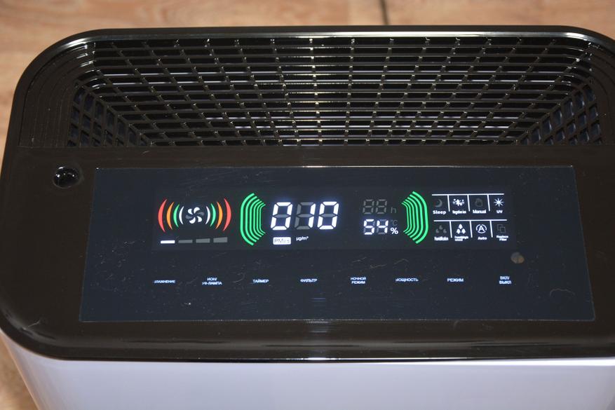 После касания кнопки включения воздухоочиститель начинает работать на минимальной скорости. Всего их тут четыре и выбираются они кнопкой Мощность. С увеличение скорости загорается очередной сегмент индикатора. Цветные волны вокруг значка вентилятора загораются последовательно и к горизонтальному индикатору мощности не привязаны. По уровню шума очиститель мощно сравнить с кондиционером.