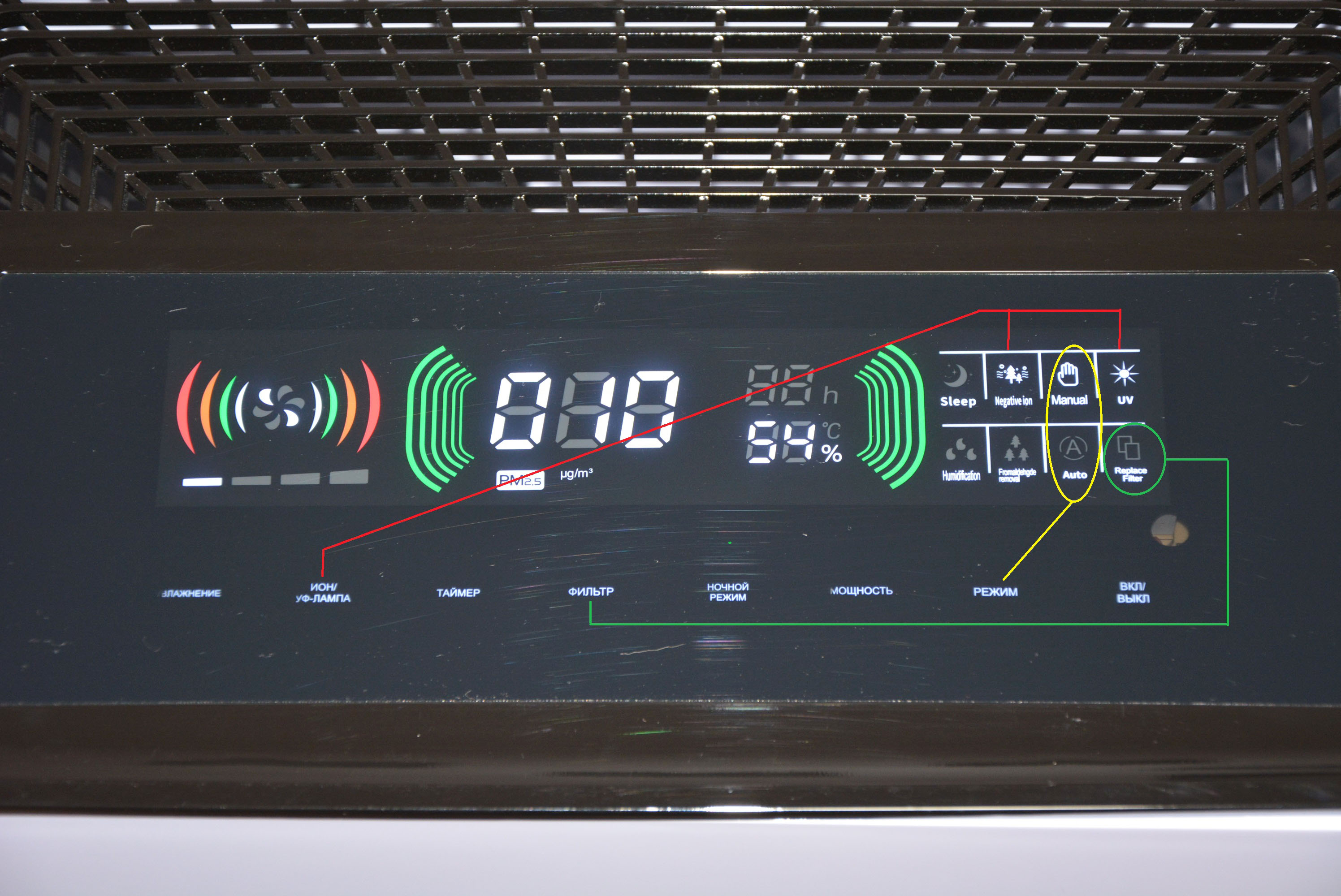 В центре верхней части панели управления расположен индикатор качества воздуха. Вот тут уже боковые волны или дуги имеют практическое значение. Цифровое значение содержания тонкодисперсных частиц PM2.5 в воздухе отображается на трехзначном табло и измеряется в µg/м3. Дуги в зависимости от уровня PM2.5 могут менять свой цвет с зеленого (хорошее — 10-70 µg/м3), на оранжевый (нормальное — 70-140 µg/м3) и красный (плохое — выше 140 µg/м3). Как раз в этой ситуациях не лишним будет вспомнить про чистку пылесосом датчика качества воздуха на боковой панели очистителя.