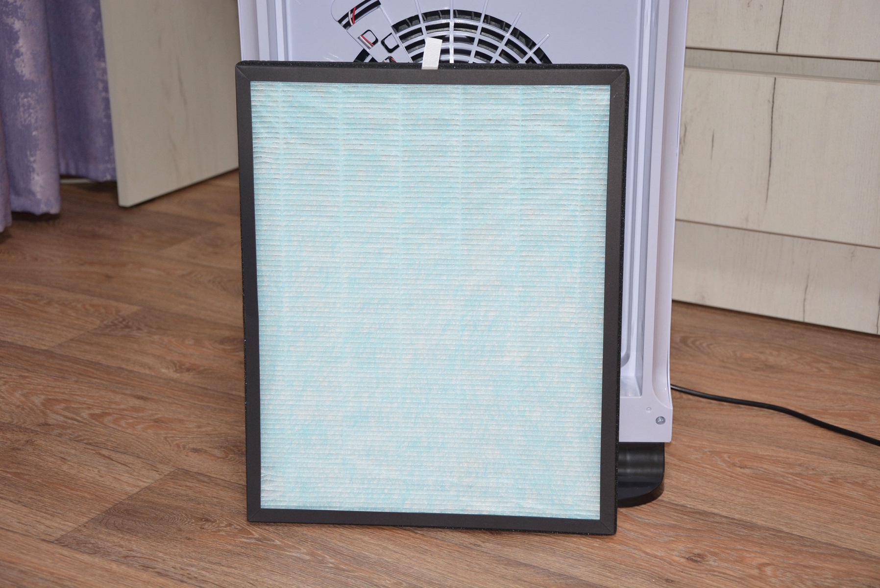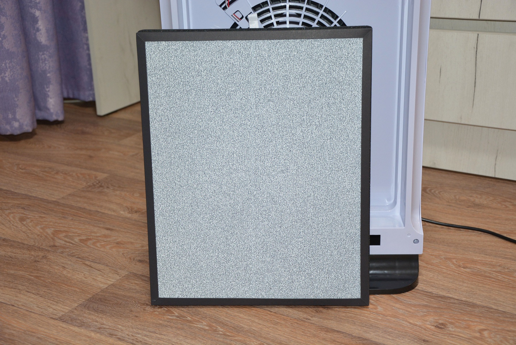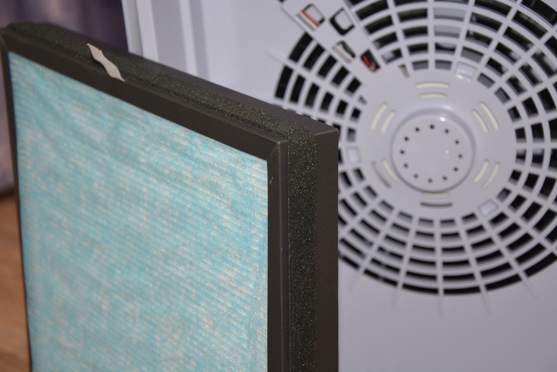 Фильтрующий элемент воздухоочистителя представляет собой довольно сложную, не однослойную систему. Волосы, шесть животных задерживаются на внешнем слое фильтра или фильтре предварительной фильтрации, напоминающем ткань для медицинских одноразовых халатов. Далее вступает в игру HEPA фильтр, задерживающий 99.9 % частиц размером до 0,3 мкм. С обратной стороны рамки слой губки, пропитанной неким составом, а если перевернуть фильтр, то можно услышать, как что-то внутри пересыпается. Возможно это и есть то самое угольное наполнение. Прохождение нефильтрованного воздуха извне к вентилятору исключено наличием уплотнителя по периметру фильтра и вставляется в воздухоочиститель он плотно. Срок службы фильтра составляет порядка 3000 часов (8-12 месяцев). В тоже время рекомендуется после 1-2 месяцев освежать его пылесосом, а о необходимости его замены даст знать сигнал на панели управления очистителя.