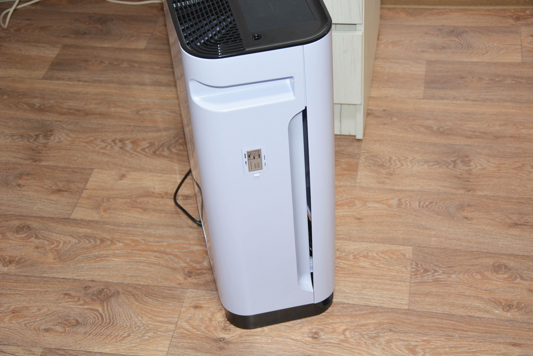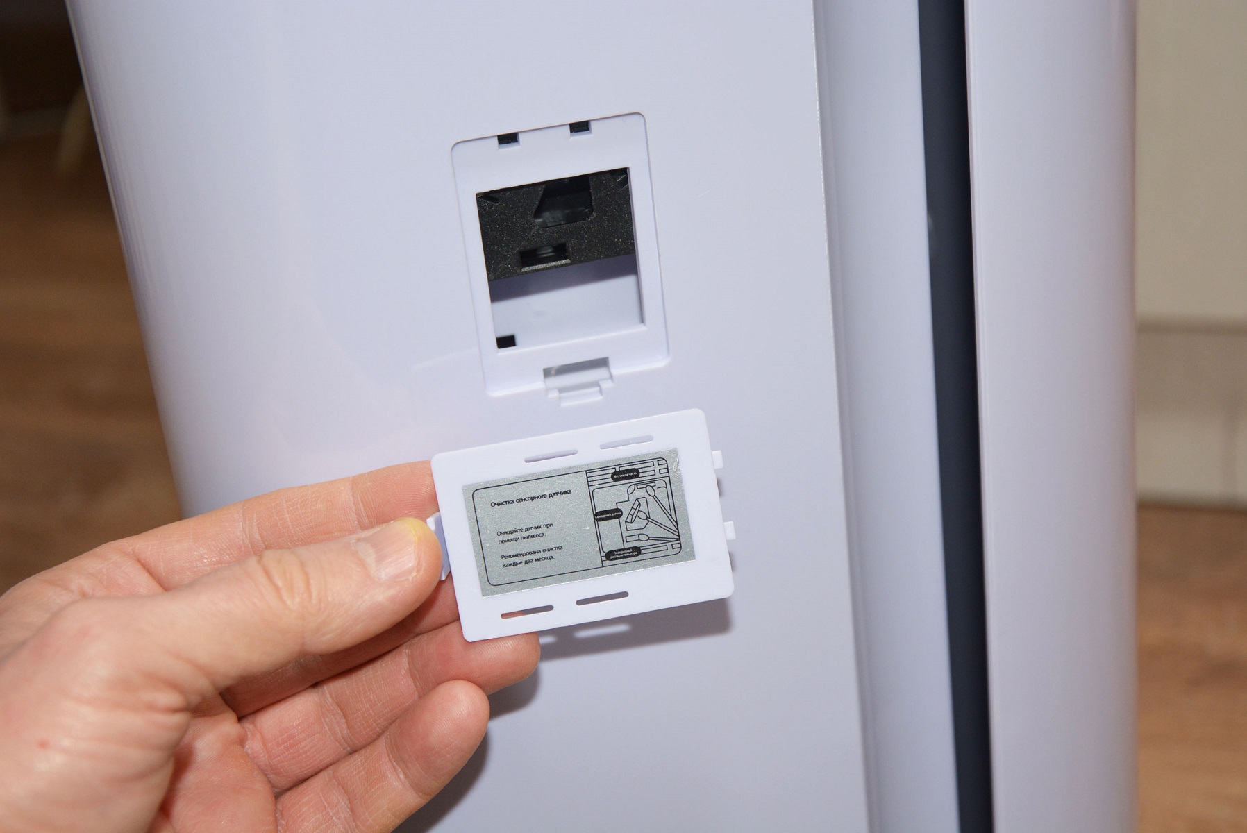 На другой стороне корпуса, кроме рукоятки и щели воздухозаборника расположен отсек датчика качества воздуха. О том, что это важный элемент очистителя свидетельствуют две памятки на внешней и внутренней стороне лючка и одна из них рекомендует очищать датчик качества воздуха раз в пару месяцев с помощью пылесоса для корректной работы воздухоочистителя.