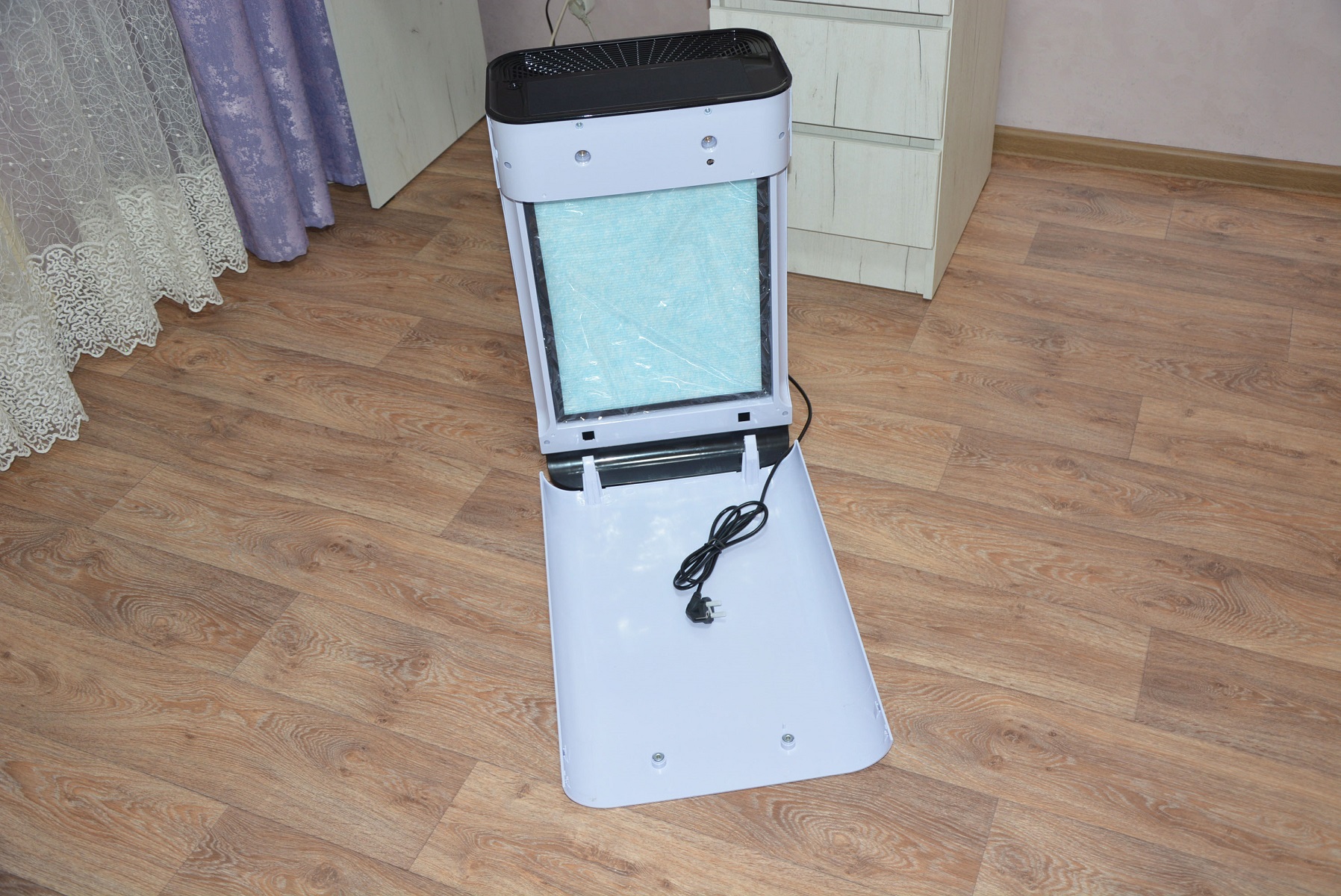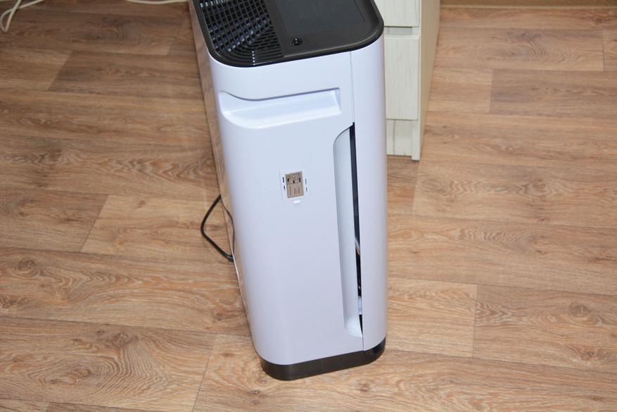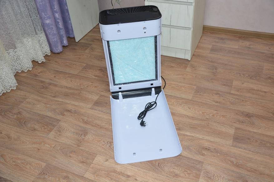 Собственно, принцип действия очистителя очень простой и схож с принципом работы пылесоса. Мощный вентилятор всасывает воздух через воздухозаборники, расположенные в нижней части лицевой стороны корпуса и вертикальные по бокам. Далее воздух проходит через HEPA фильтр большой площади с угольным наполнением, проходит обработку ультра фиолетовым излучением, ионизатором, освобождаясь от пыли, пыльцы, пылевых клещей, вирусов, бактерий и выходит наружу. За параметрами воздуха и режимами работы следит электроника, опираясь на датчики. Перед первым включением прибора следует снять переднюю панель и снять полиэтиленовую пленку с фильтра. Панель крепится магнитами и снимается без лишних усилий.