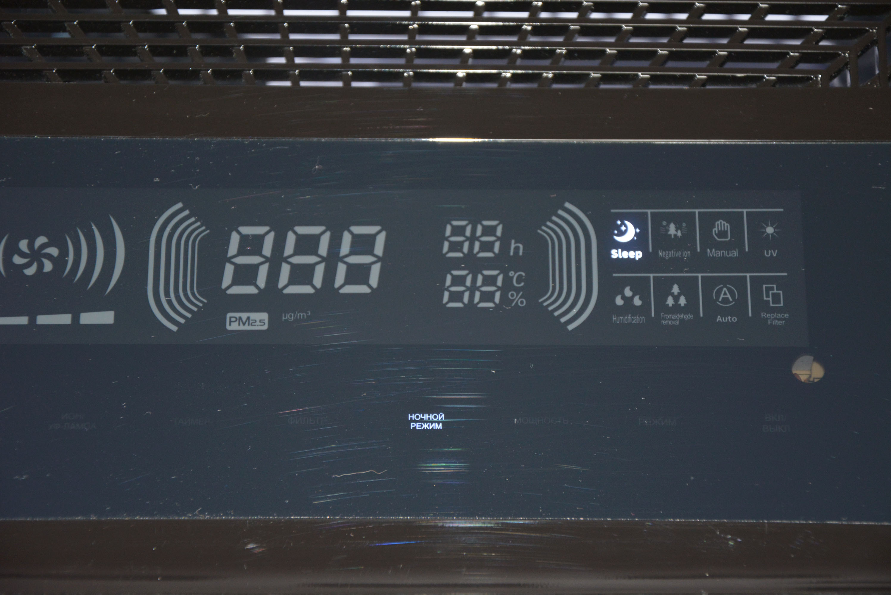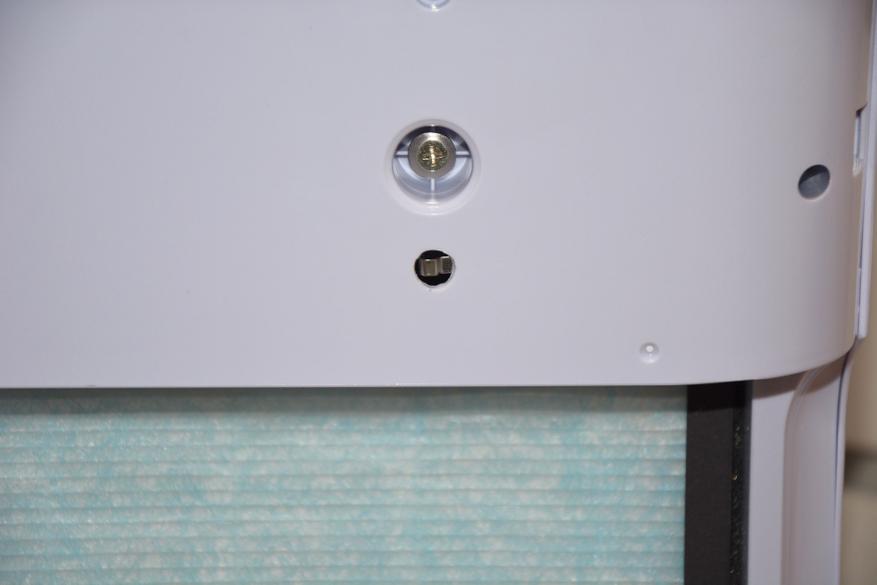 Панель управления расположена в верхней части устройства. Тут же находится решетка выхода очищенного воздуха и отверстие увлажнителя. Панель защищена матовой пленкой, но предпочел ее в дальнейшем снять так, как без пленки значки и назначение сенсорных кнопок видно куда лучше. При включении в сеть устройство находится в ждущем режиме и подсвечиваются лишь средние сегменты цифрового индикатора и кнопка включения.