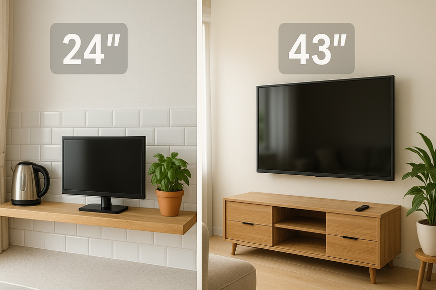 - 24-28 дюймов — для кухни, небольшой спальни или комнаты до 10 м². Компактные, недорогие, легко размещаются даже на полке или кронштейне.