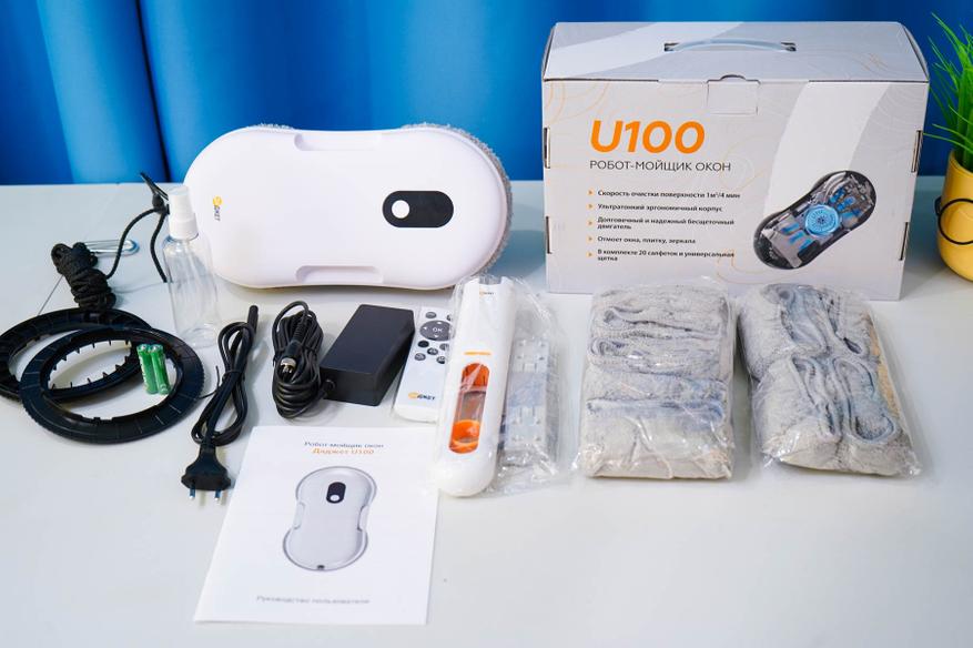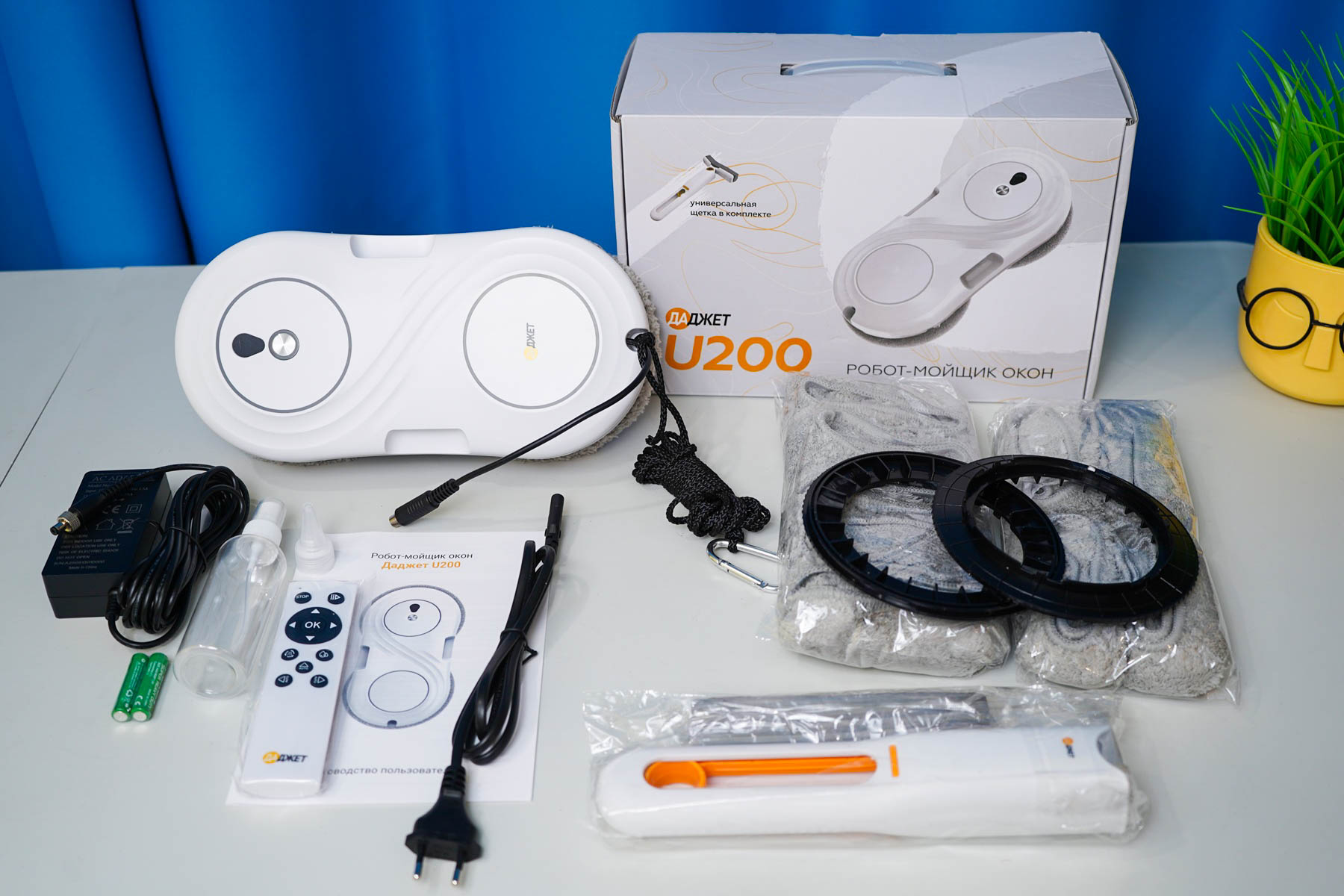 Завершает распаковку младшая модель Даджет U100. Ее особенность — это самый низкий профиль высоты корпуса. Такой робот подходит для мытья окон, например, с решетками или рольставнями. Даджет U100 имеет высоту корпуса всего 59 мм. Комплектация аналогичная предыдущим моделям, базовая функциональность такая же, за исключением распылительной форсунки. Да и по стоимости данный робот будет доступнее, так как является младшей моделью в линейке.