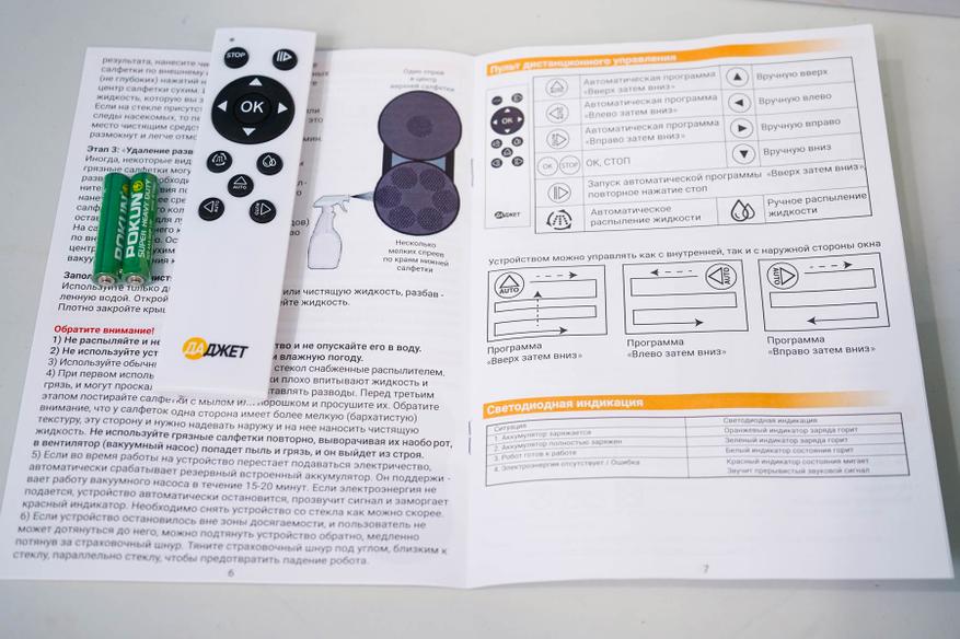 Я уже отмечал выше, что имеется возможность подавать команды дистанционно для запуска и остановки робота. Особенно полезно, если робот промывает окна снаружи, а вы остаётесь внутри квартиры. Помимо кнопок запуска и остановки автоматической программы присутствуют клавиши выбора направления движения (в стороны и вверх), а также кнопки для ручного перемещения робота в нужное место. Имеется и две кнопки, отвечающие за распыление моющего средства — это автоматическое разбрызгивание и разбрызгивание в ручном режиме по команде с пульта.