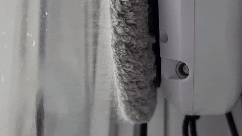 - Установить чистые салфетки и заправить воду/моющее средство. Чтобы корпус лучше закрепился на стекле, я чуть увлажняю сами салфетки перед уборкой, а также добавляю моющее средство непосредственно на стекло из распылителя.
