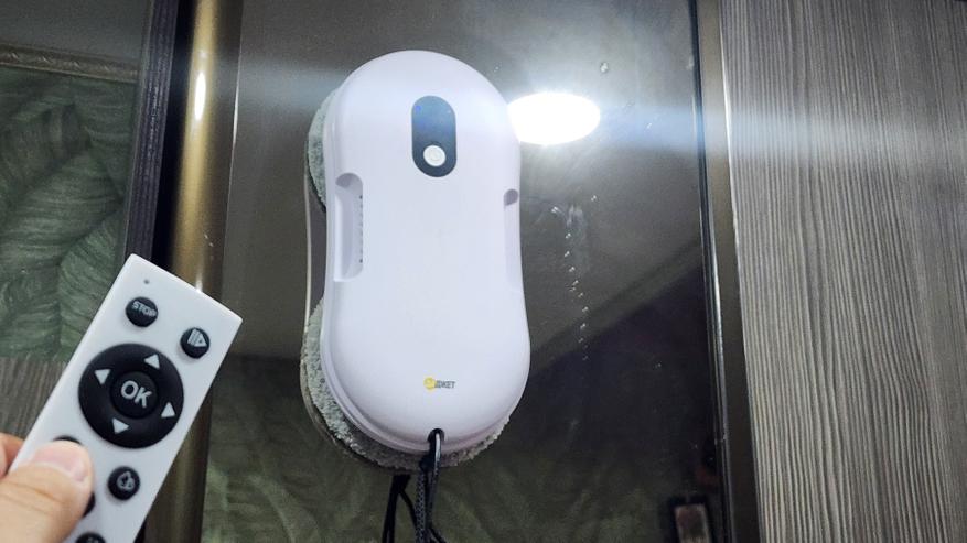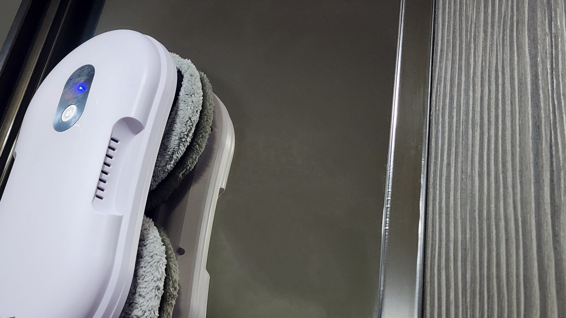 Запускаю работу кнопкой (двигатель раскручивается, появляется вакуум), прислоняю робота на удобное место на поверхности (на окно, на зеркало