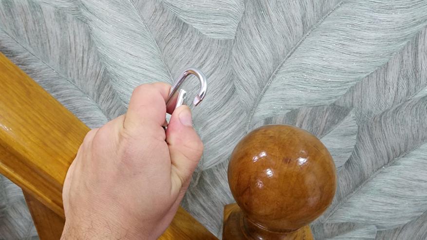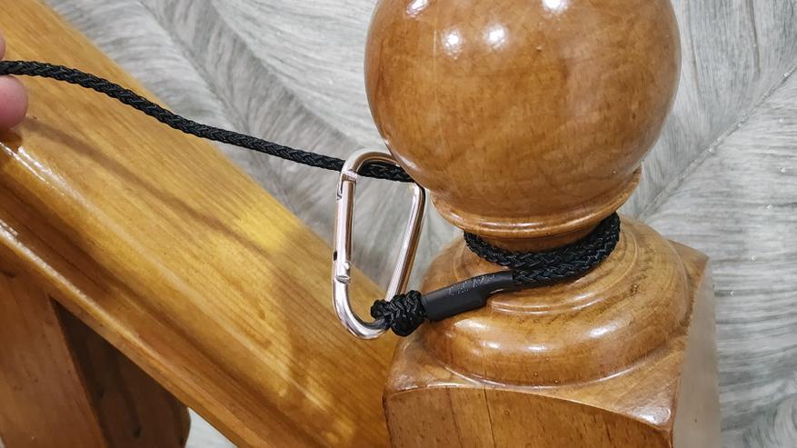 Фиксируется карабин достаточно просто — крепим на крючок/кольцо/ручки из того, что есть под рукой. Либо делаем 2-3 оборота страховочного троса, затягиваем и фиксируем карабин на тросе. Не забывайте, что длина страховочного троса не должна быть излишней, а место крепления должно выдержать самого робота. Не стоит крепить на что-то хрупкое, подвижное или на что-то, что может повредиться от такого воздействия.