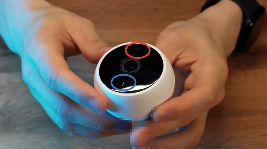 На лицевой стороне есть логотип «Mi» и индикатор о состоянии работы устройства (красный овал). Далее идет объектив камеры и микрофон (синий овал).