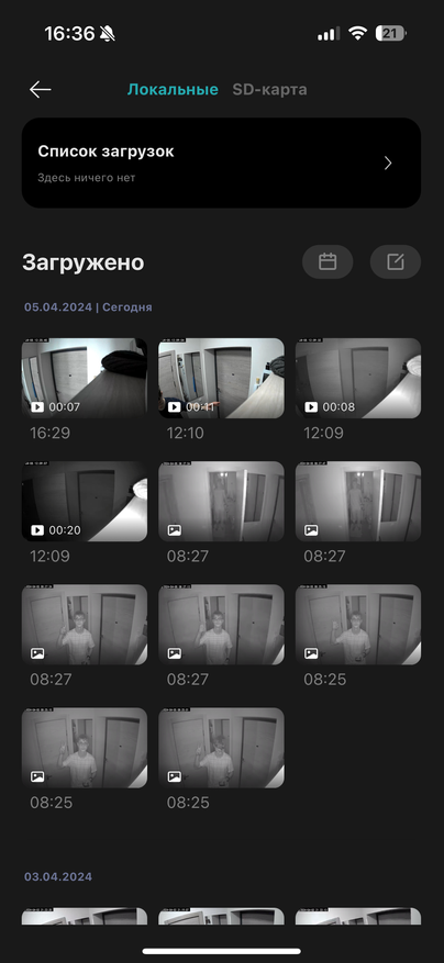 Десятая кнопка — Управление хранилищем, где есть два раздела «Локальные» и «SD-карта». После перехода мы попадаем сразу на SD-карту. В этом разделе можно посмотреть события по часам, например, узнать что было 3-го апреля с 12:00 по 13:00 и посмотреть интервальную фотосъёмку. Помимо этого, можно увидеть оставшиеся место на карте памяти. В «Локальные» попадают все скриншоты и записи, которые были сделаны вручную, благодаря кнопкам 7 и 8. Эти скриншоты и записанные видео у меня в разделе «Локальные» можете увидеть в видео на YouTube.