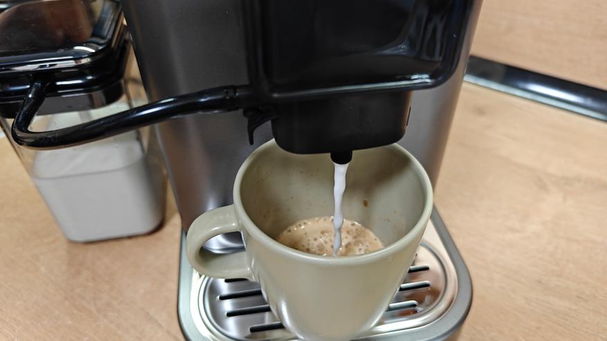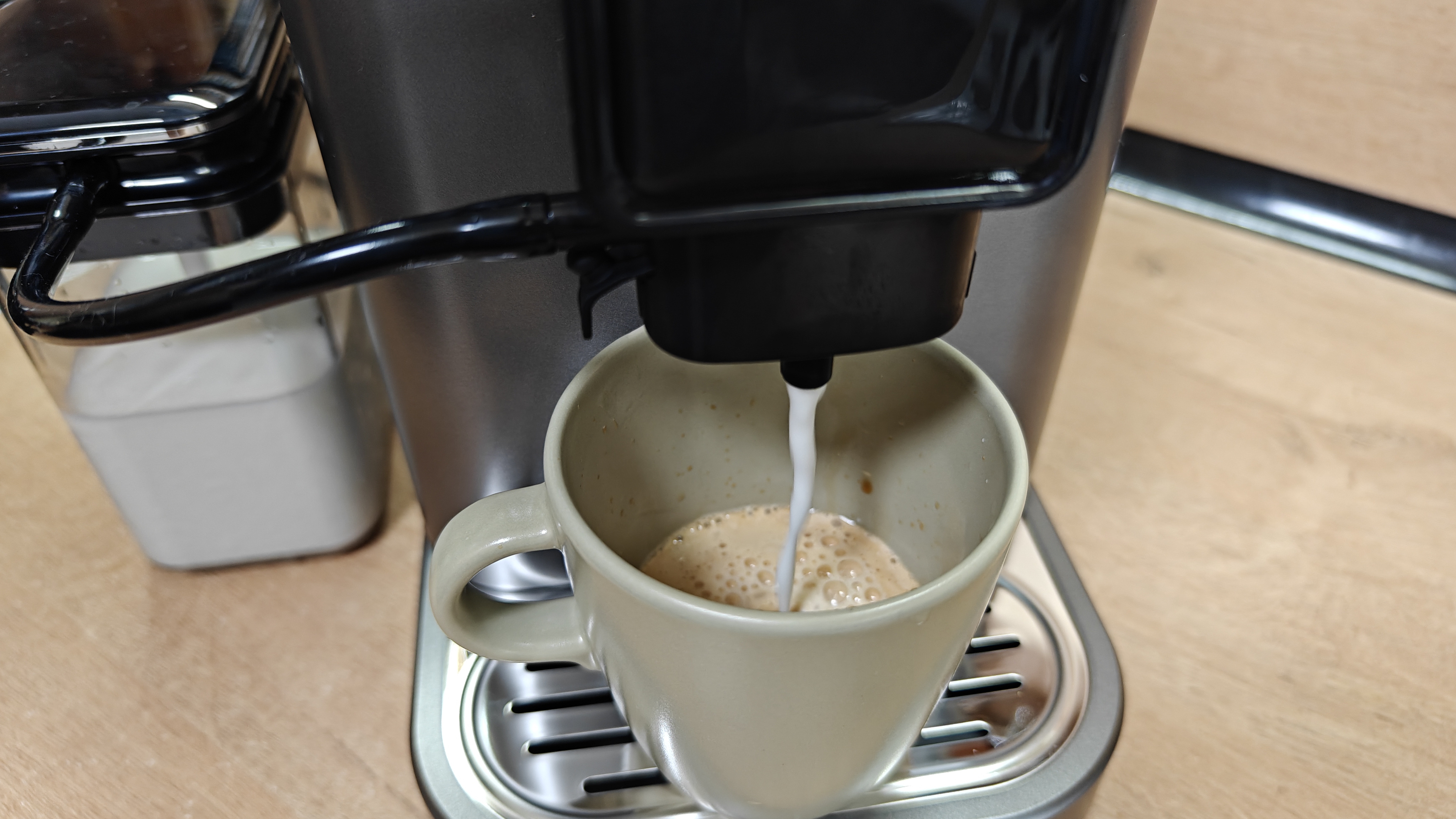 Но наша основная задача — это приготовление капучино. В первый запуск машинка варит минимальное количество напитка — это примерно половина чашки 200 грамм. Что я отметил — так это очень густая пена. Капучино обладает такой густой пеной, что ее проще скушать ложкой, нежели прост выпить. В общем эта машинка создана для взбивания молока. Я всегда использую жирность 2.5 или 3.2 процентов. Что я отметил особо — так это то, что кофе подается именно с консистенцией непрозрачного напитка. Потому что некоторые бренды (даже именитые) могут сначала подавать кофе, а потом уже подавать полупрозрачную жидкость, что, разумеется, влияет на вкус кофе на выходе. Тут объем смолотого кофе рассчитан корректно и в зависимости от выбранного объёма, подается именно кофе, а не кофейный раствор. После подается струя взбитой пены.