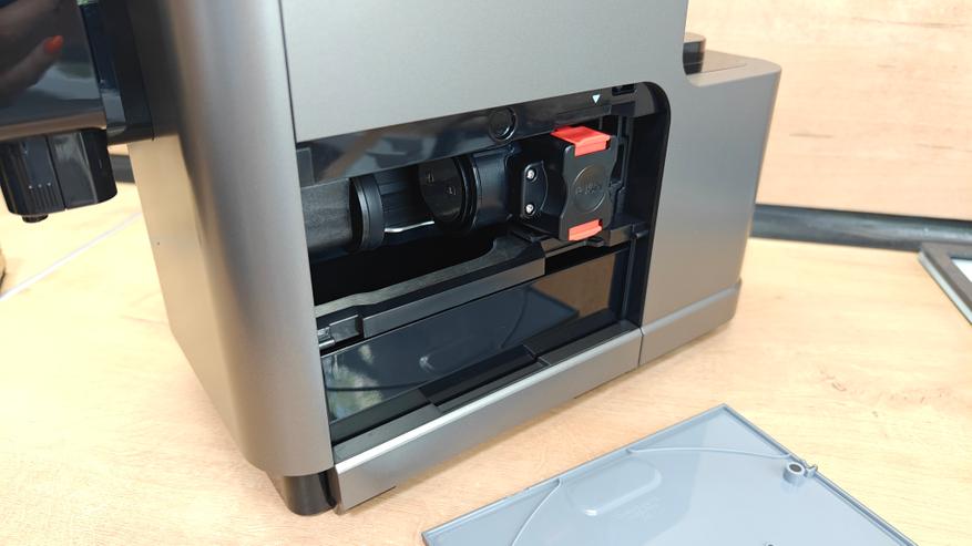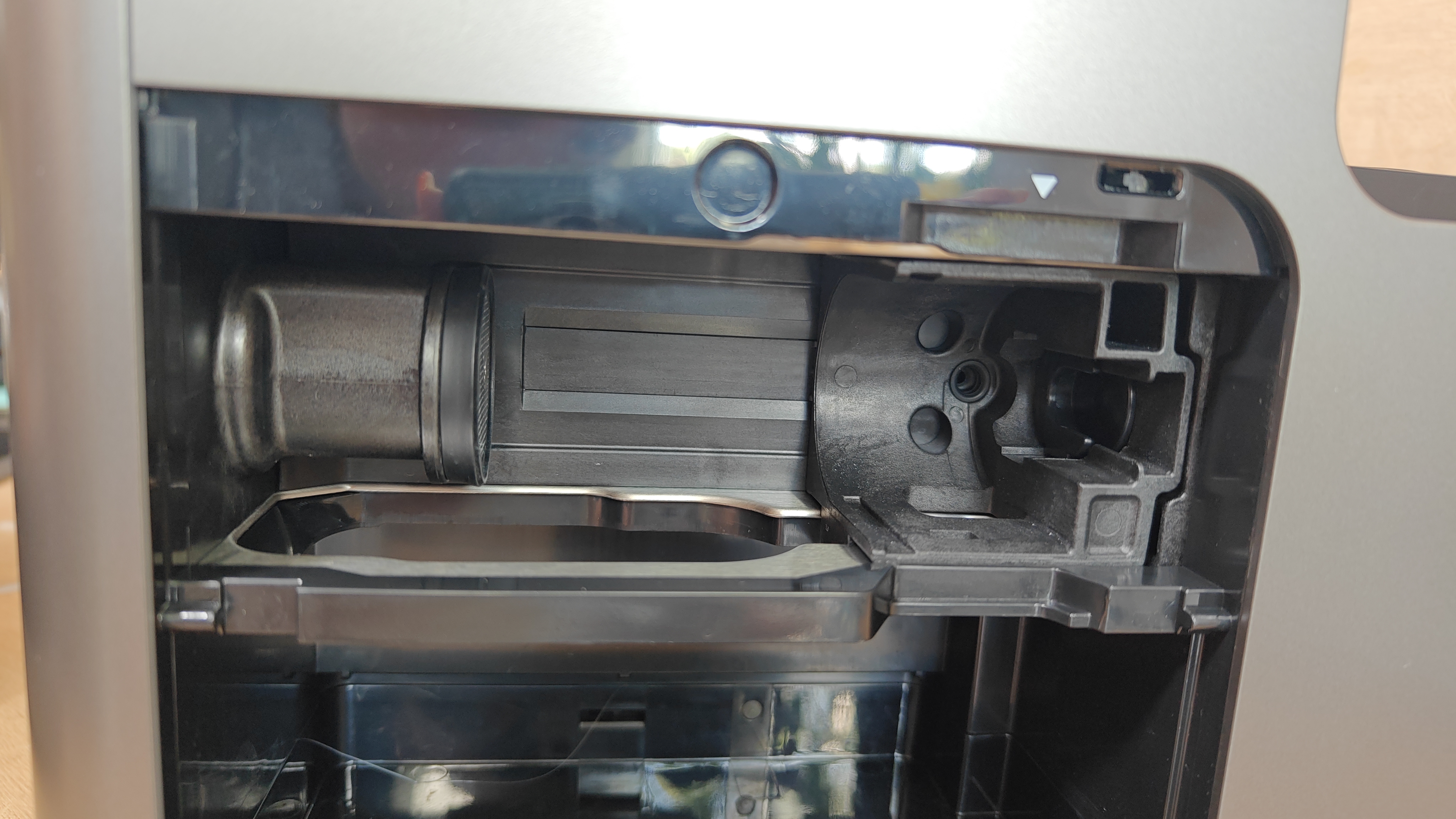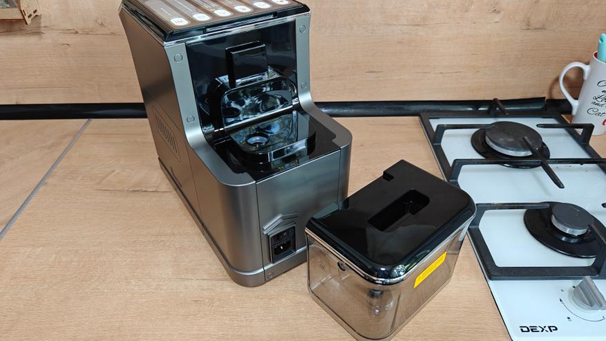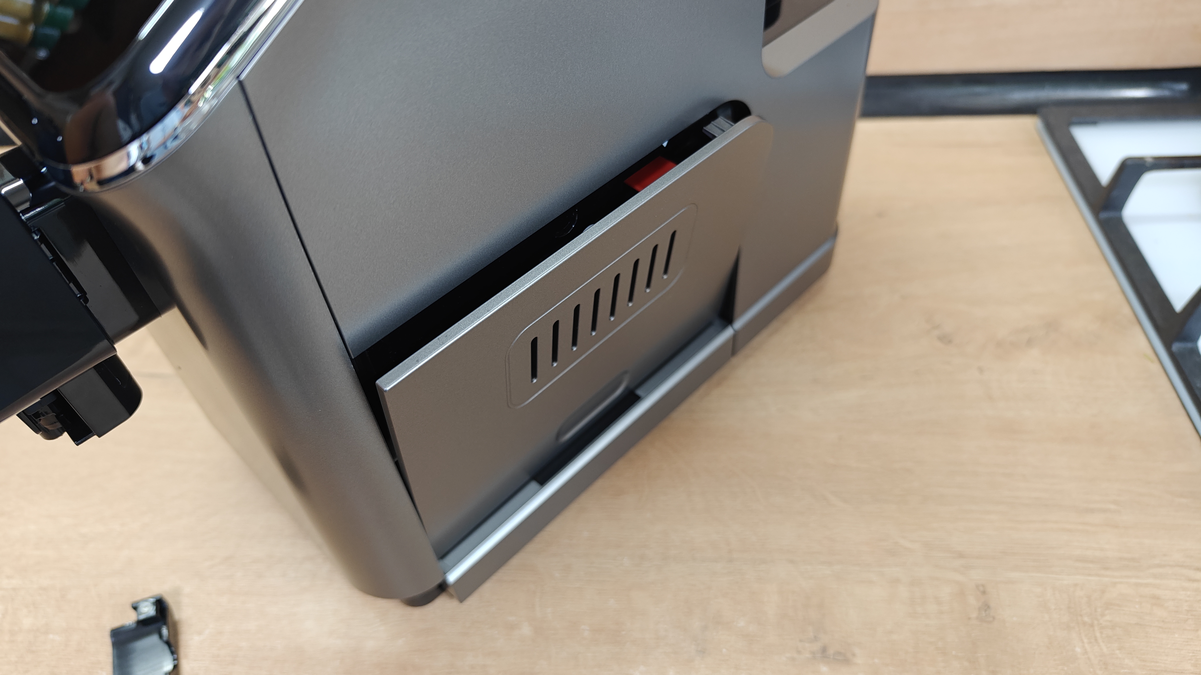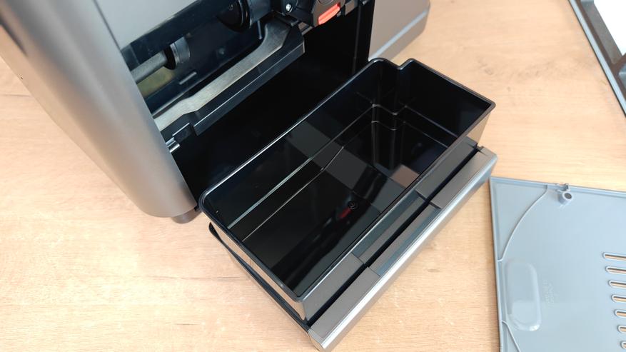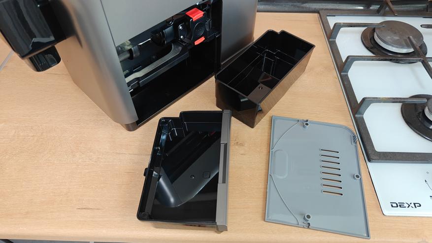 Теперь рассмотрим отсек, где расположен и варочный блок, и контейнер для сбора таблеток отработанного кофе. Крышка удерживается на магнитах, это мне очень понравилось. Внутри открывается вид на варочный блок с красными кнопками для его извлечения. Контейнер для сбора отработанного кофе собирается из двух частей. Часть, куда падают таблетки, легко промывается.