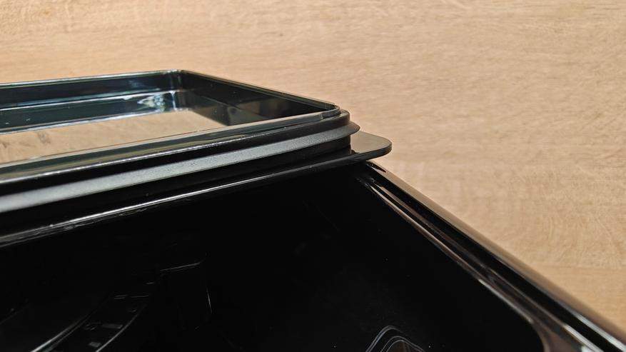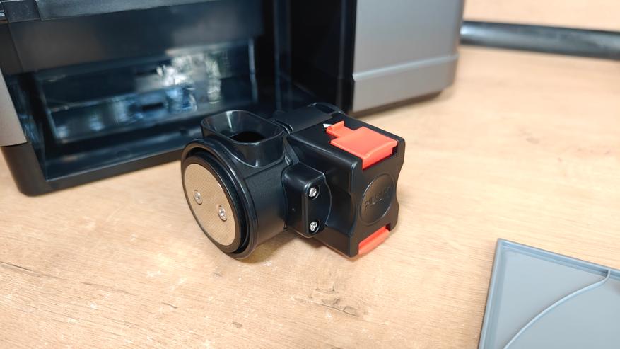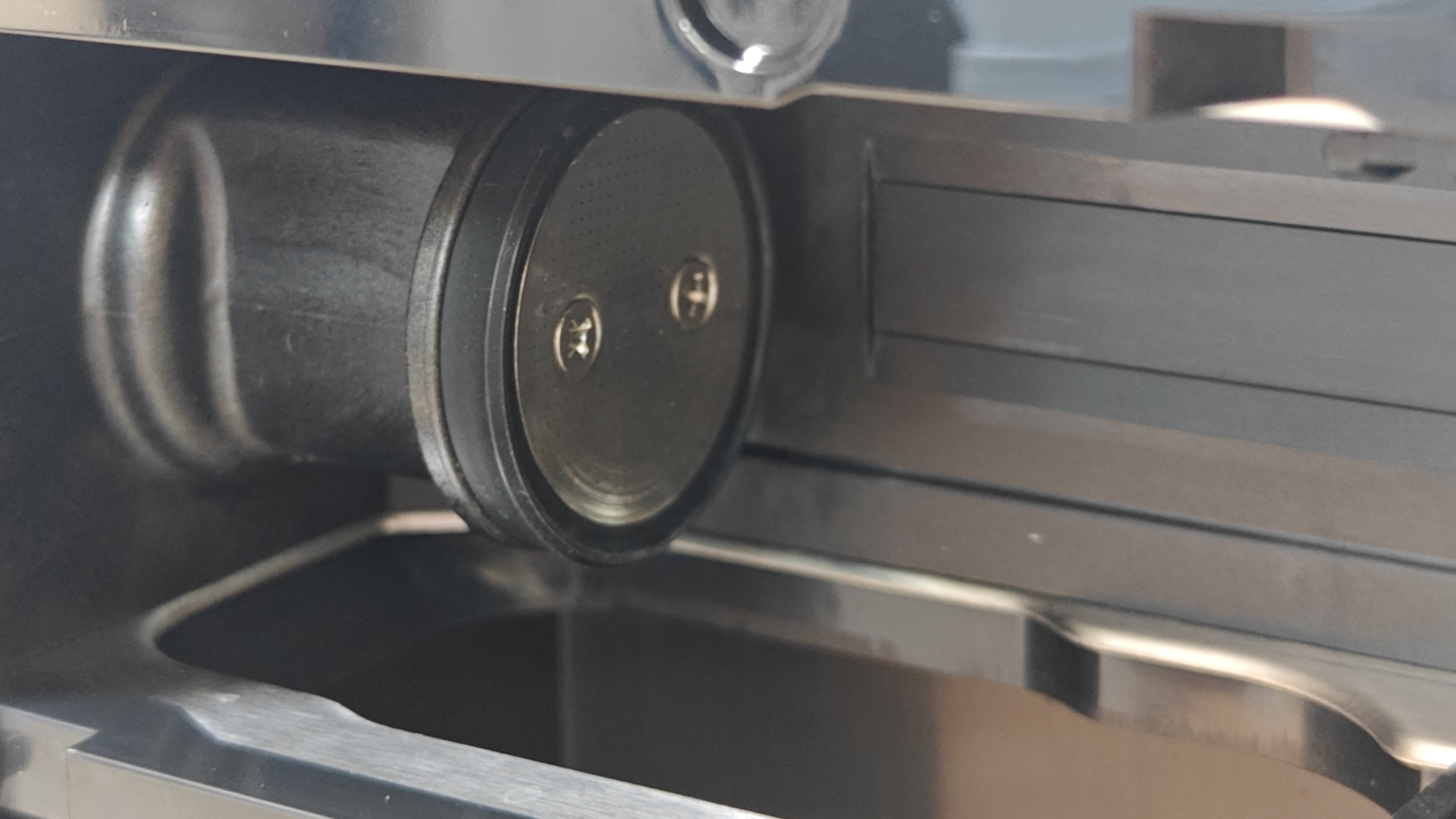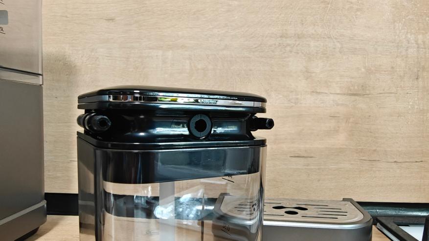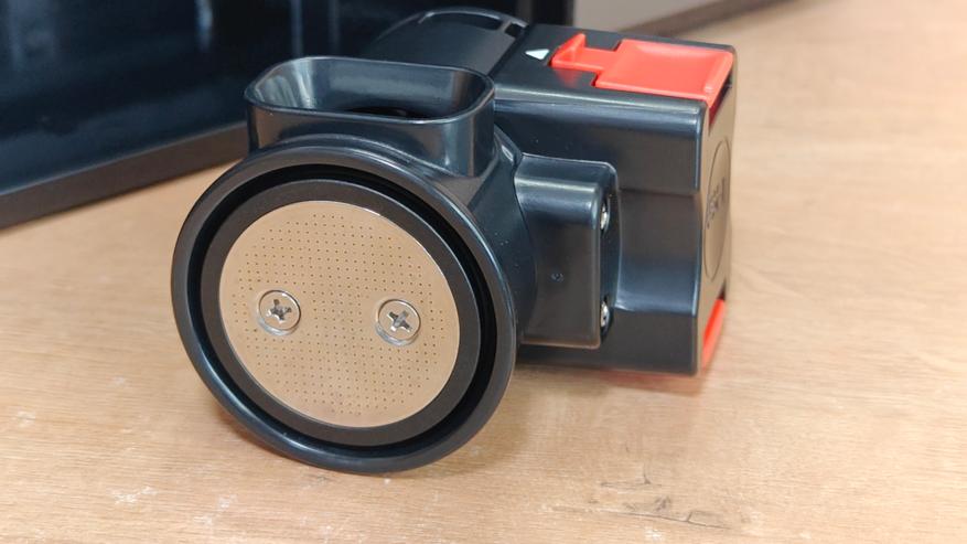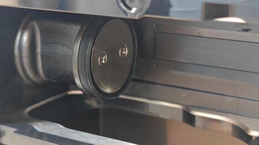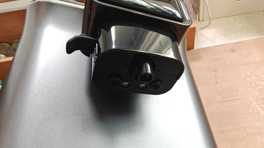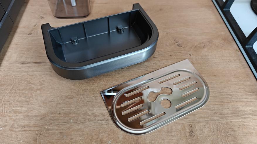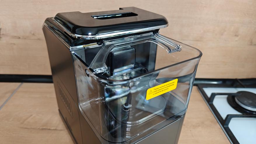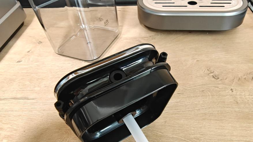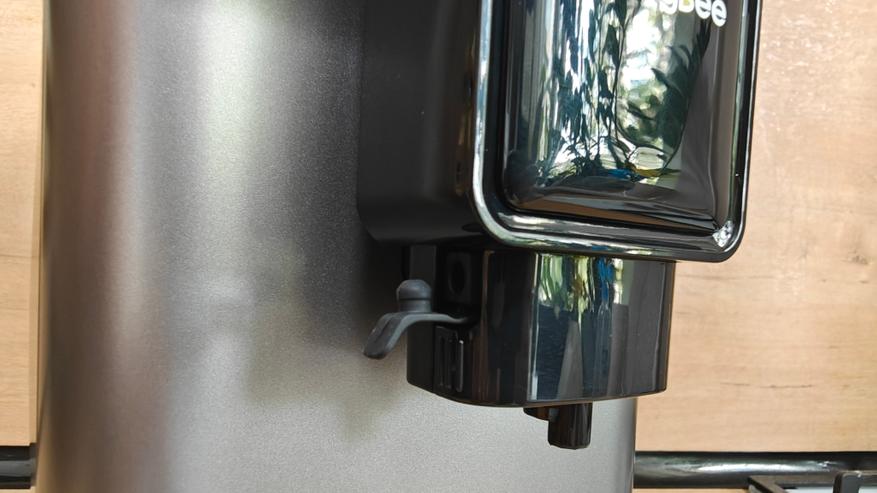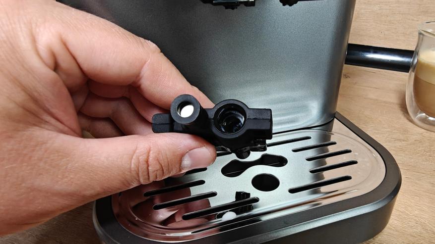 Этот блок может перемещаться вверх и вниз, чтобы настроить выдачу напитка под требуемую высоту чашки (от 85 мм до 115 мм). Нижняя часть капучинатора выделяется двумя соплами для кофе и одним соплом для молочной пены. Спереди блок взбивания пены закрывает глянцевая пластиковая крышка, которая фиксируется при помощи магнитов. Сам капучинатор вставляется и удерживается при помощи гибкости резины, из которой он сделан.