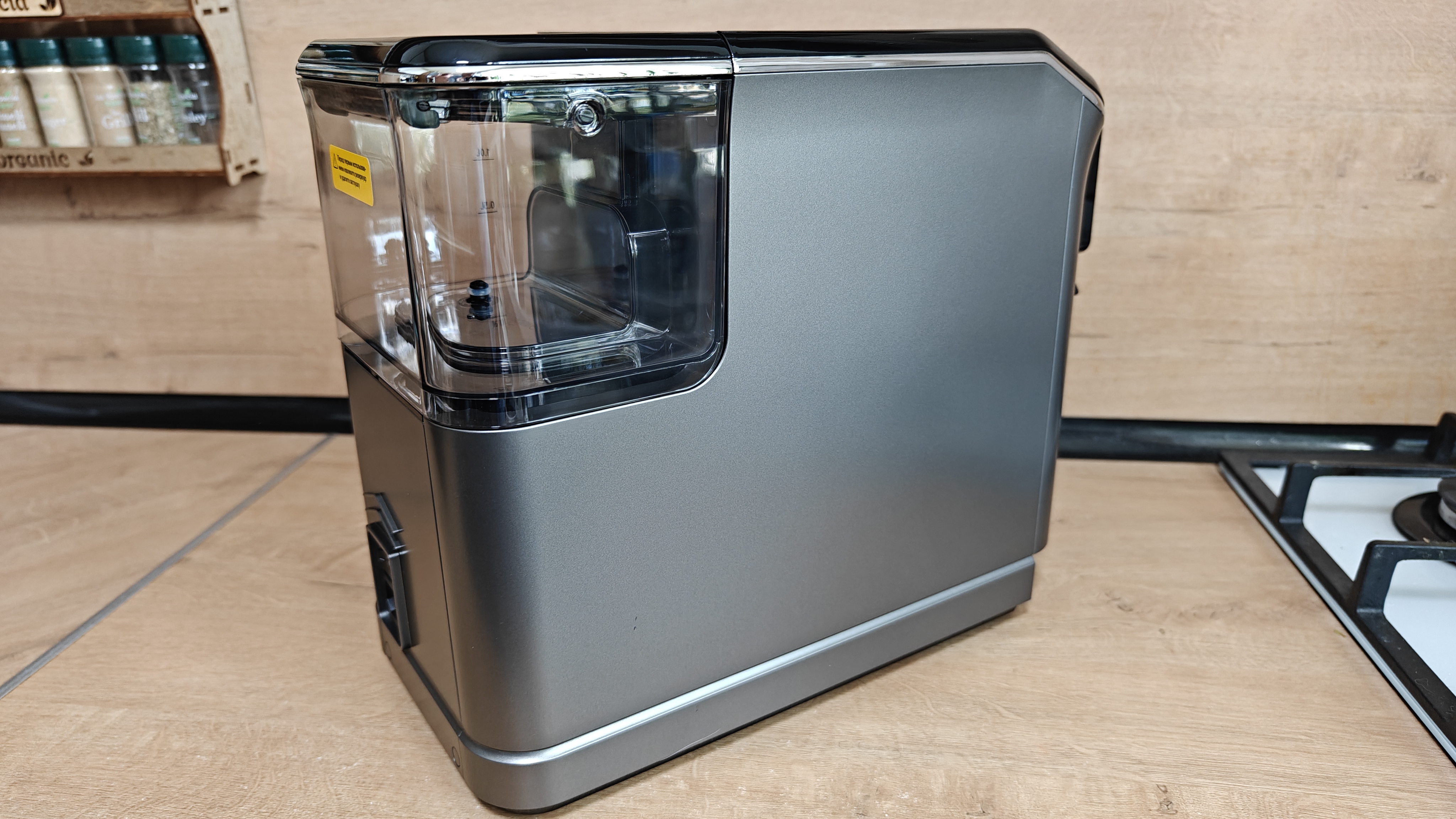Кофемашина оказалась реально компактнее всех ранее используемых мною вариантов. Это настоящее спасение для нашей маленькой кухни. Корпус представляет собой параллелепипед со скругленными углами. Весь корпус из матового серого пластика, блок управления с лицевой стороны из глянцевого черного пластика. Тут при выключенном питании не видно абсолютно ничего. В заднюю часть корпуса лаконично встраивается емкость для воды. Справа на корпусе находится отсек для выброса таблеток кофе. Слева просто ровный пластик. Задняя сторона выделяется разъемом для подключения кабеля и кнопкой выключателем.