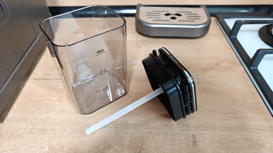 Щеточка в комплекте с длинным ворсом, чтобы можно было выметать кофейную пыль отовсюду. Внешний контейнер для молока из прозрачного пластика и плотно устанавливаемой крышкой. Крышка вставляется просто плотно, но без прокладок, трубка для забора молока опускается до самого дна. Отверстие для установки подающей молоко трубки тоже снабжено силиконовыми прокладками. Один любопытный нюанс — трубка плотно устанавливается в специальный паз в крышке для хранения.