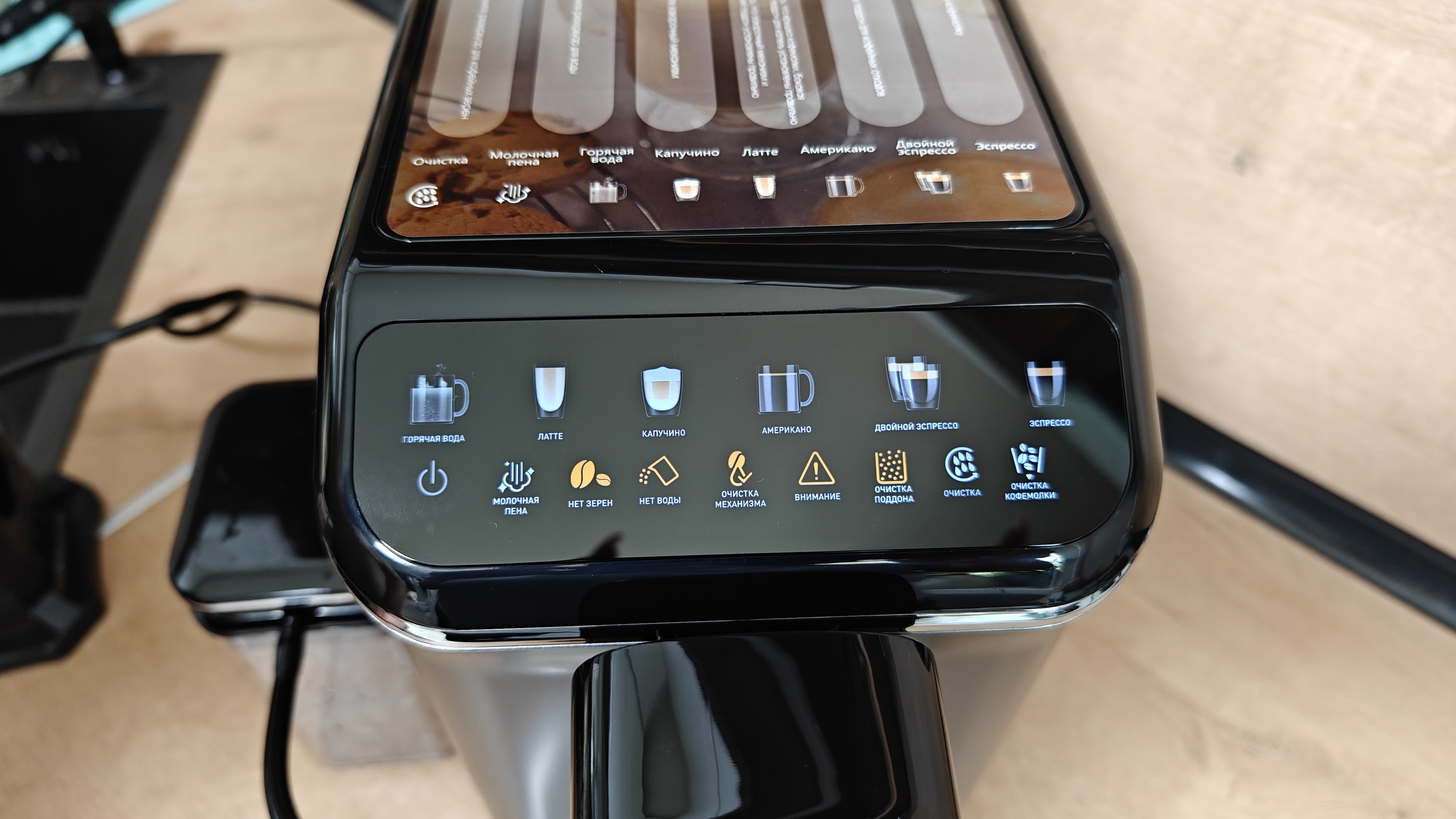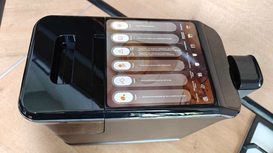 Также на экране есть специальные иконки, отображающие, когда нет зерен, нет воды, требуется очистка механизма и поддона для отработанного кофе.