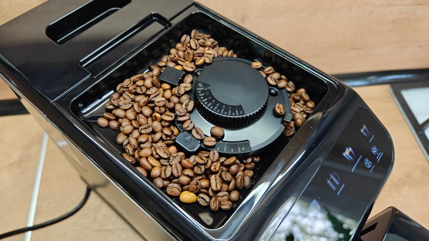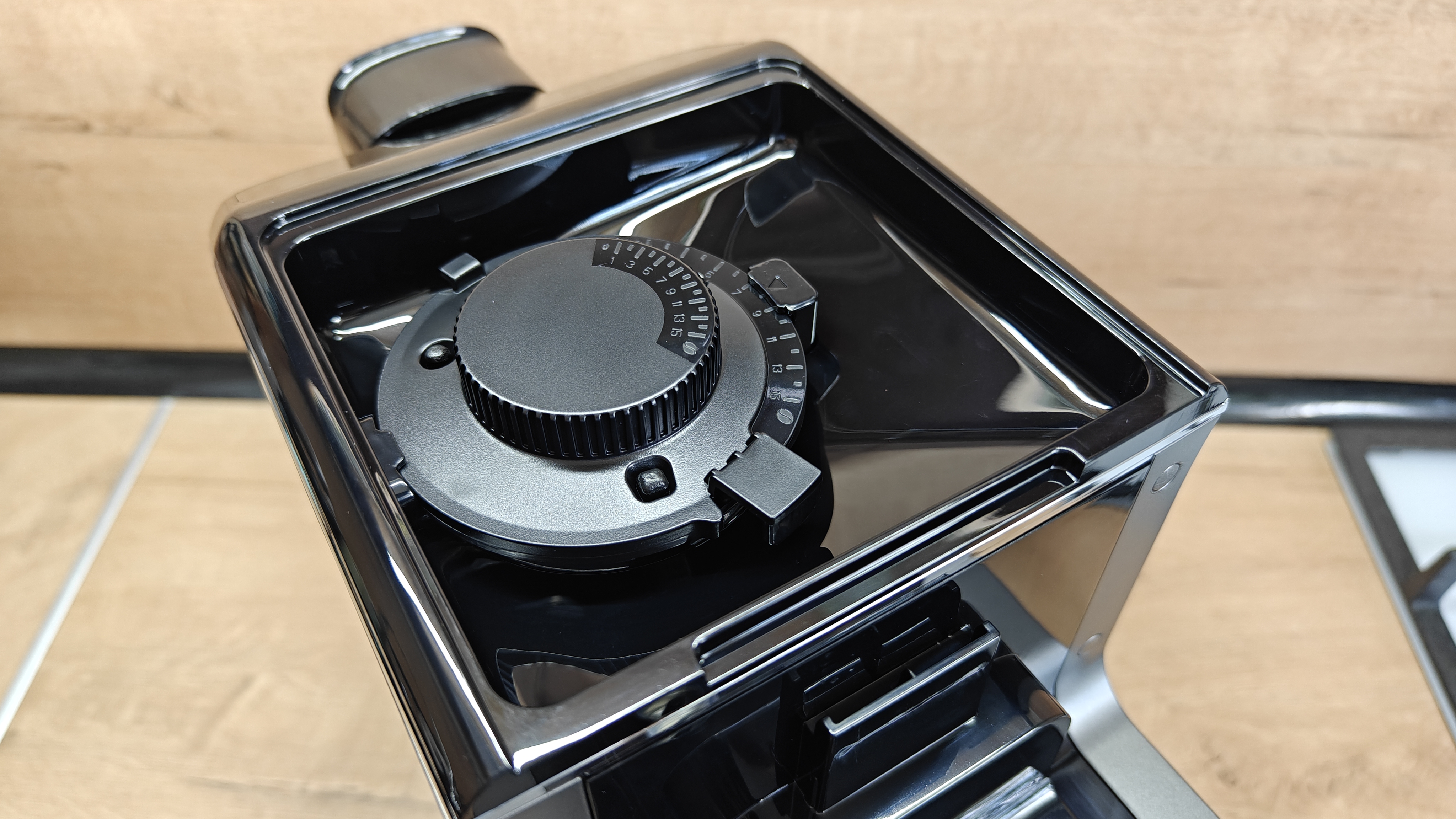 Вид сверху прост. Тут черная глянцевая крышка контейнера для воды и крышка отсека для засыпания зерен кофе. Крышка кофемолки закрывается плотно через силиконовые прокладки, на верхней ее стороне напечатана цветная расшифровка элементов управления. Спасибо за такую шпаргалку производителю, не надо каждый раз лезть в инструкцию. Открываем крышку. Под ней отсек для засыпания зерен кофе и шайба настройки степени помола. Тут имеется 15 степеней помола и каждый сможет подобрать под себя вкус получаемого напитка.