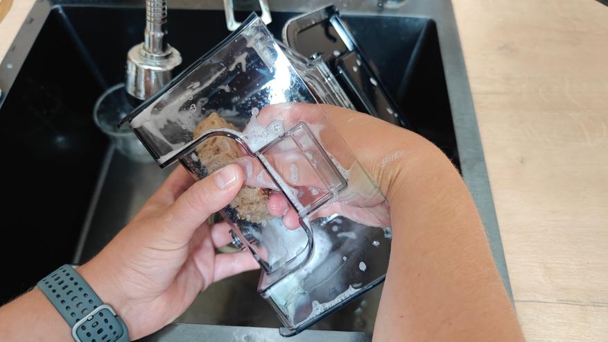 Богатый опыт использования разнообразных кофемашин подсказывает, что удобные для промывки емкости — это половина успеха. К примеру, на моих предыдущих кофемашинах отсек для воды вообще довольно трудно очищать. Тут же просто моем как любую посуду губкой, нет узких полостей и труднодоступных мест. Все предупреждающие наклейки также снимаются без следов клея, которые сложно отмыть.