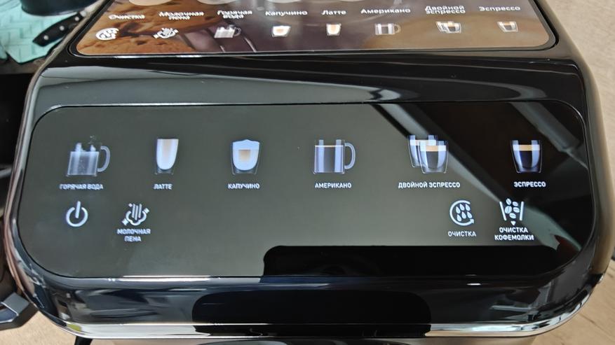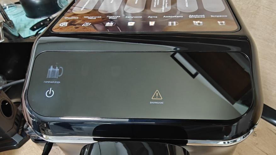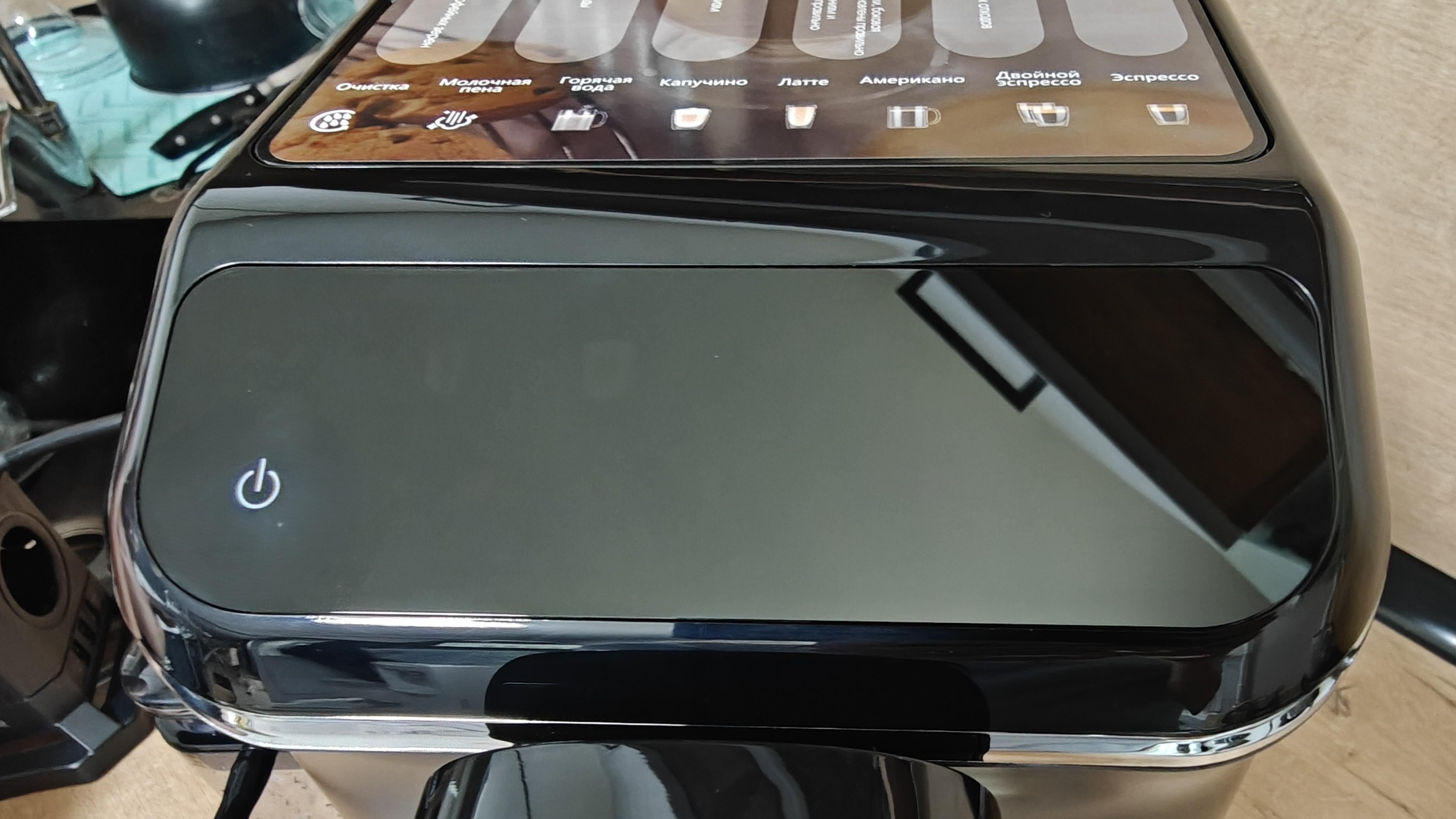 Включаю кофемашину и до конца не понимаю, что делать дальше. Тут сенсорная кнопка включения никак о себе не информирует. Надо просто запомнить где она находится и нажать в это место, и чудеса — появляется изображение кнопки. Все статусы работы отображаются на дисплее. Те опции, которые в данный момент недоступны, например, когда еще не набрано давление в капучинатор, не будут активны (кнопки мигают). Управление простое, с сенсорными кнопками. Кофемашина умеет приготовить: