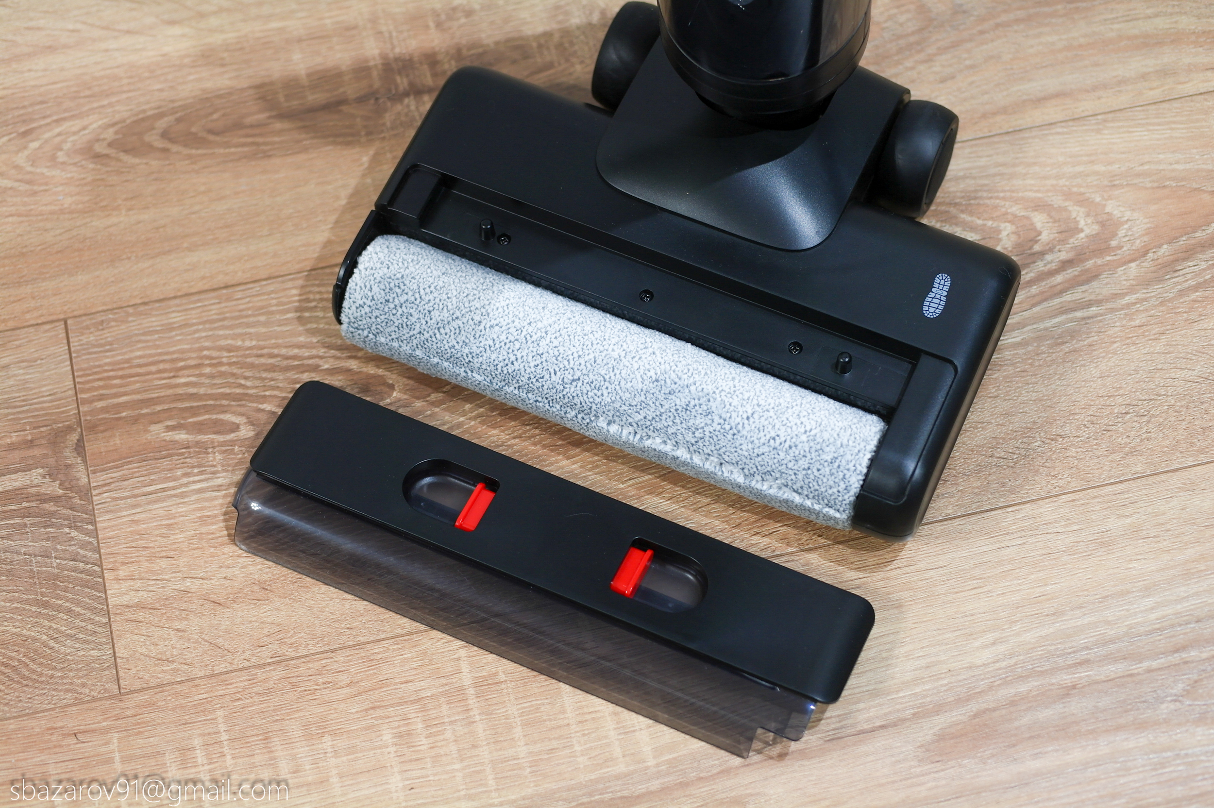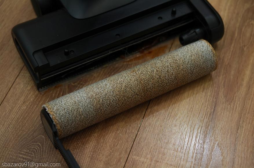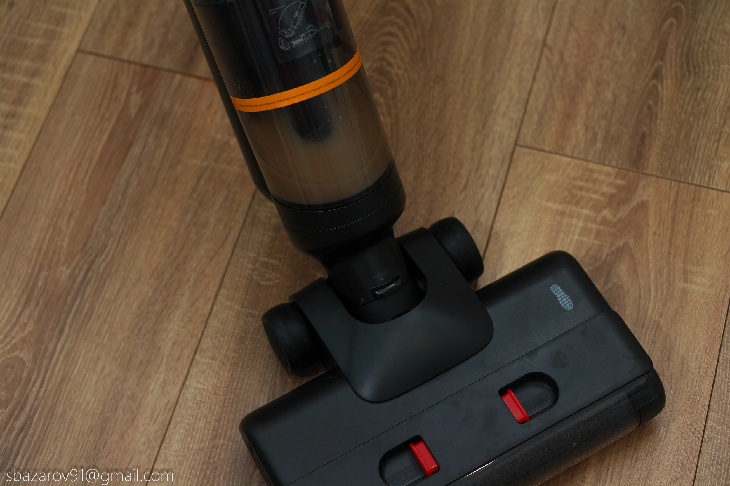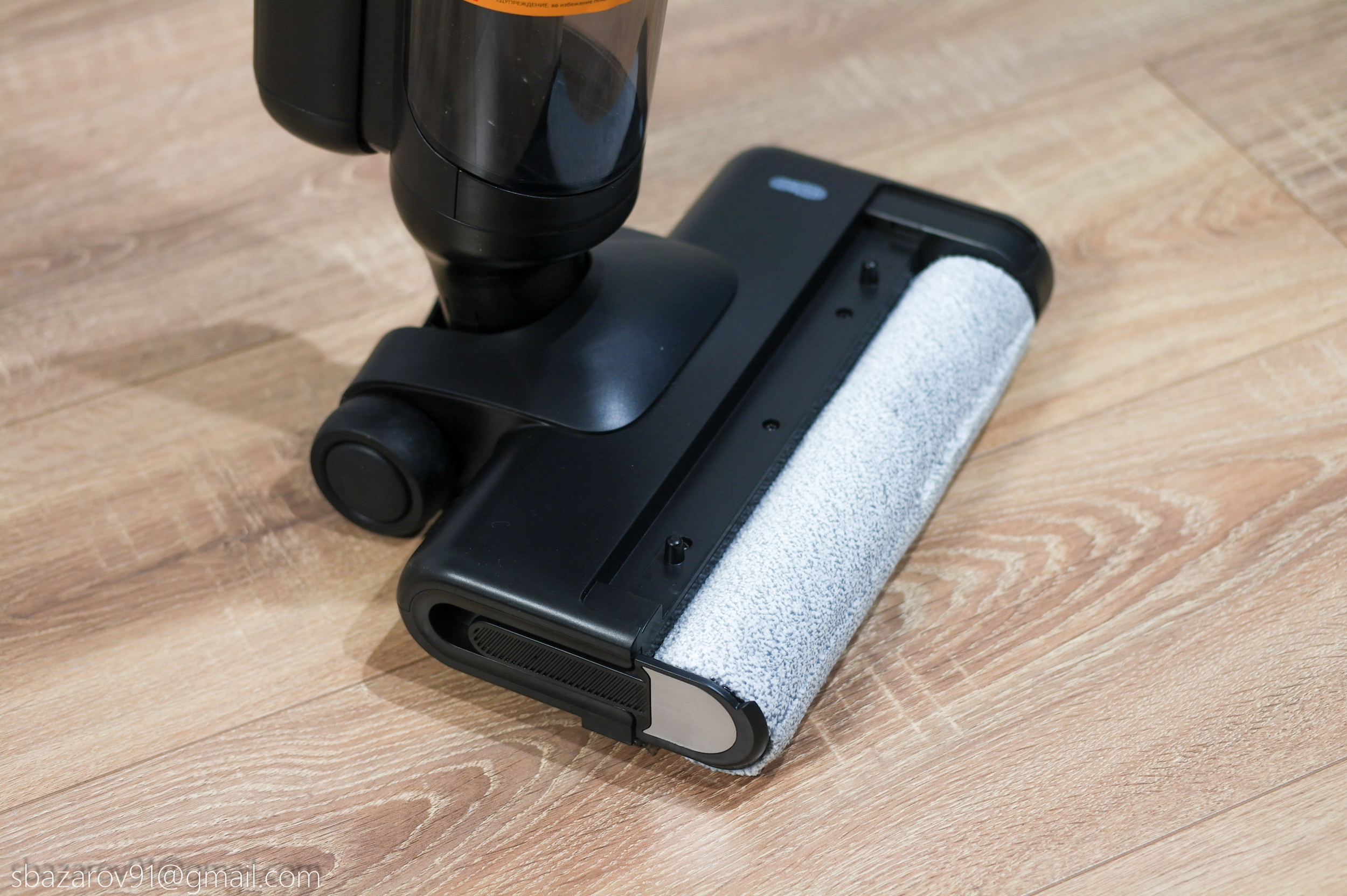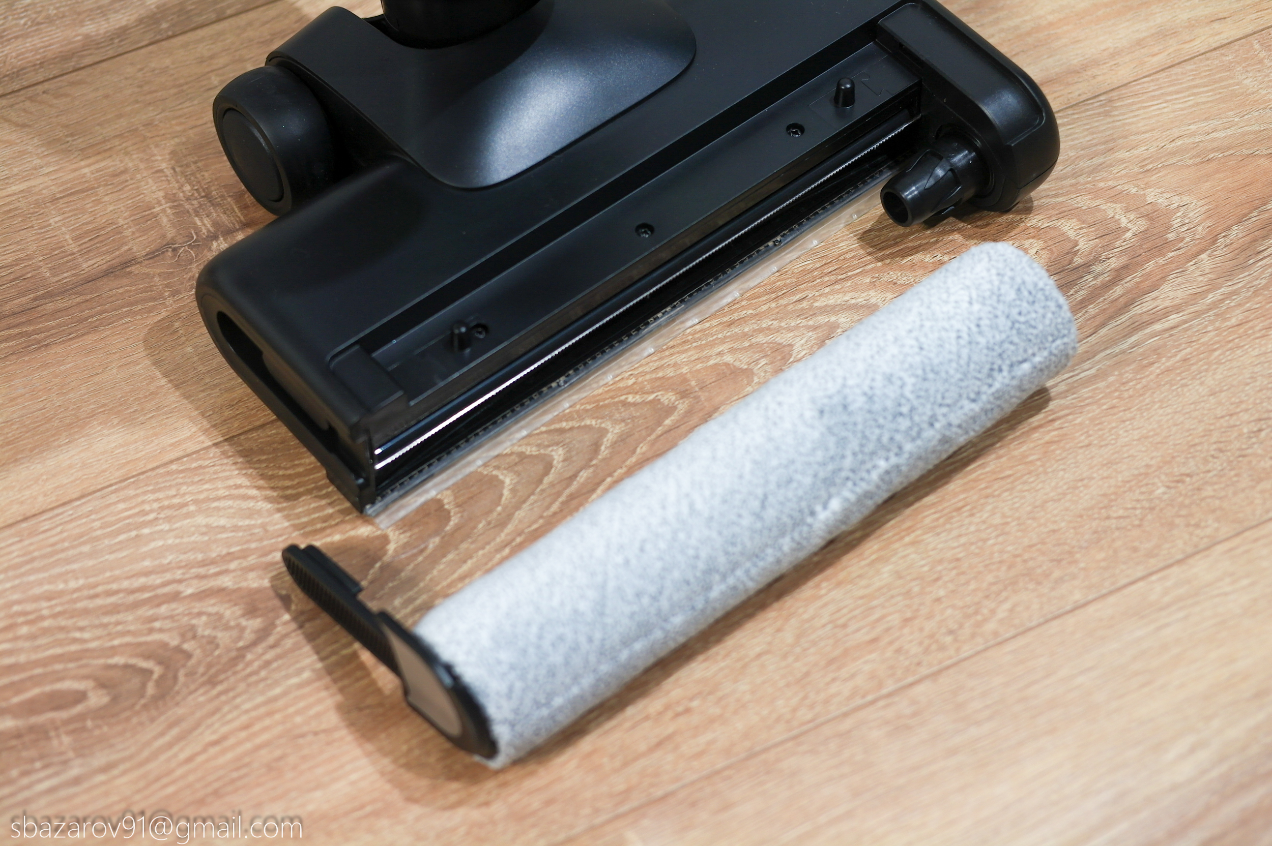 В нижней части блока располагается подвижная щетка с мягким валиком. Если вы ещё не знакомы с моющими пылесосами, стоит отметить, что их основная задача — комбинировать функции сухой и влажной уборки. Вращающийся моющий валик одновременно всасывает мусор, волосы и жидкости, а умная система автоматически увеличивает мощность в зависимости от загрязнений или типа поверхности.