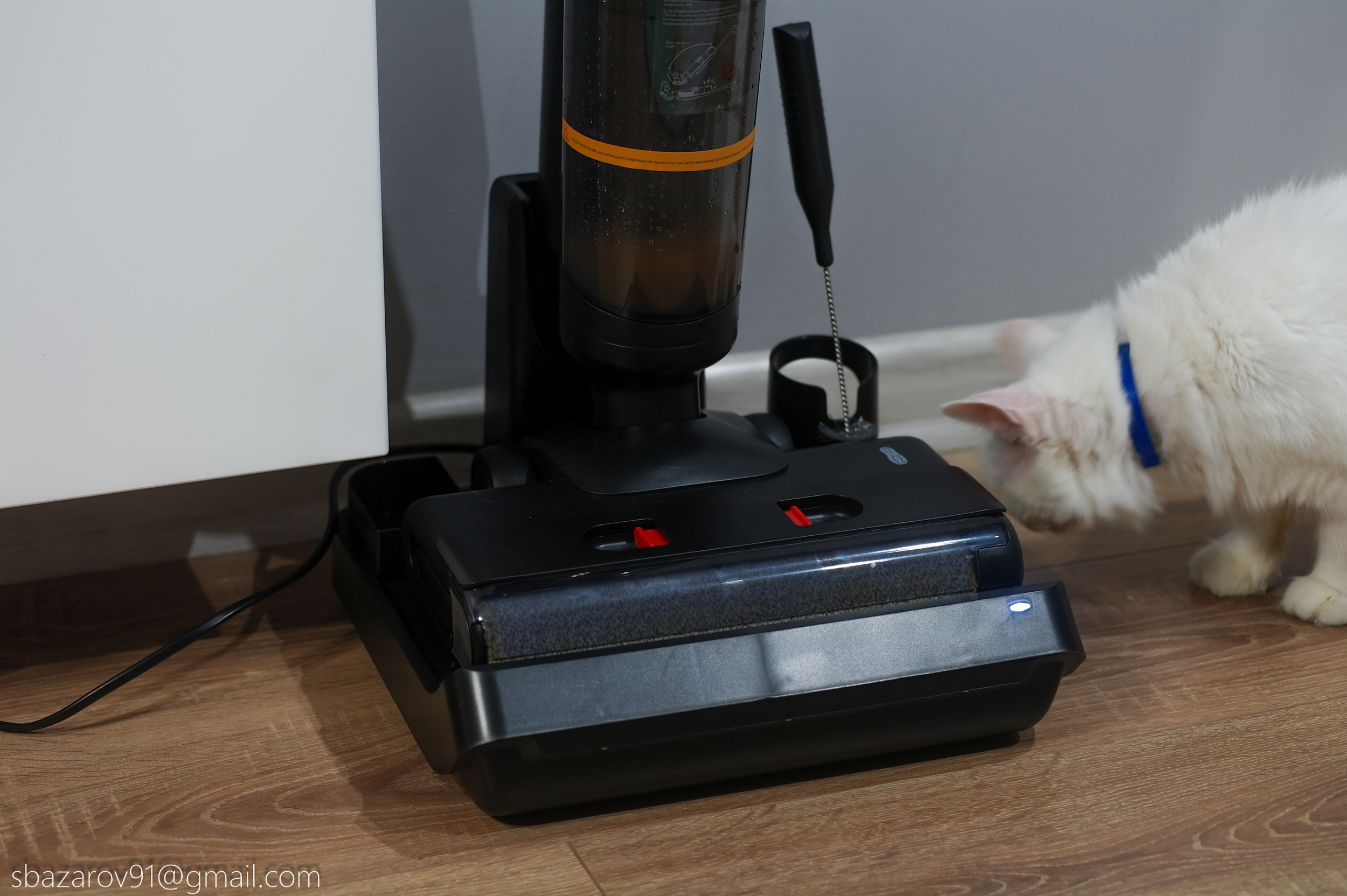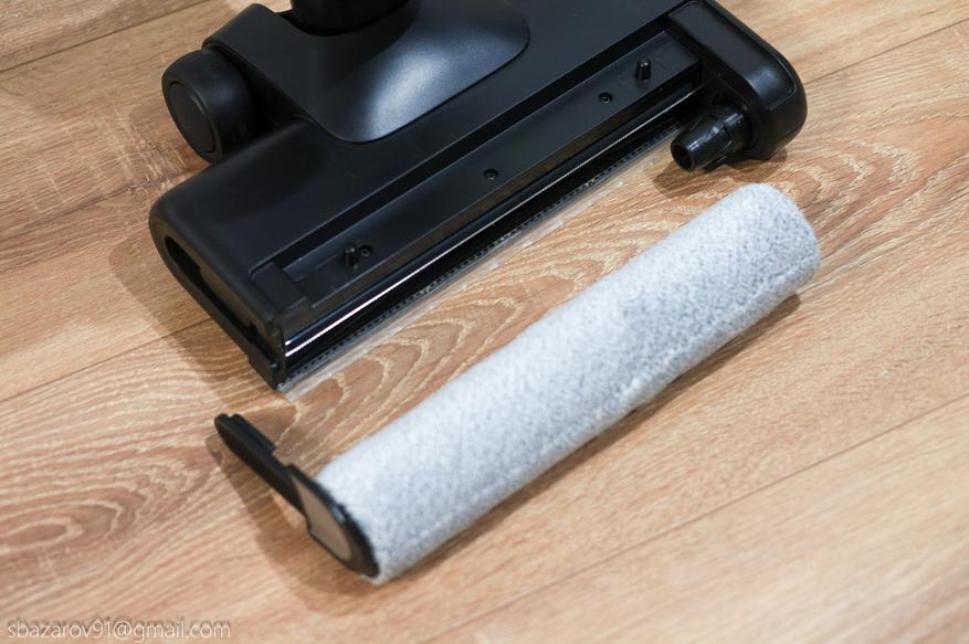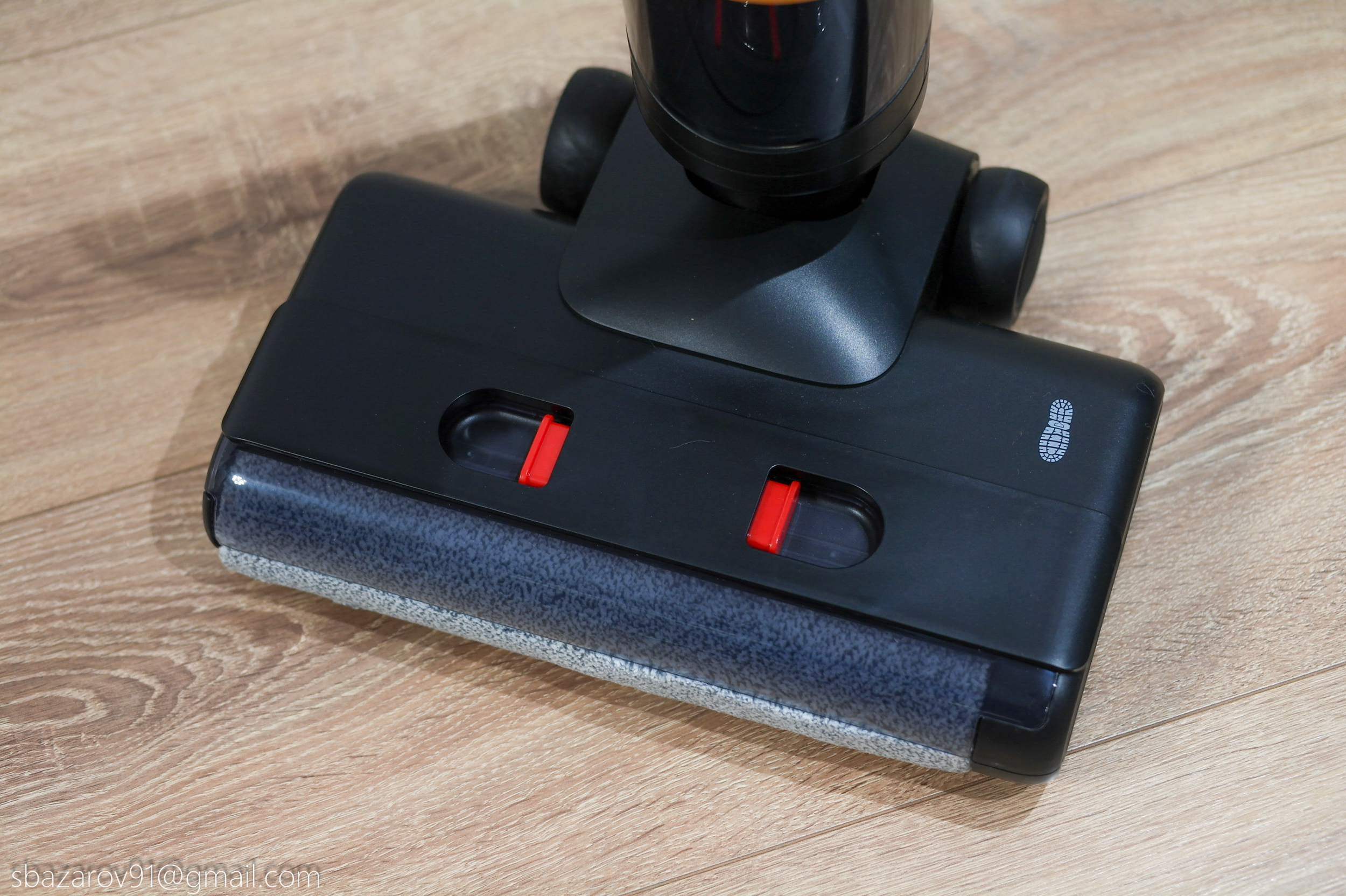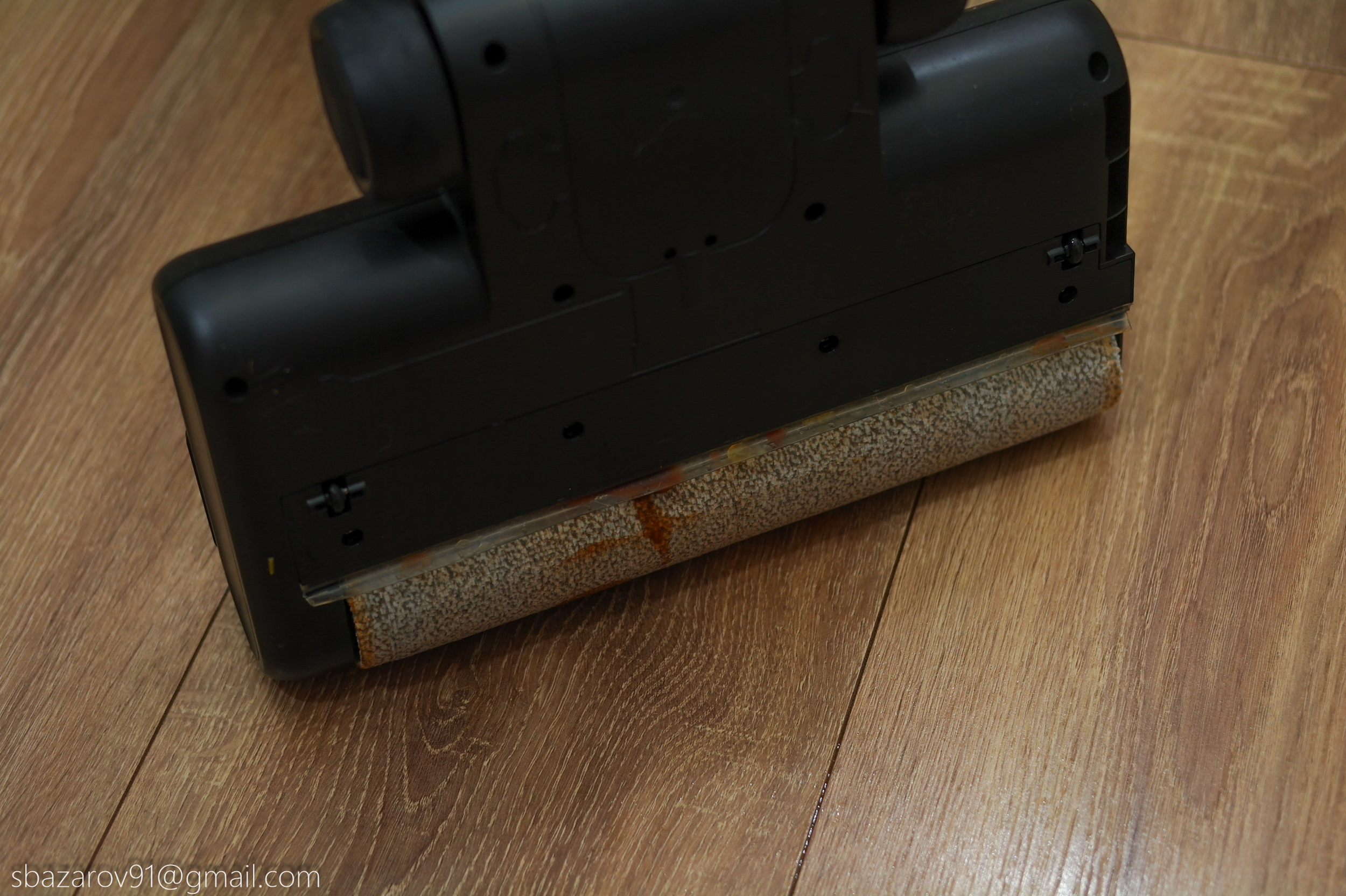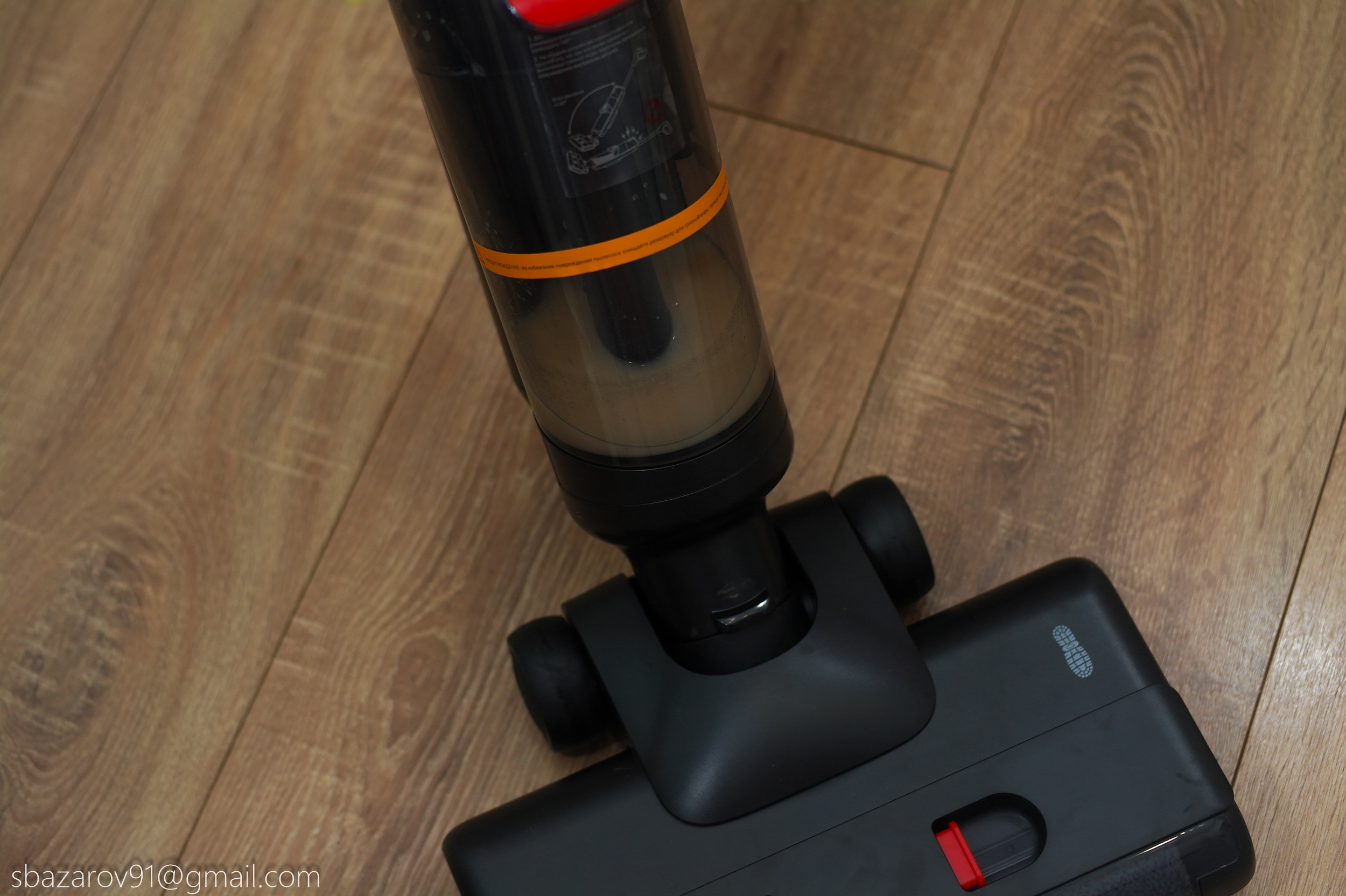В нижней части блока располагается подвижная щетка с мягким валиком. Если вы ещё не знакомы с моющими пылесосами, стоит отметить, что их основная задача — комбинировать функции сухой и влажной уборки. Вращающийся моющий валик одновременно всасывает мусор, волосы и жидкости, а умная система автоматически увеличивает мощность в зависимости от загрязнений или типа поверхности.