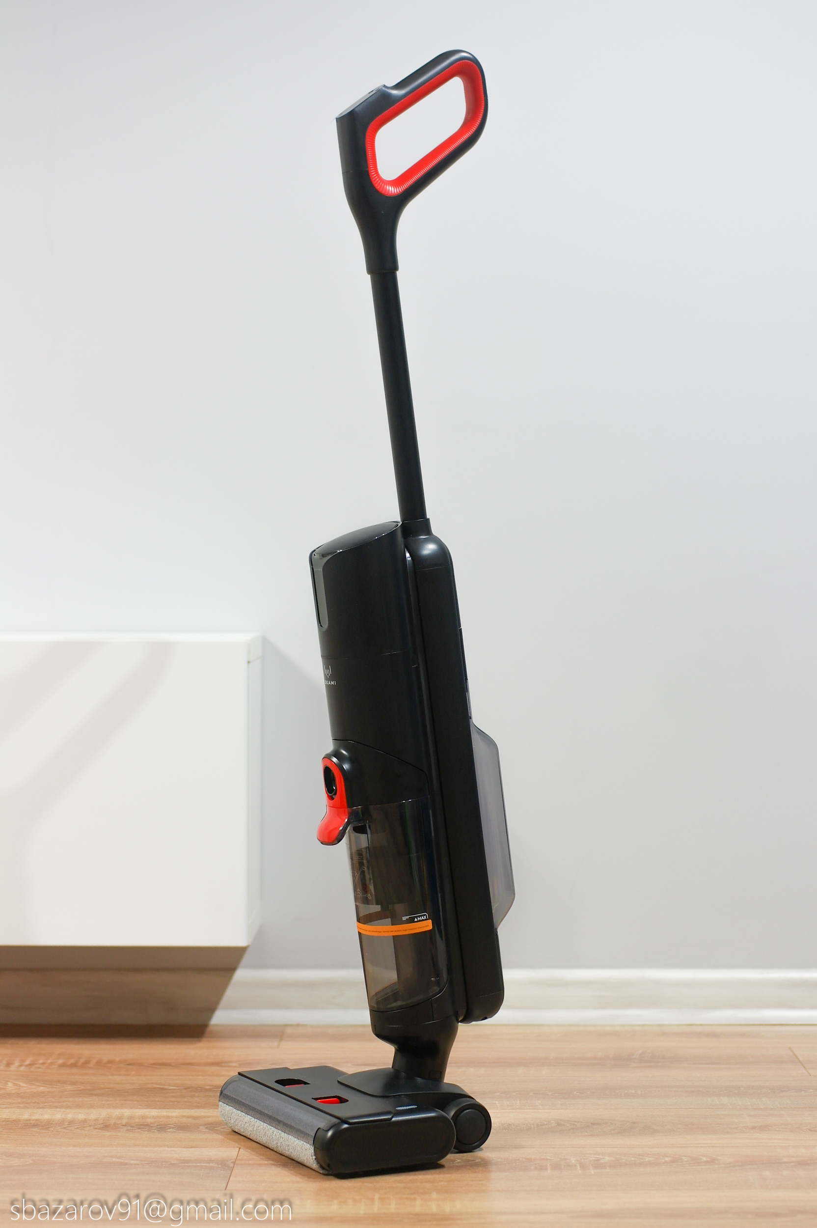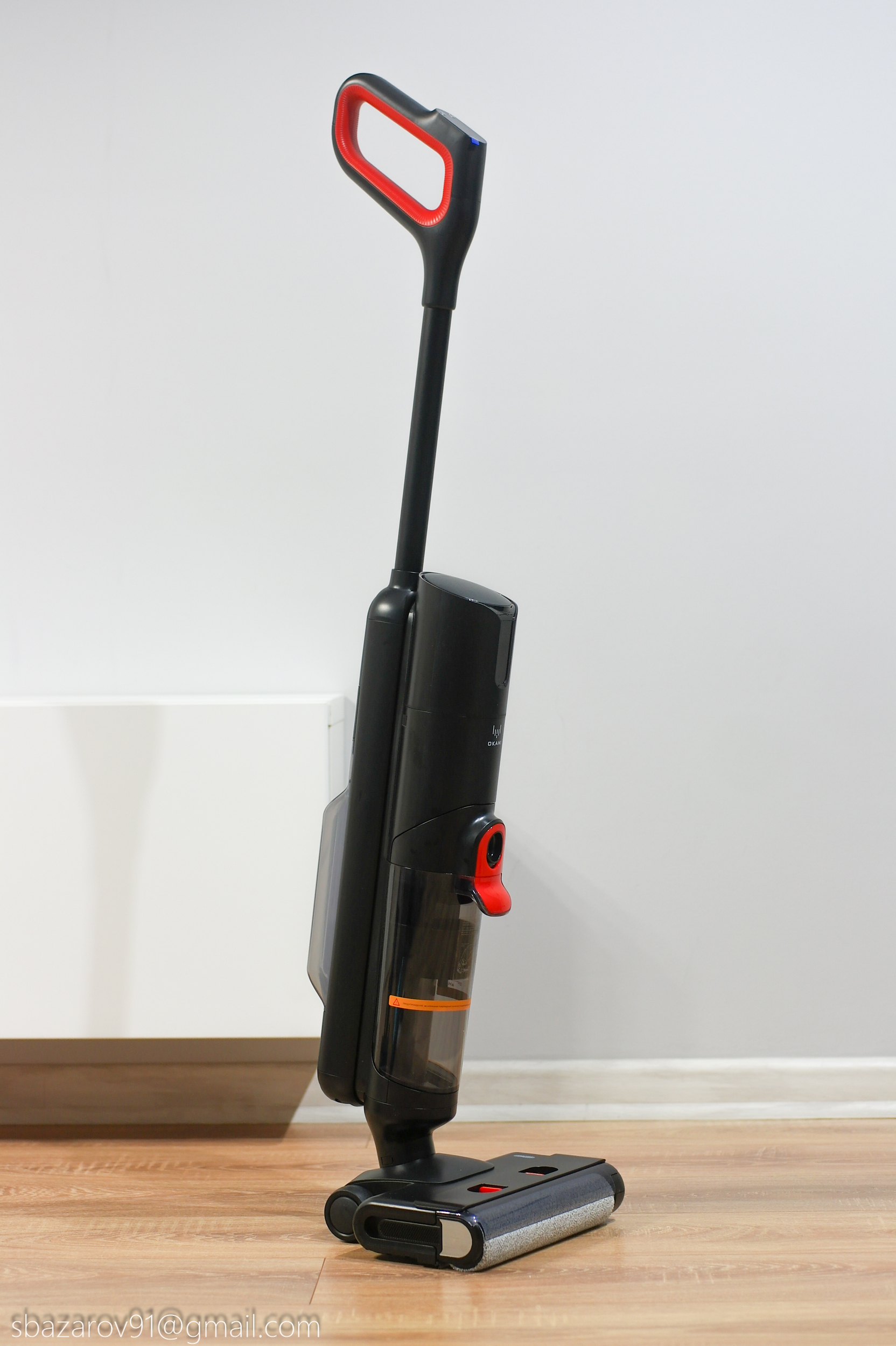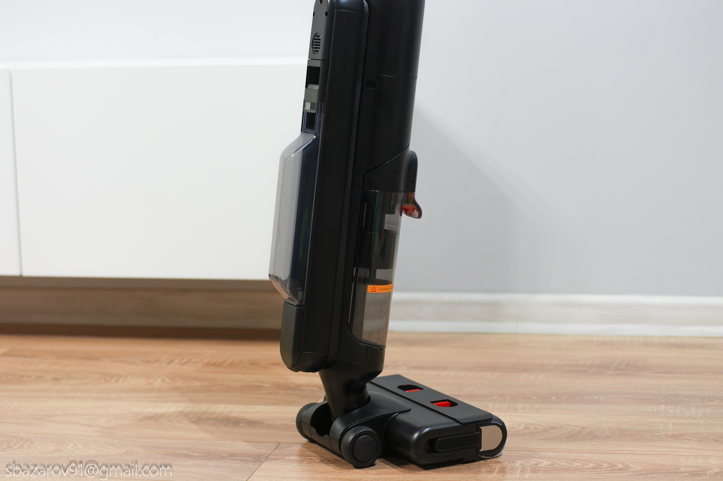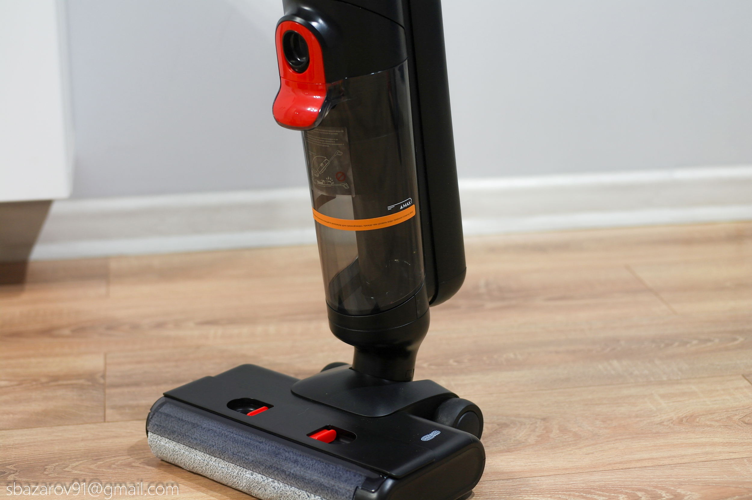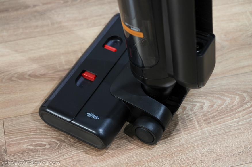 Полностью собранный пылесос выглядит стильно, а красные вставки добавляют ему выразительности. Кроме того, он способен самостоятельно стоять в вертикальном положении — для начала уборки достаточно нажать на площадку с валиком, и механизм наклона разблокируется. Максимальный угол наклона составляет 140 градусов, однако слишком сильный наклон может привести к переливу резервуара с грязной водой. Не смотря на немалый вес пылесоса, управлять им довольно удобно за счет привода на колесах, которые самостоятельно его толкают. Вам, как оператору, достаточно придерживать пылесос и задавать направление его движения.