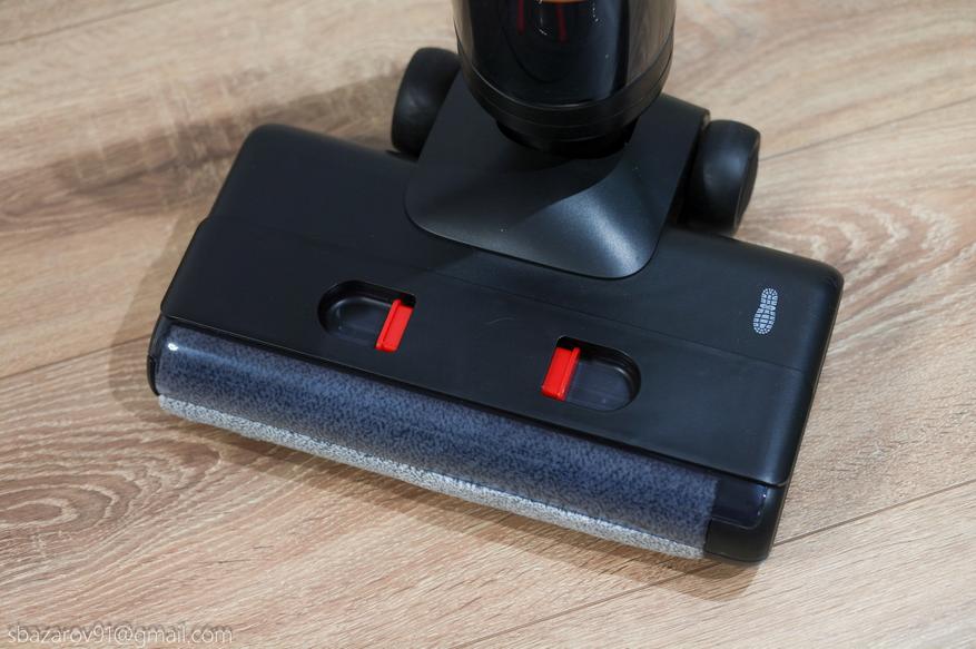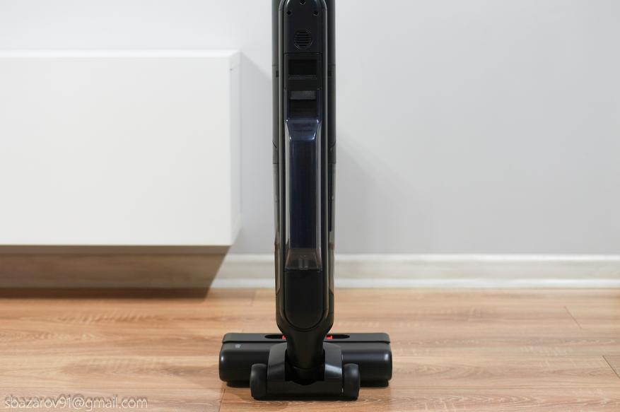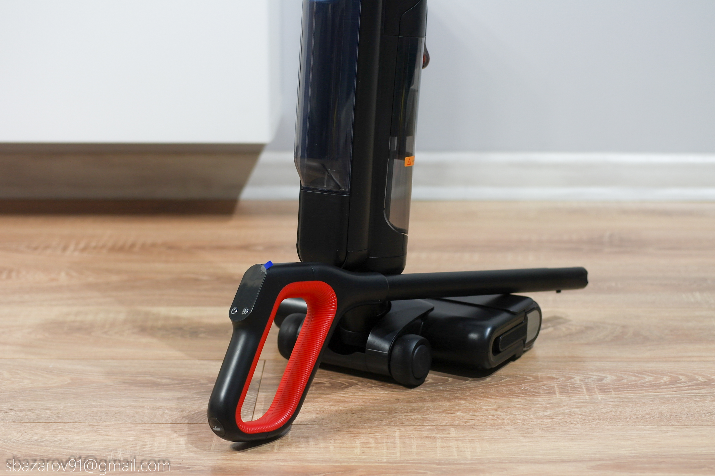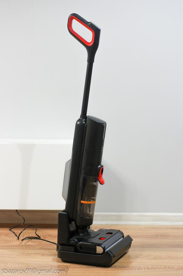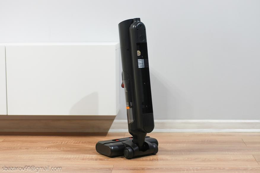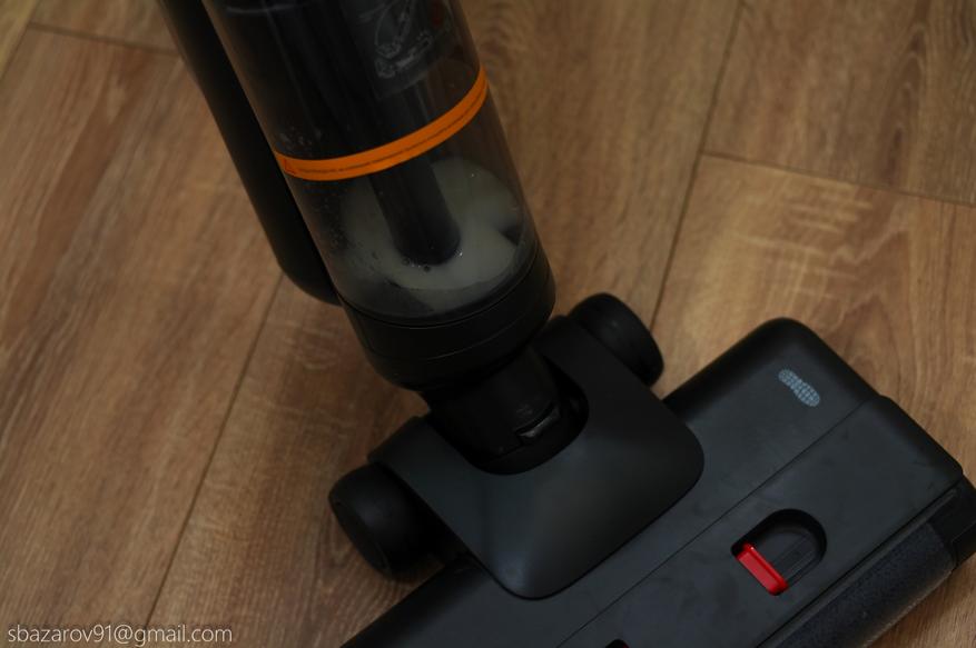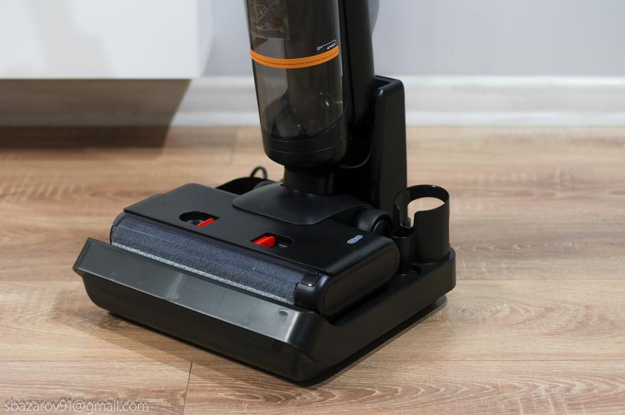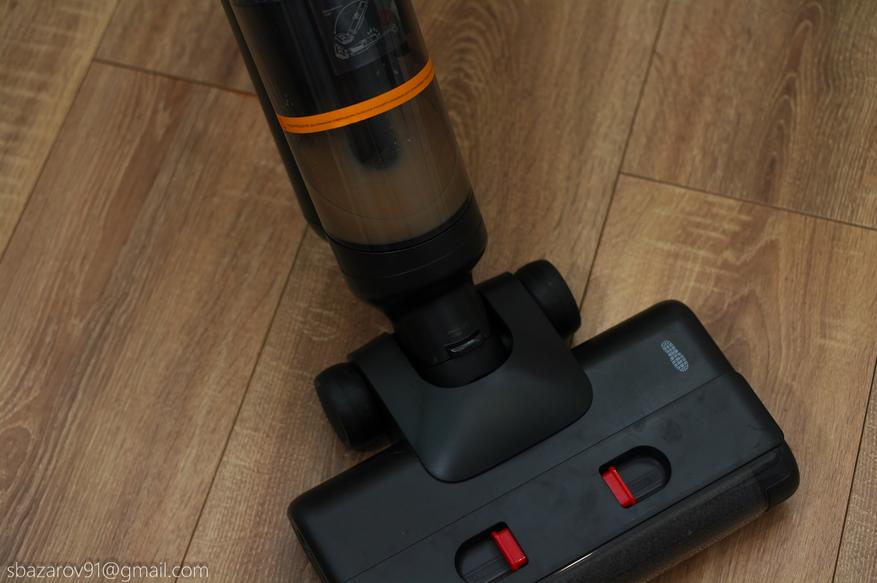 Полностью собранный пылесос выглядит стильно, а красные вставки добавляют ему выразительности. Кроме того, он способен самостоятельно стоять в вертикальном положении — для начала уборки достаточно нажать на площадку с валиком, и механизм наклона разблокируется. Максимальный угол наклона составляет 140 градусов, однако слишком сильный наклон может привести к переливу резервуара с грязной водой. Не смотря на немалый вес пылесоса, управлять им довольно удобно за счет привода на колесах, которые самостоятельно его толкают. Вам, как оператору, достаточно придерживать пылесос и задавать направление его движения.
