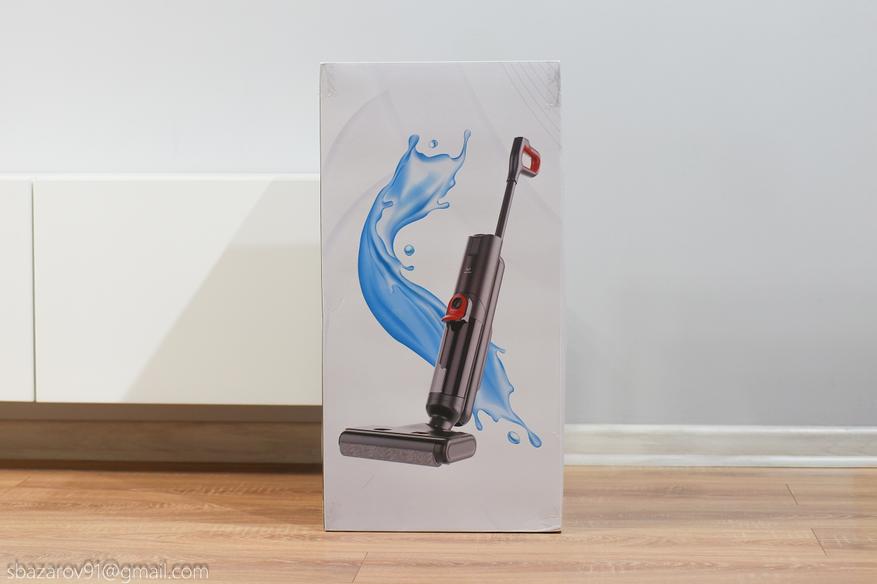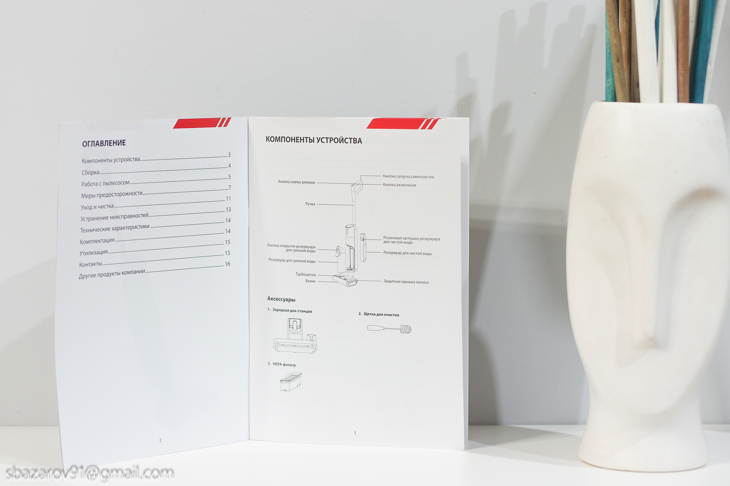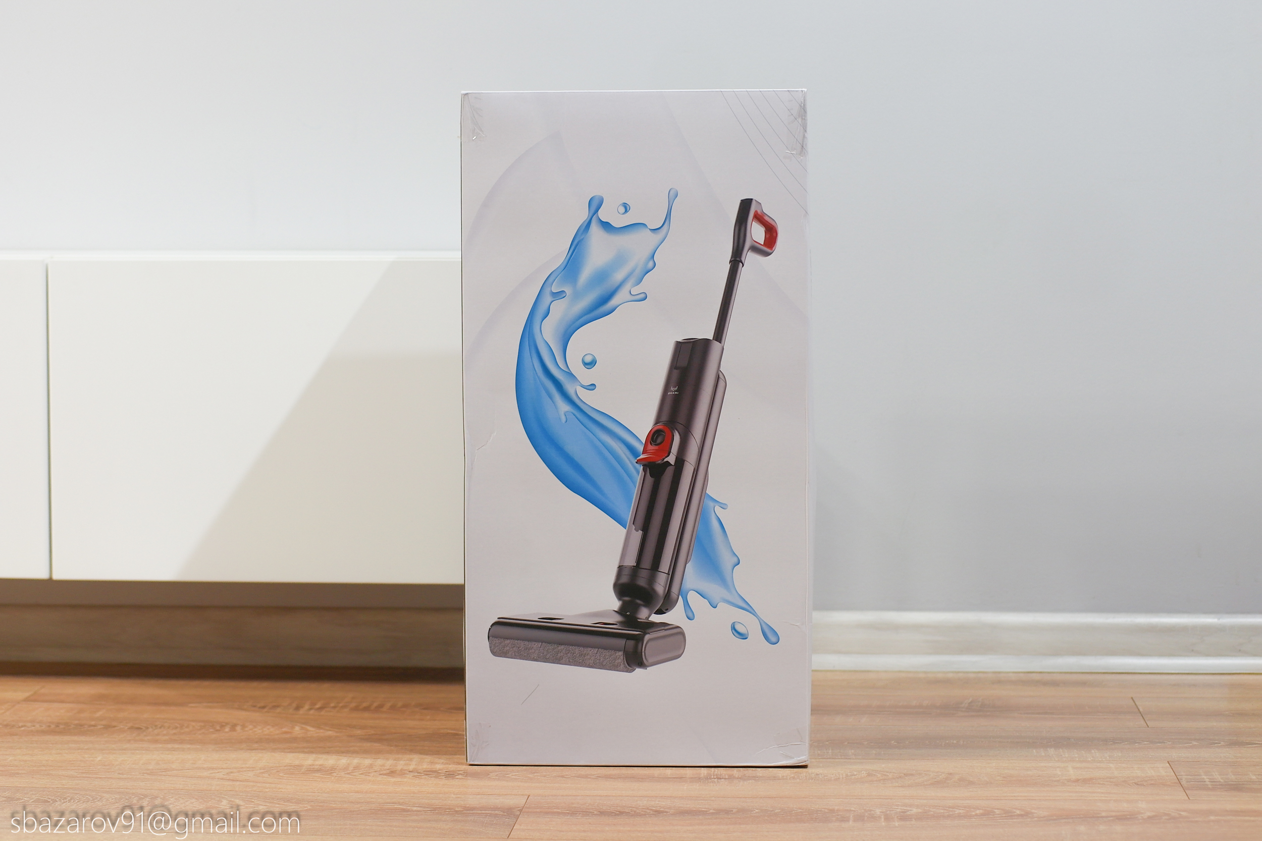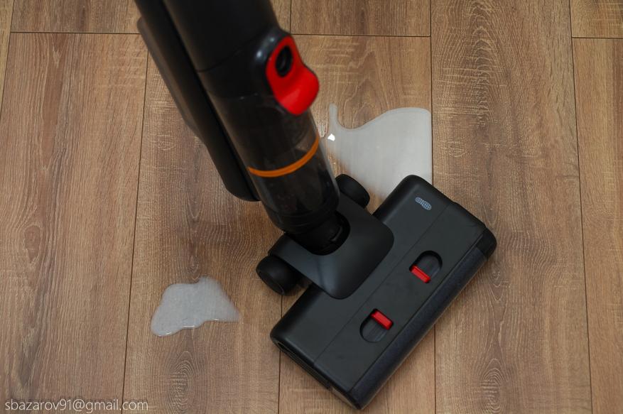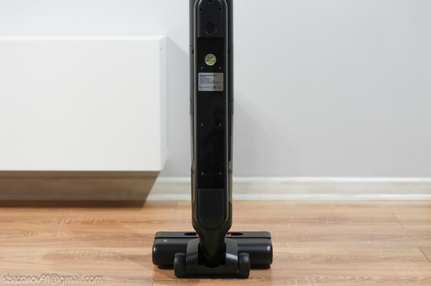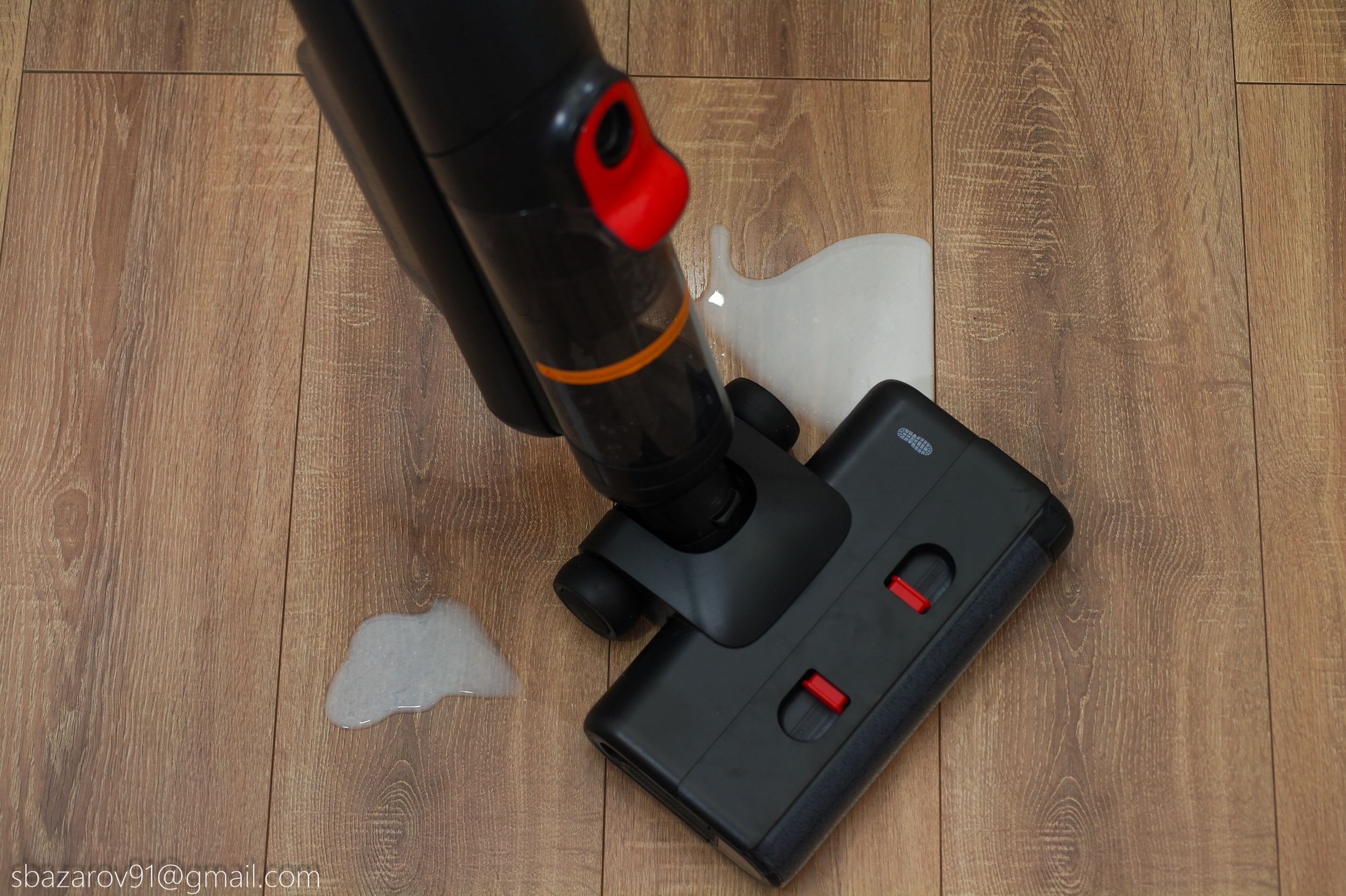 Полностью собранный пылесос выглядит стильно, а красные вставки добавляют ему выразительности. Кроме того, он способен самостоятельно стоять в вертикальном положении — для начала уборки достаточно нажать на площадку с валиком, и механизм наклона разблокируется. Максимальный угол наклона составляет 140 градусов, однако слишком сильный наклон может привести к переливу резервуара с грязной водой. Не смотря на немалый вес пылесоса, управлять им довольно удобно за счет привода на колесах, которые самостоятельно его толкают. Вам, как оператору, достаточно придерживать пылесос и задавать направление его движения.