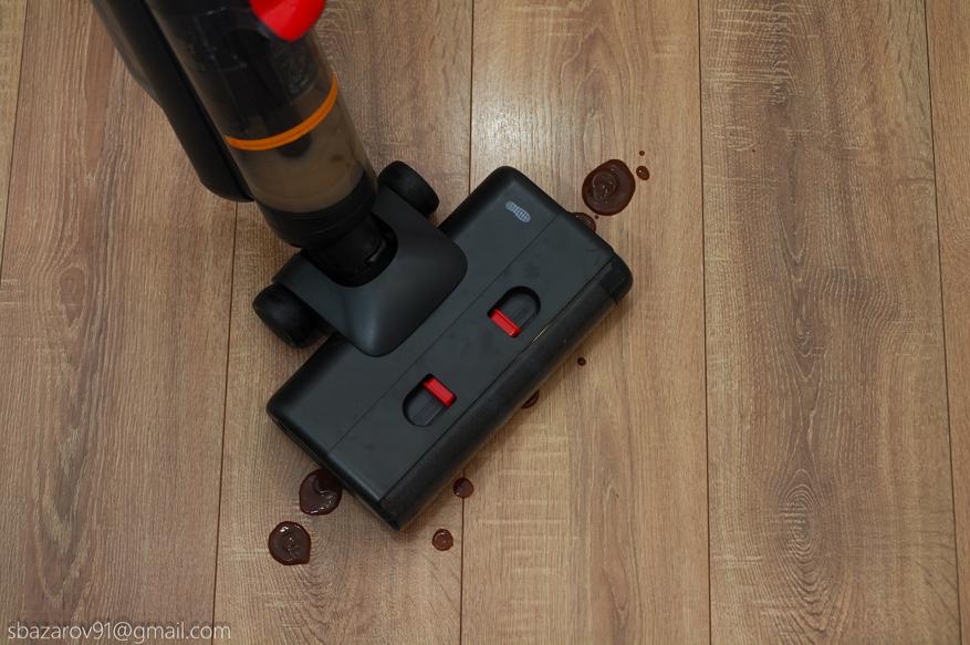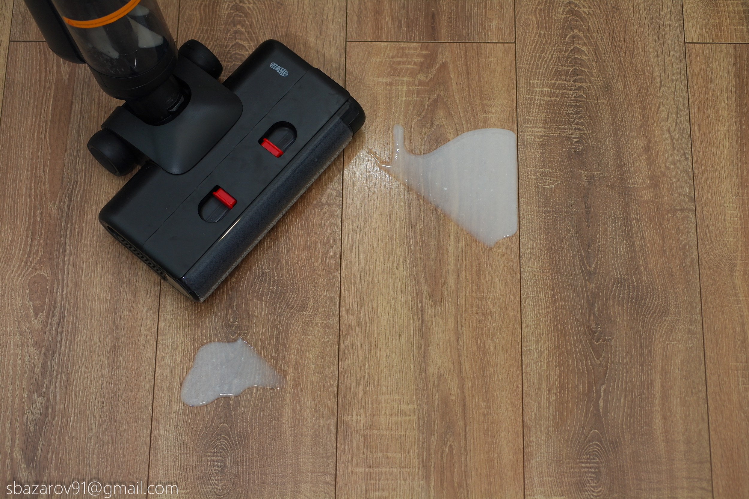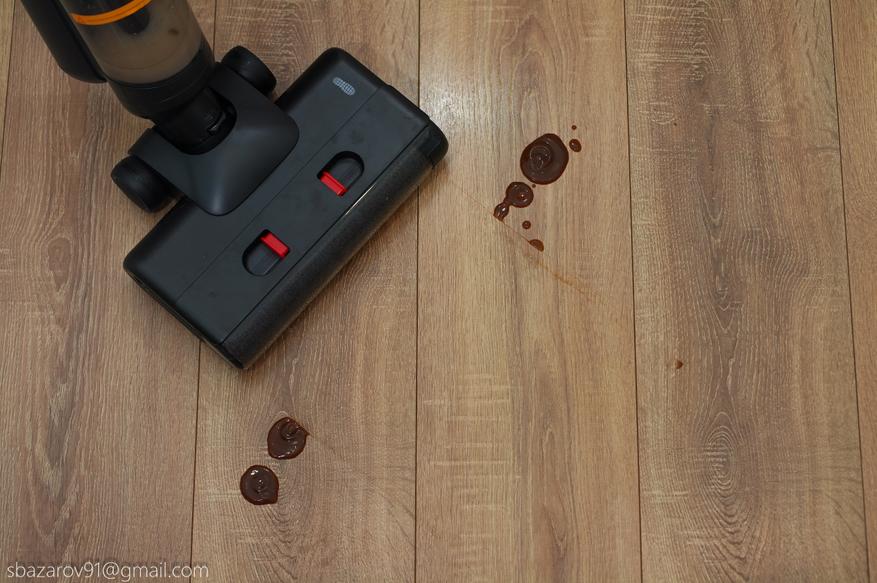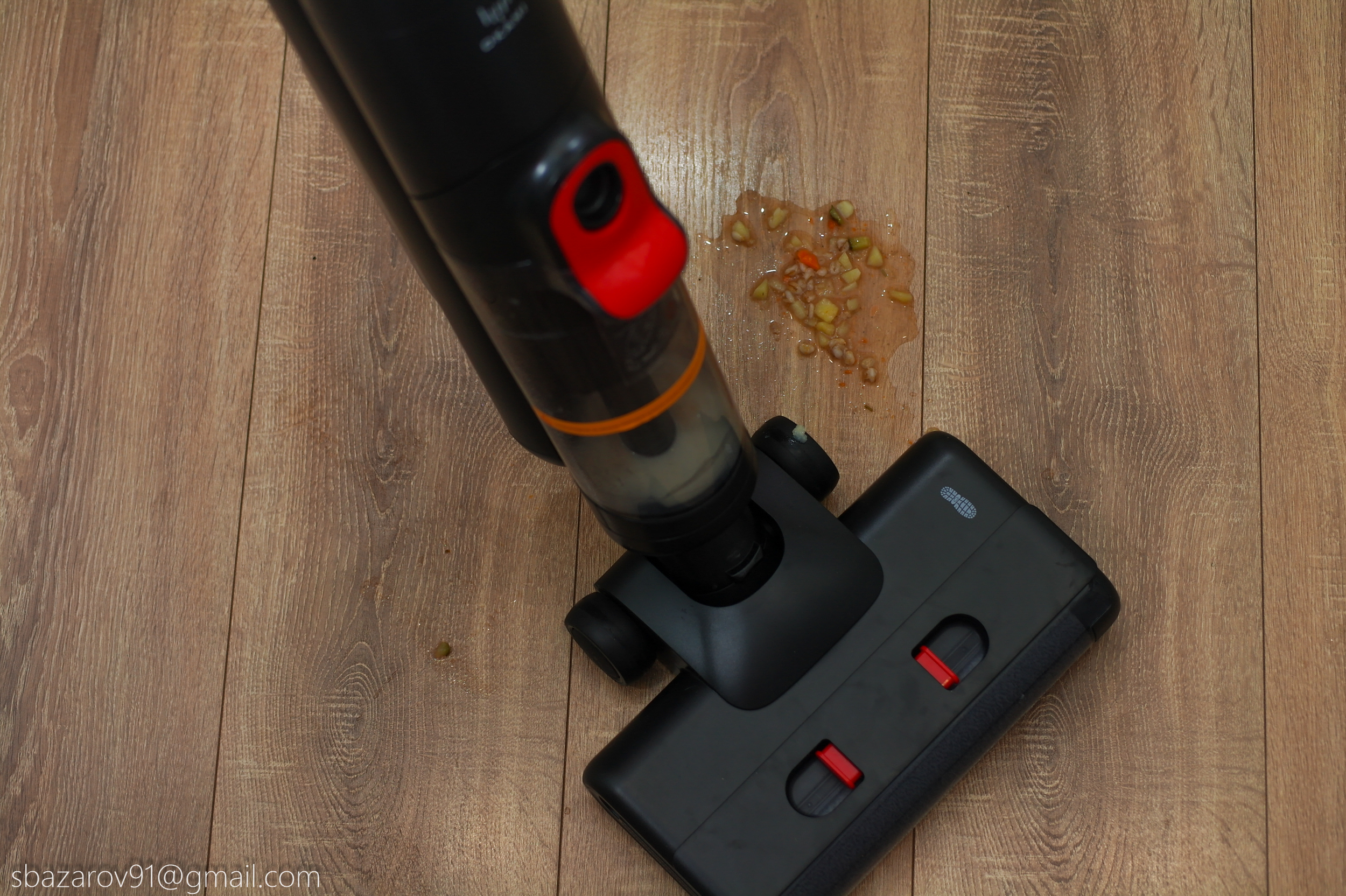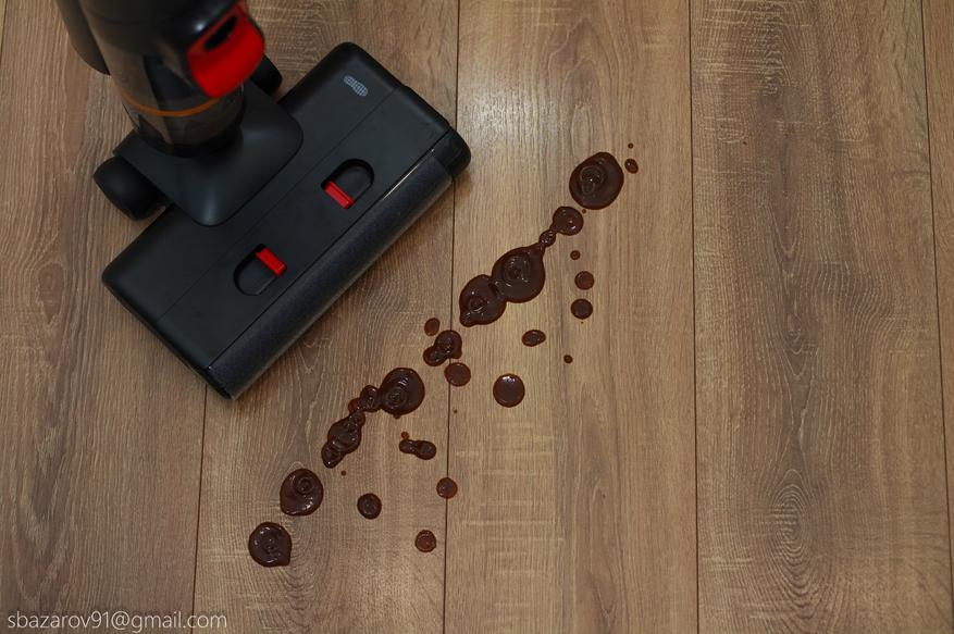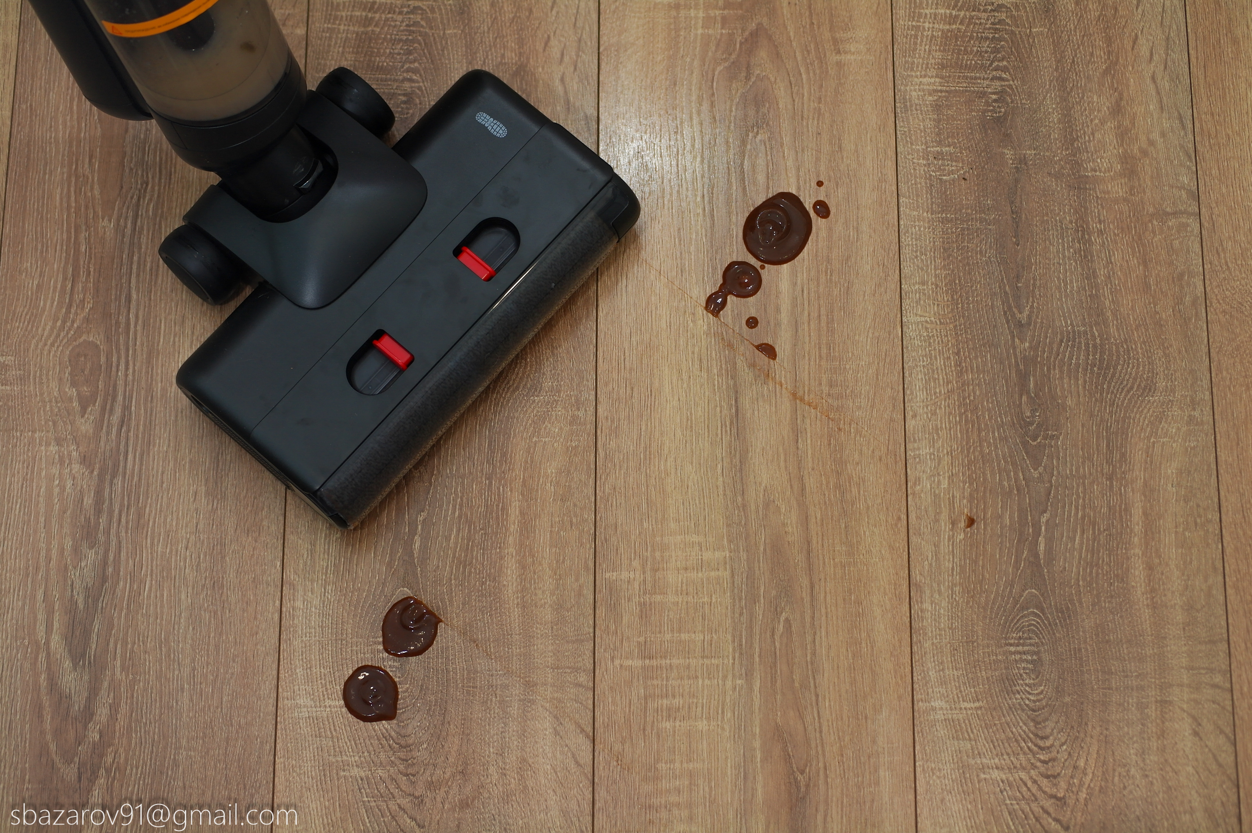 Если предыдущие тесты не составили трудностей для пылесоса OKAMI M410, то может разлитая детская пюрешка или разнообразные соусы, смогут создать проблем? Все-таки консистенция у таких продуктов иная и отличается от классических жидкостей. Но не смотря на это, пылесос с легкостью собрал весь соус с ламината и вымыл за собой пол.