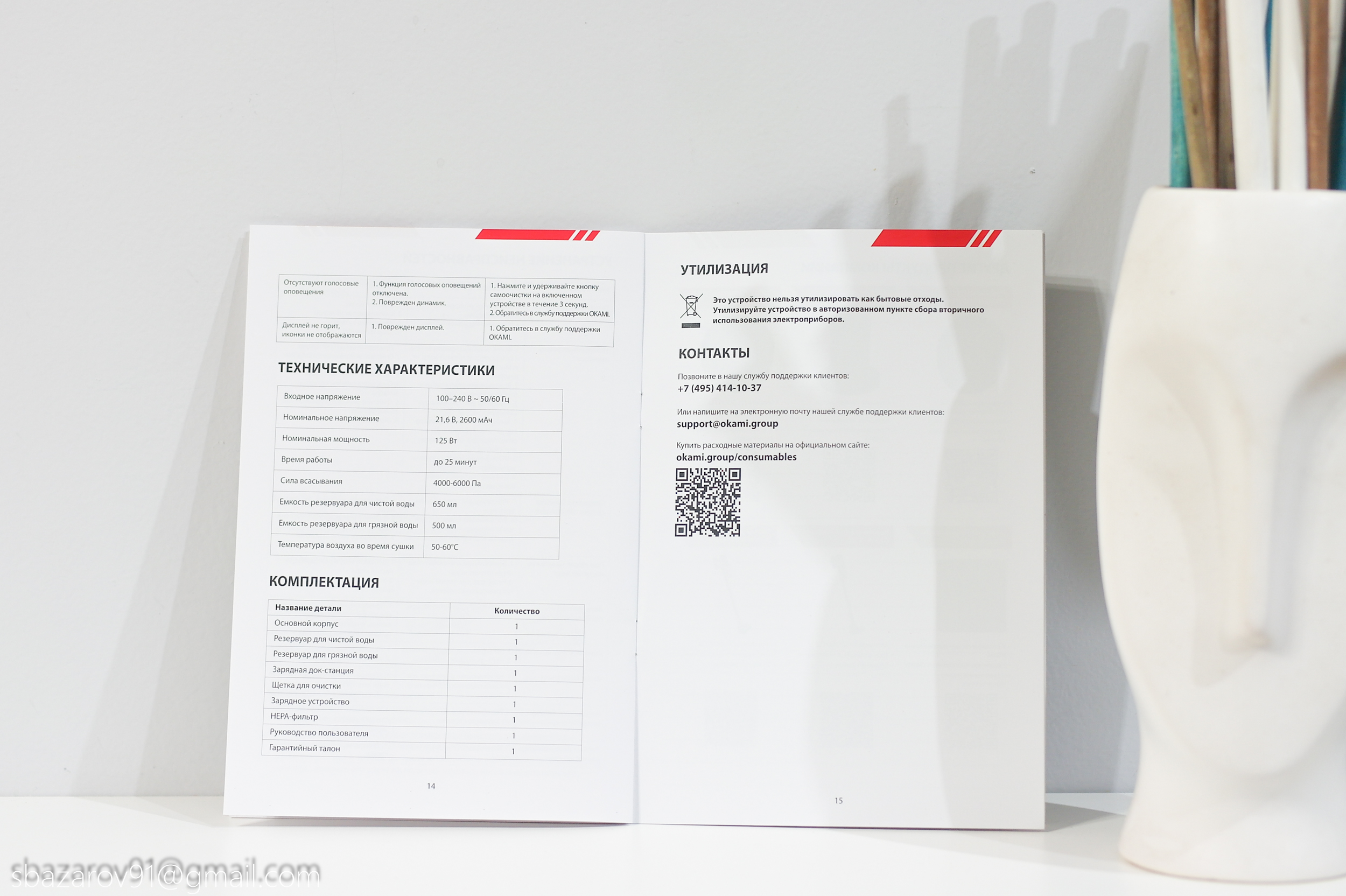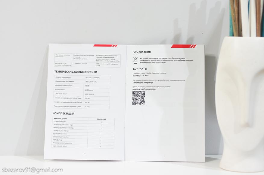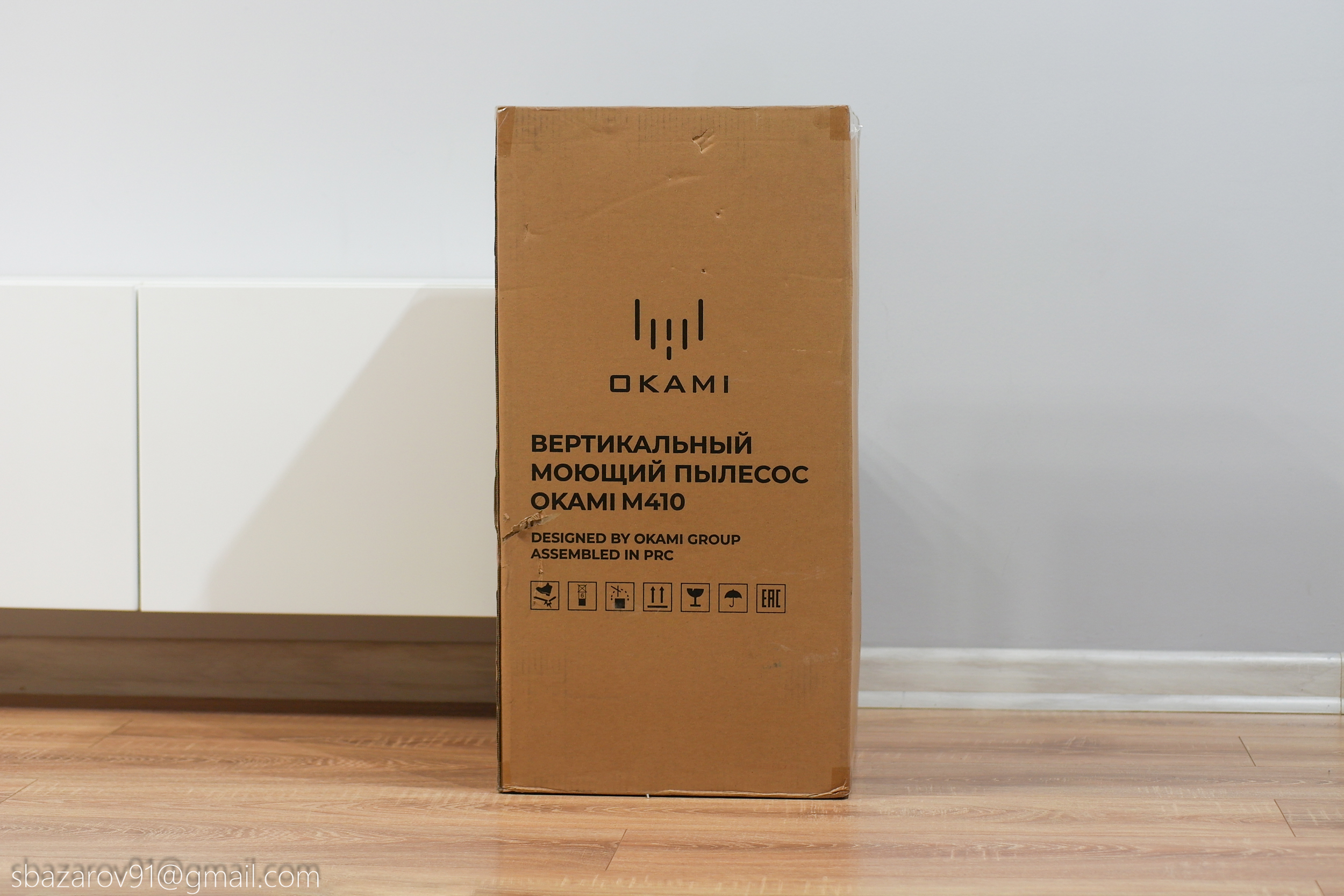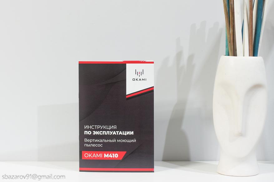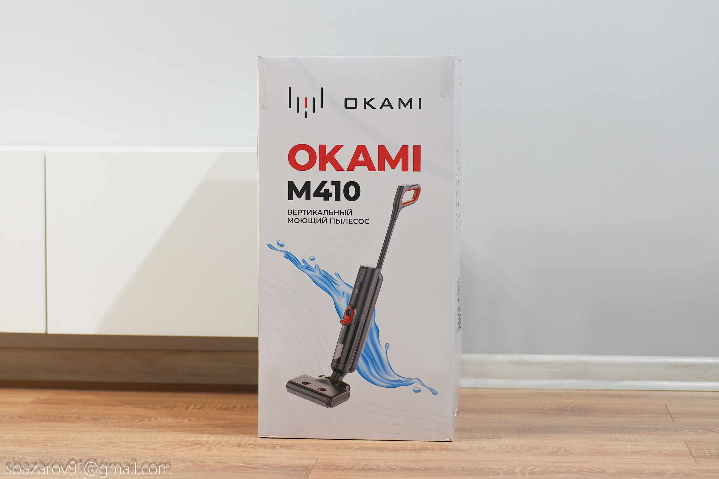 Моющий пылесос OKAMI M410 поставляется в двух коробках: внешней транспортировочной из переработанного картона и внутренней, оформленной цветной полиграфией.