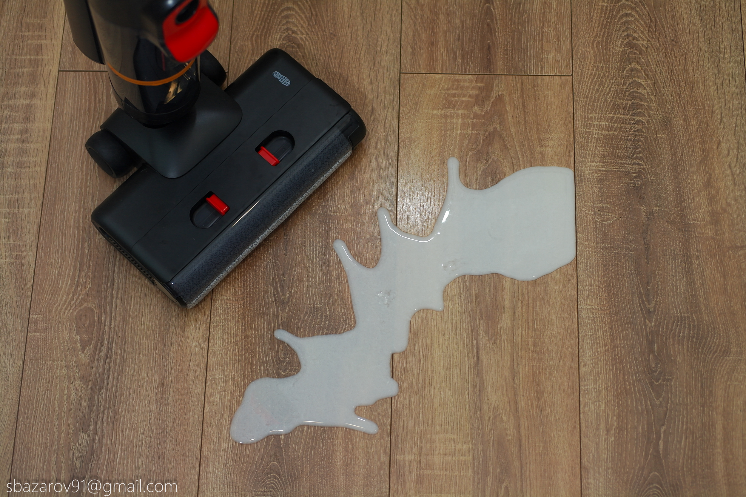 Для тестирования возможностей пылесоса я решил использовать разлитое молоко, что наглядно покажет, как OKAMI M410 справляется не только со сбором жидкости, но и с последующей мойкой пола. Для уборки использовался режим автоматической работы на ламинате. Предсказуемо, разлитое молоко не представляет каких-либо сложностей для пылесоса, и он собрал абсолютно всю разлитую жидкость.