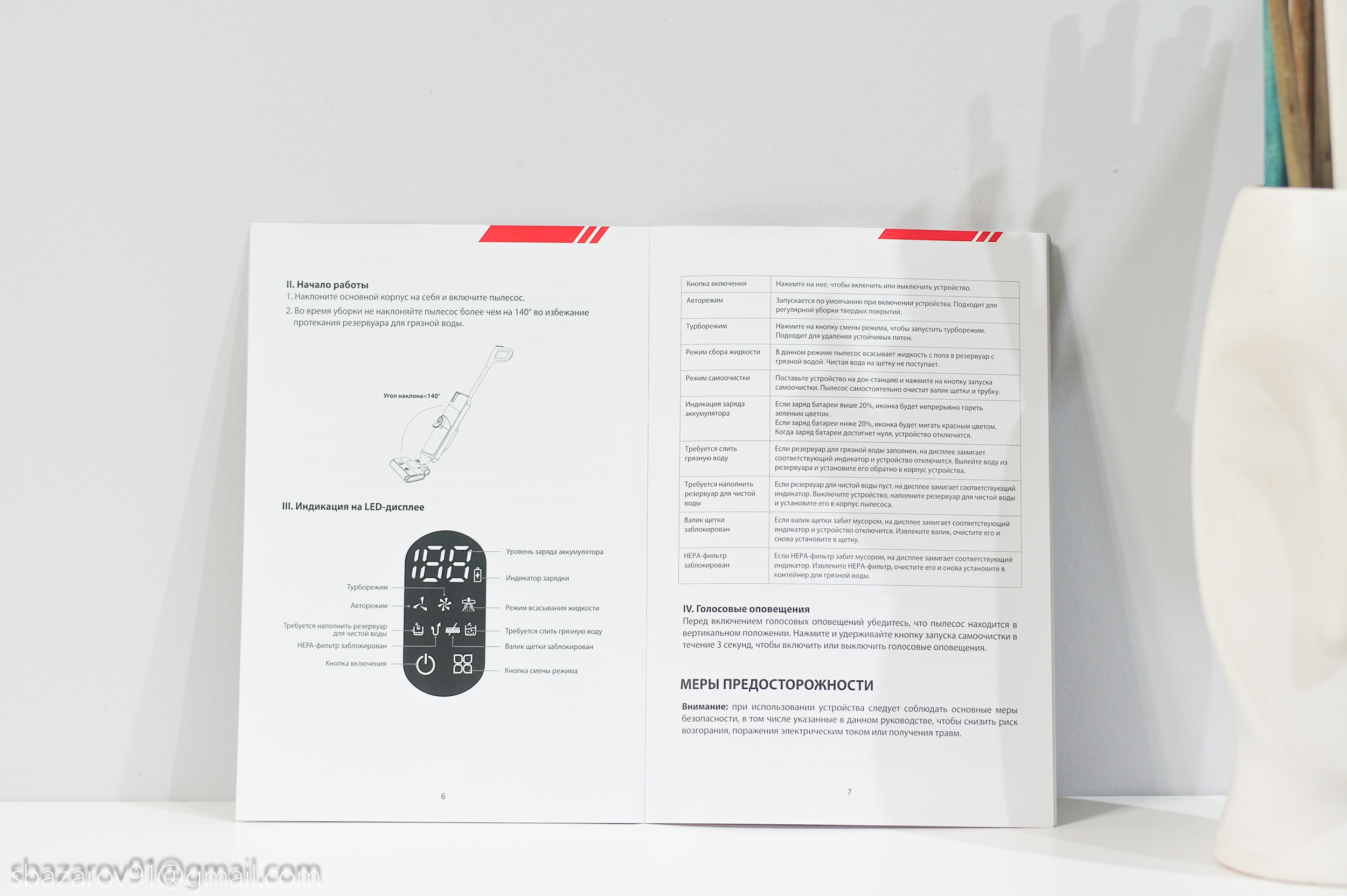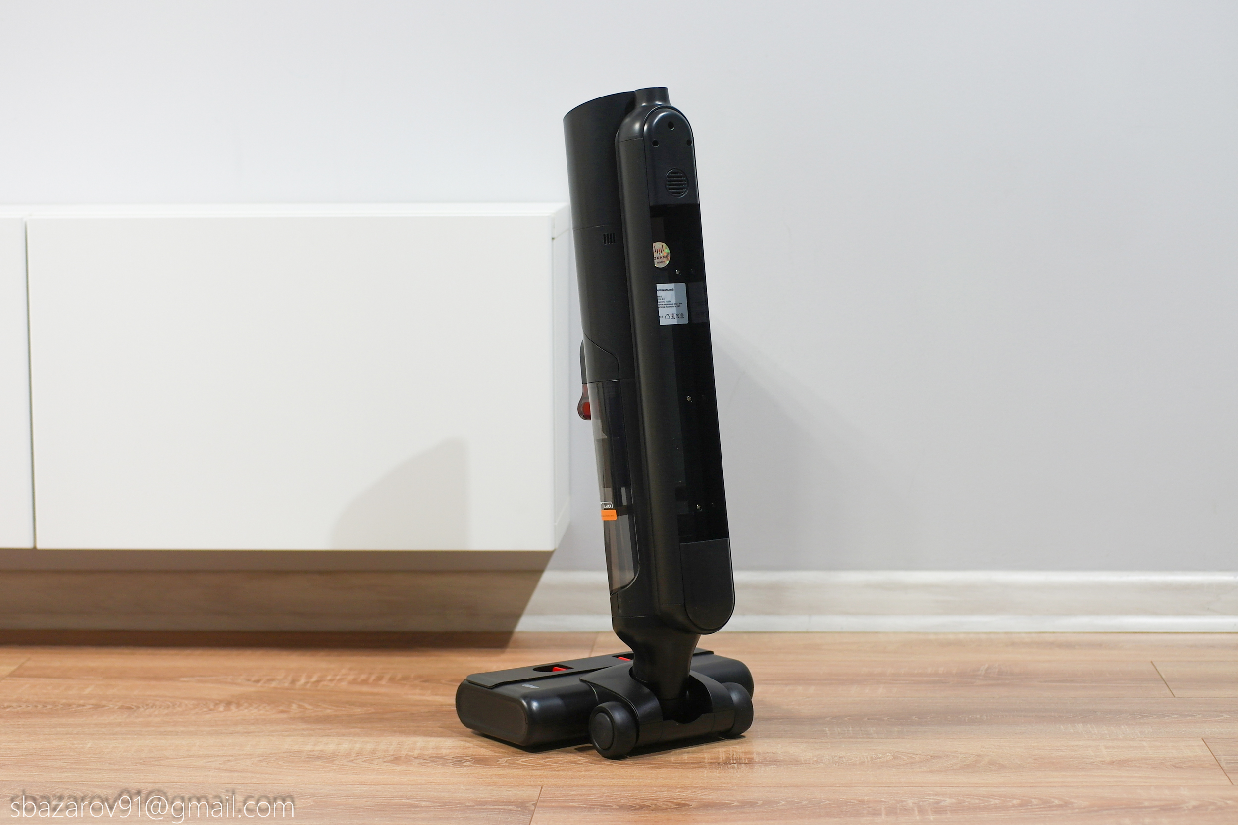 На обратной стороне пылесоса размещён съемный резервуар для чистой воды объемом 650 мл — этого легко хватает для влажной уборки квартиры площадью 55 кв. м. Также, в верхней части резервуара есть окошко динамика, через которое пылесос сообщает о своих действиях: включении, состоянии резервуара с грязной водой и наличии воды в резервуаре для чистой воды. При желании голосовые сигналы можно отключить, удерживая кнопку самоочистки в течение 3 секунд.