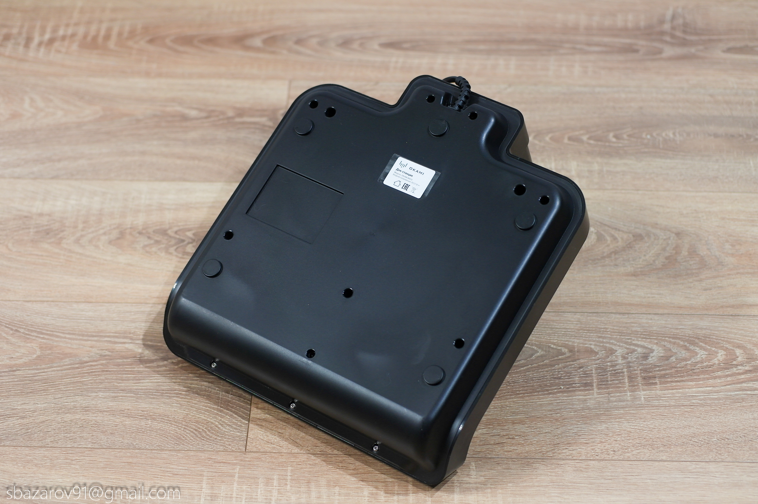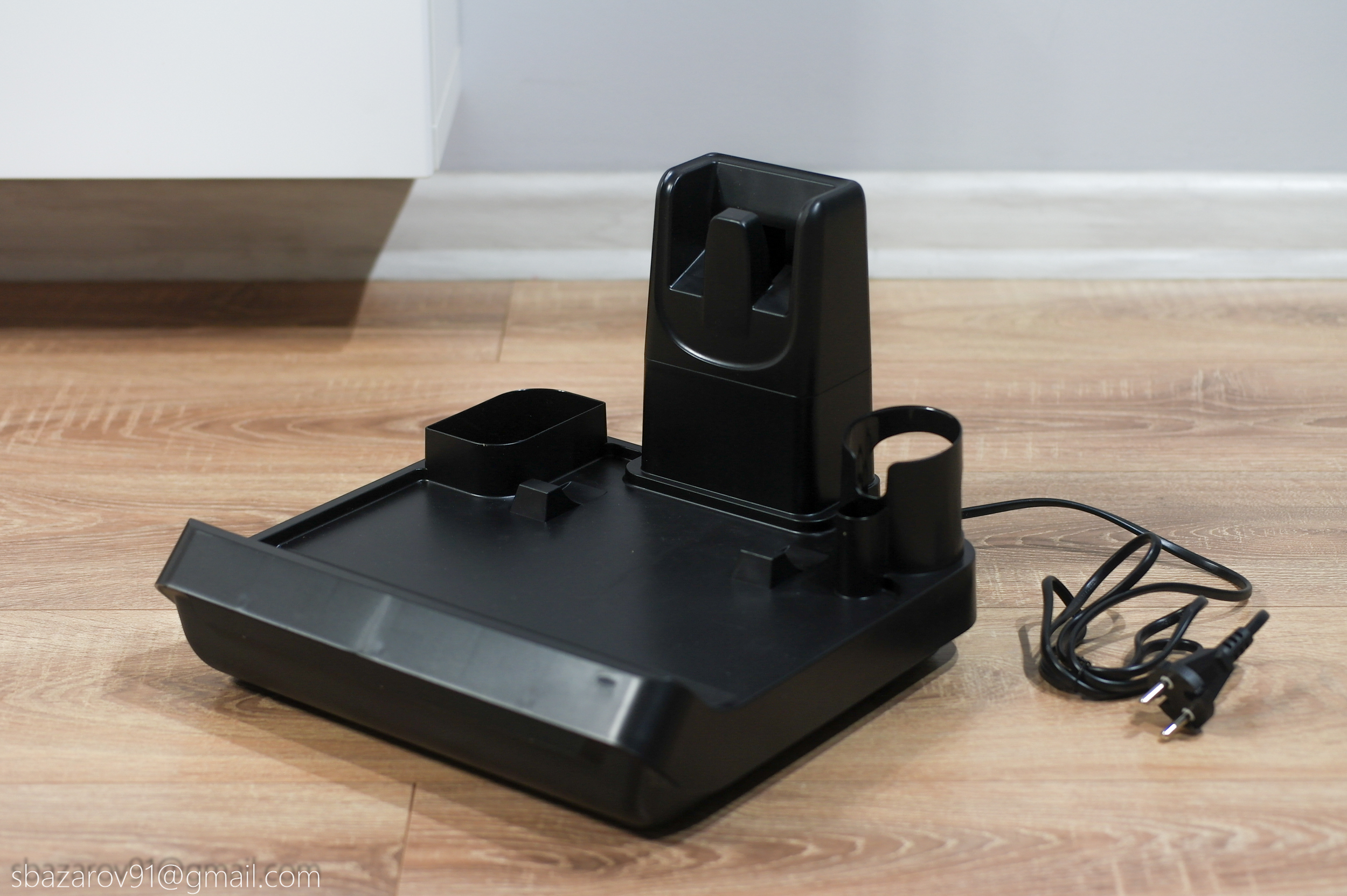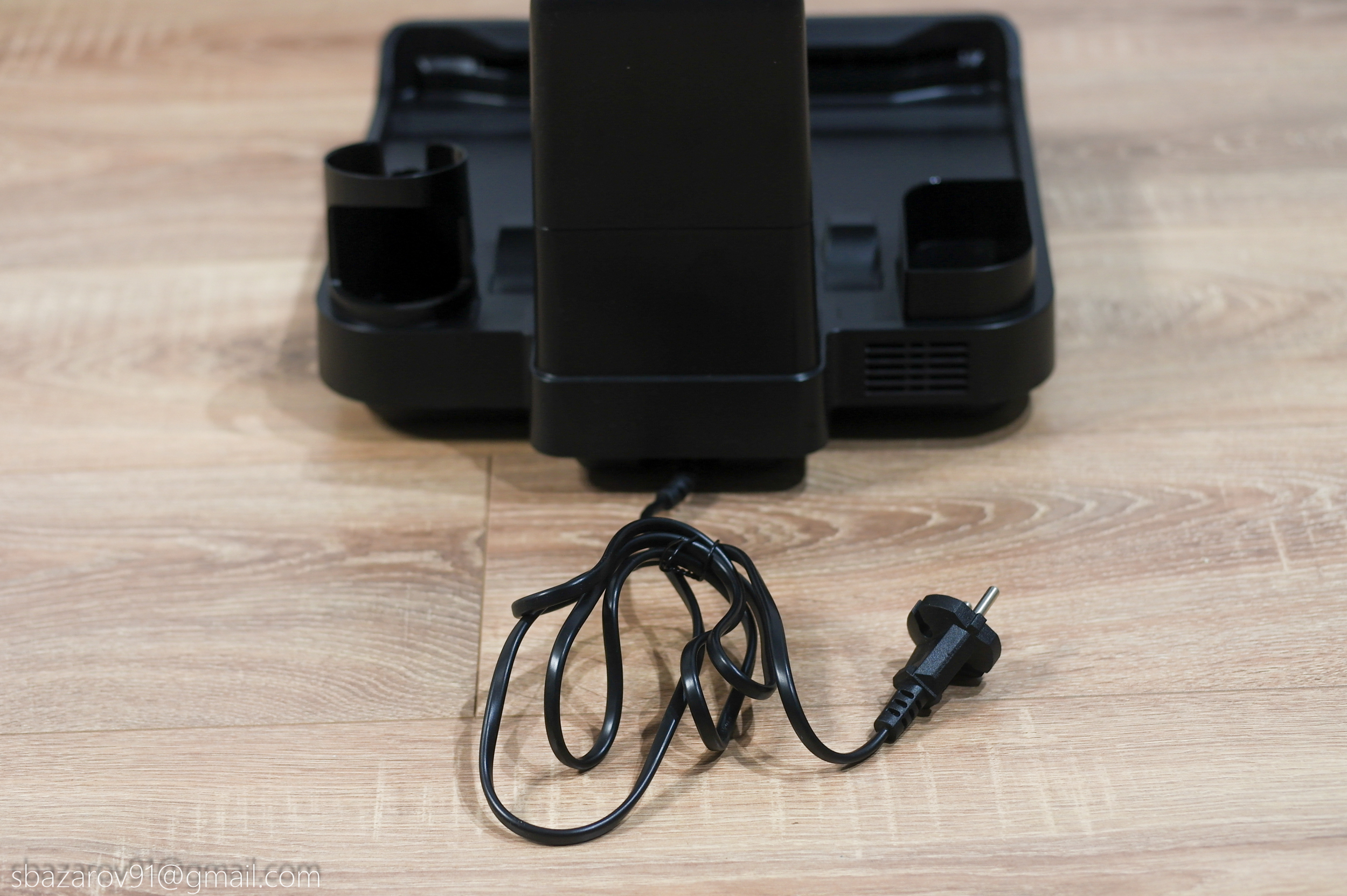 На нижней стороне док-станции есть пластиковые ножки, которые, к сожалению, не обеспечивают хорошее сцепление с ламинатом из-за отсутствия резинок, что вызывает небольшое скольжение. На задней части станции находится несъемный провод с европейской вилкой.