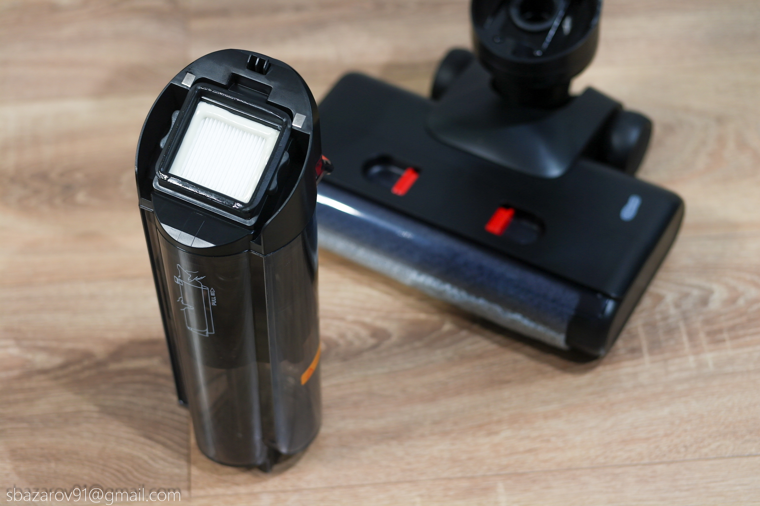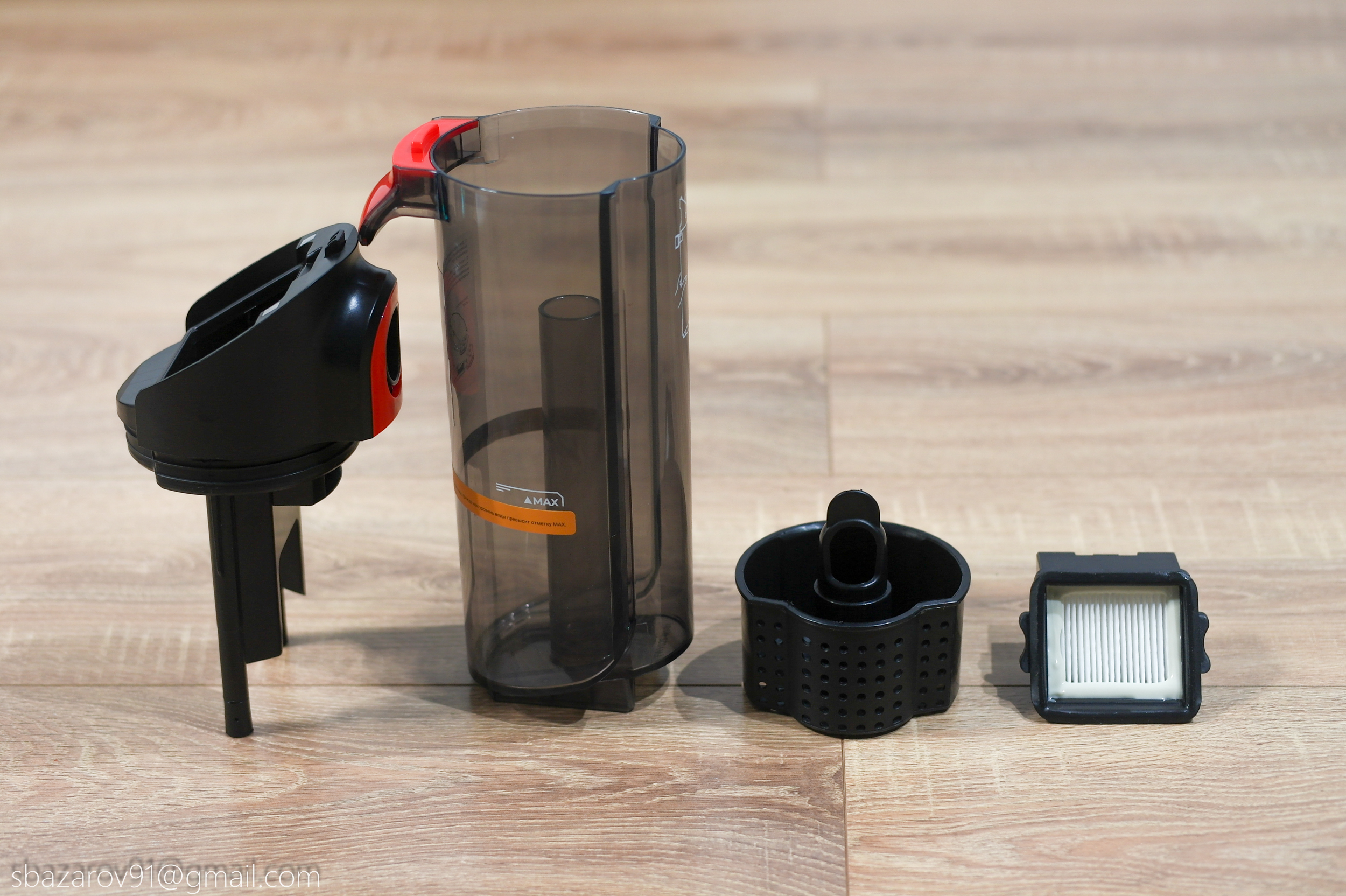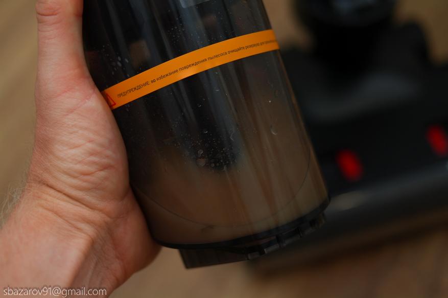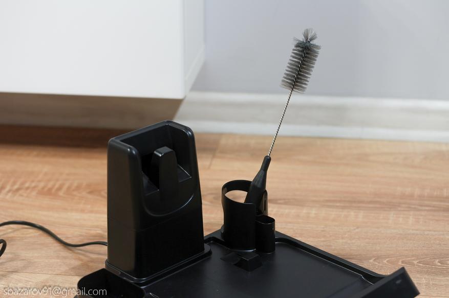 После того как щетка собрала мусор, он попадает в резервуар для грязной воды, где происходит отделение органических частиц от жидкости. Таким образом, если вы убирали суп с картофелем, то жидкость останется в резервуаре, а твердые фракции осядут на специальной сеточке-сепараторе. Резервуар имеет разборную конструкцию для упрощенного обслуживания и состоит из HEPA-фильтра, основной колбы (объем 500 мл), сепаратора и крышки. Все детали можно легко промывать под водой.