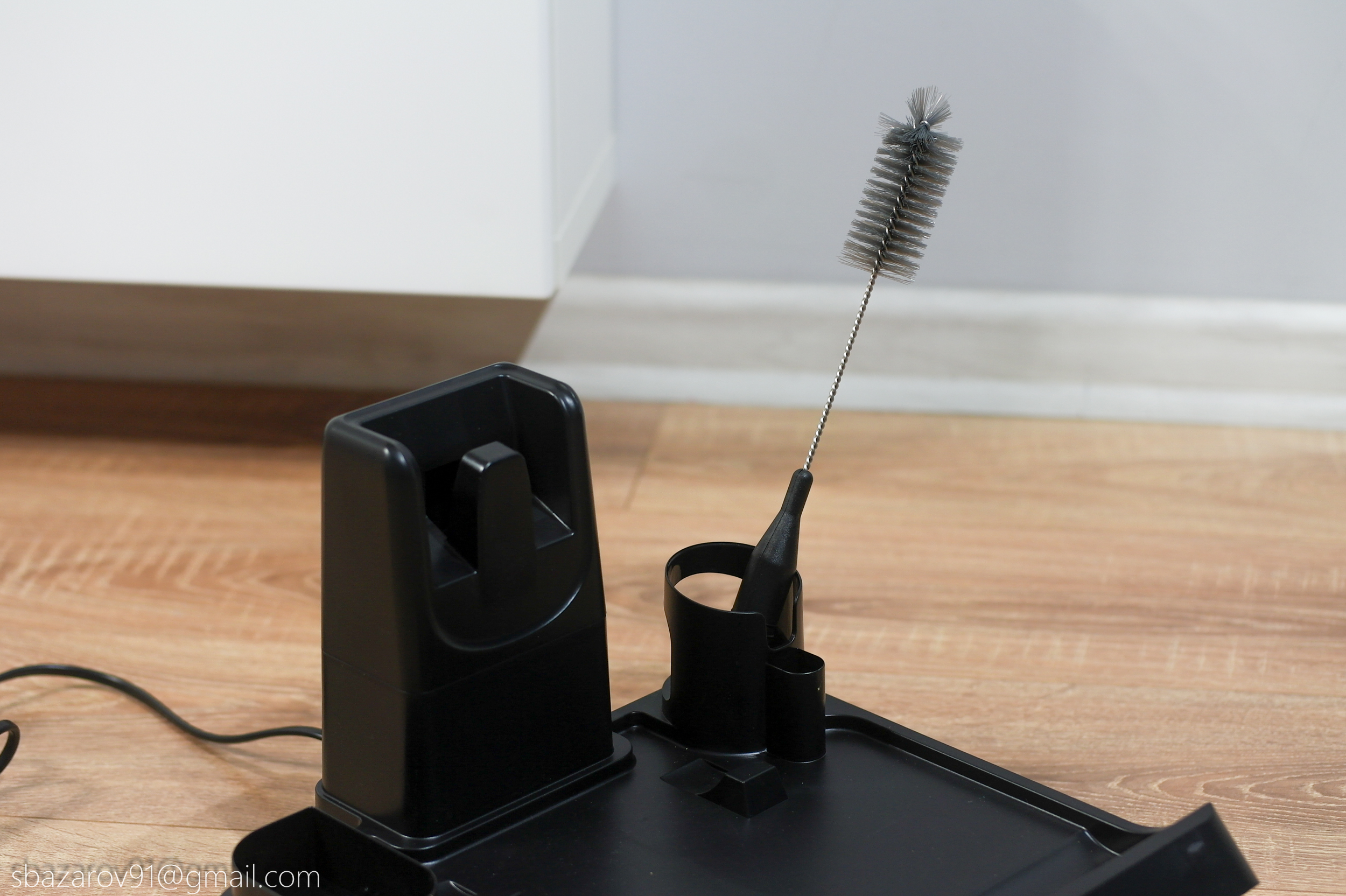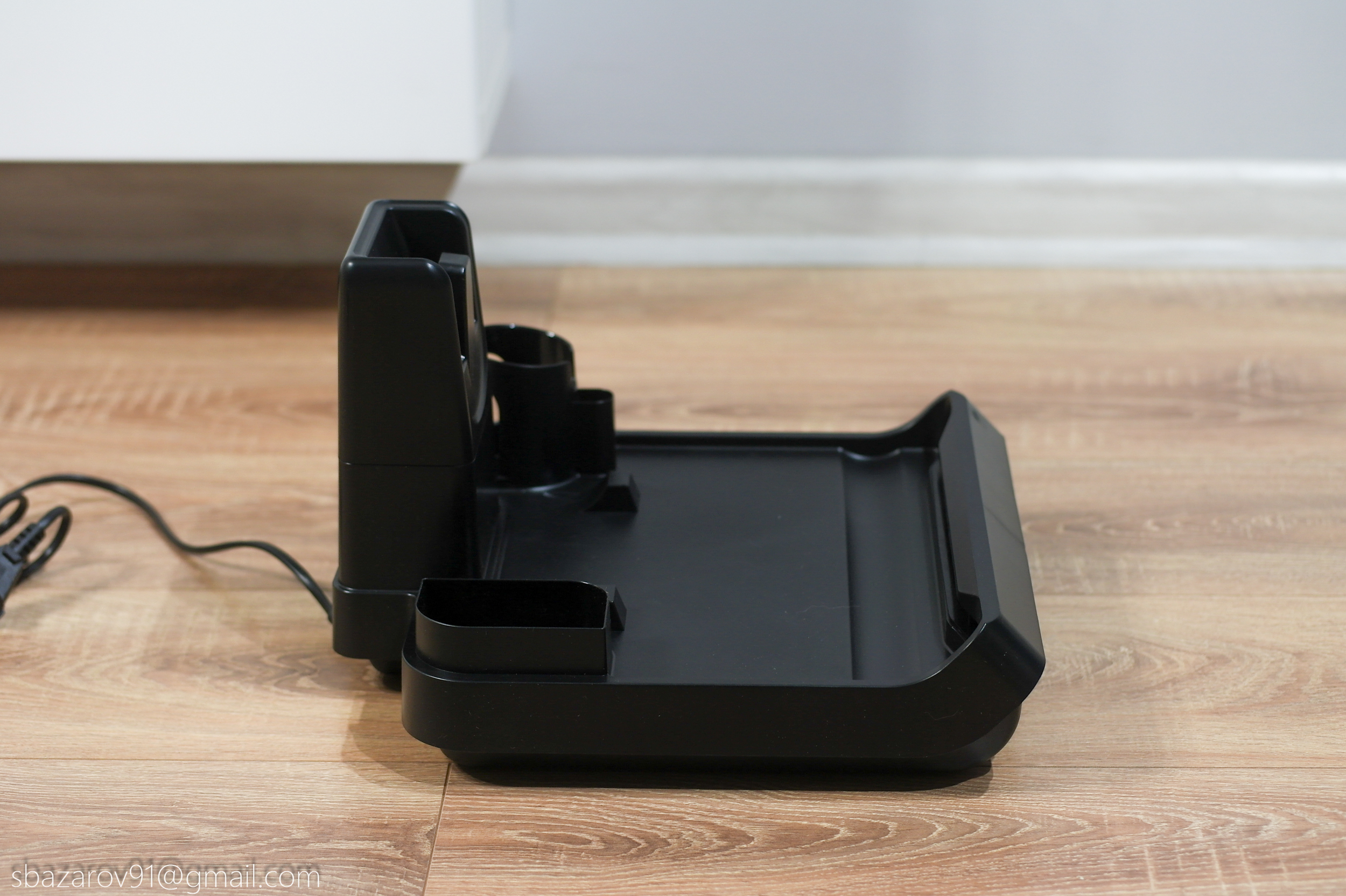Не смотря на самостоятельность в вертикальном положении, моющий пылесос OKAMI M410 оснащен зарядной док-станцией. Выполнена она классическим образом, где есть зарядные контакты, посадочное для колес и моющего валика, а также пара отсеков для хранения комплектных аксессуаров. В случае с M410 нам предлагают щетку для очистки патрубка пылесоса, которая может храниться на самой станции.