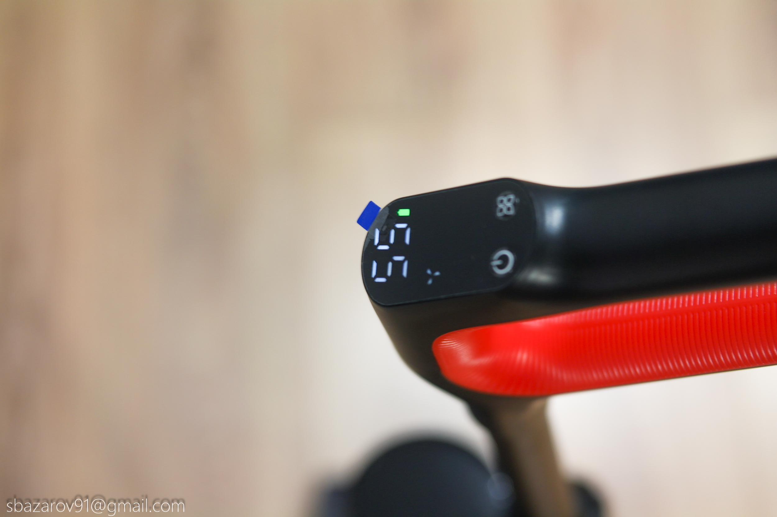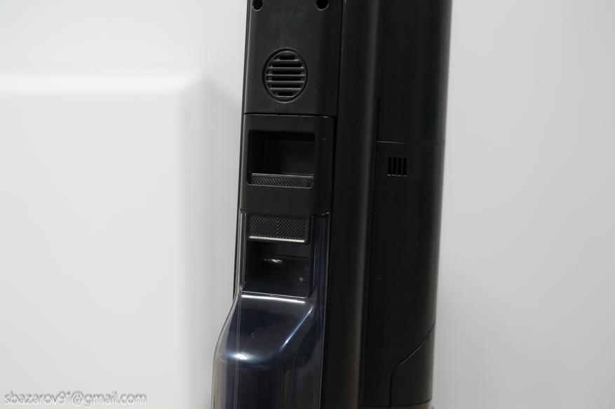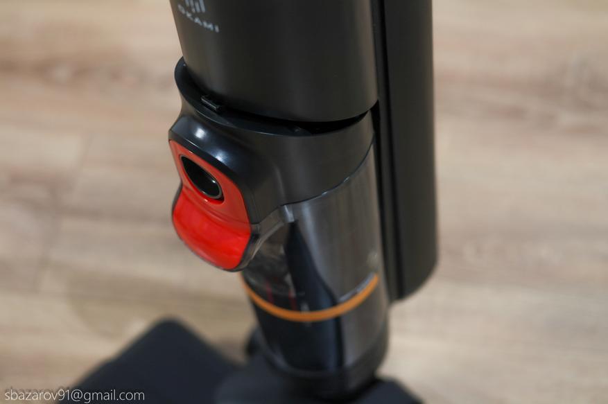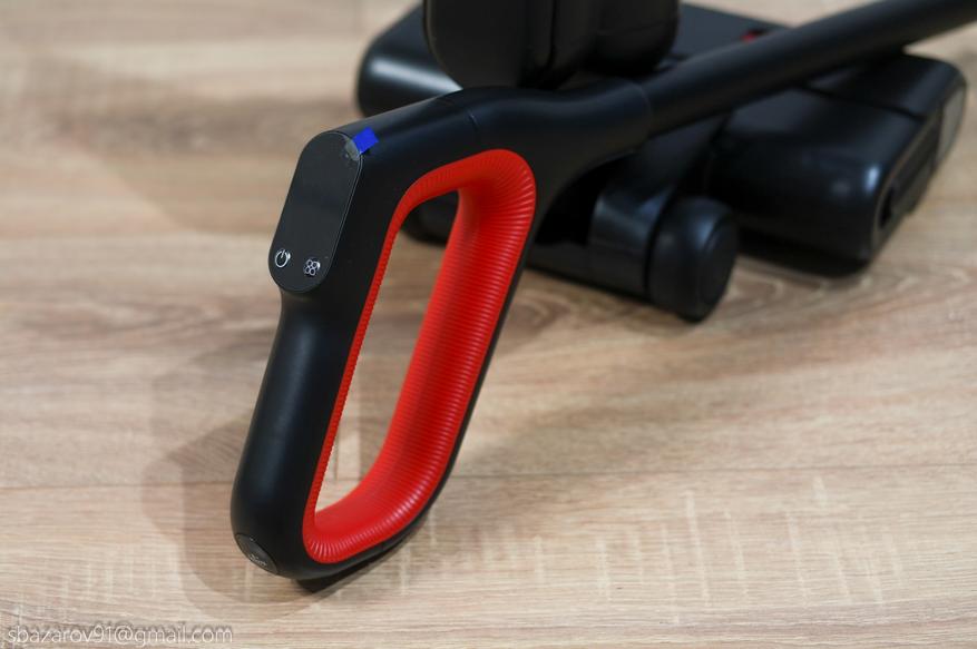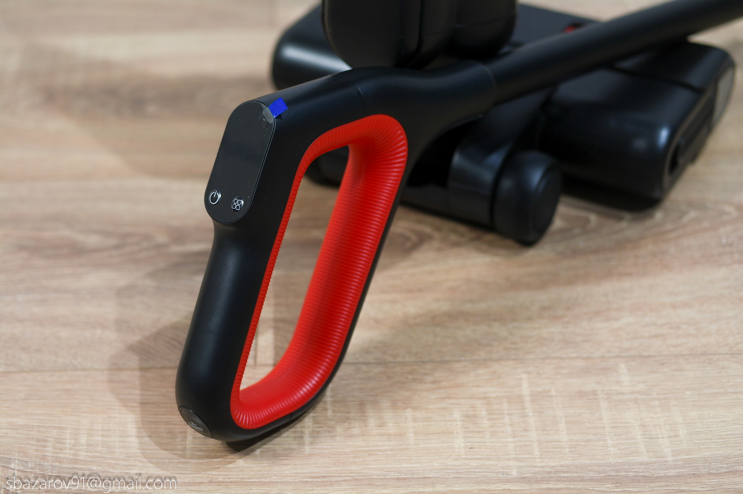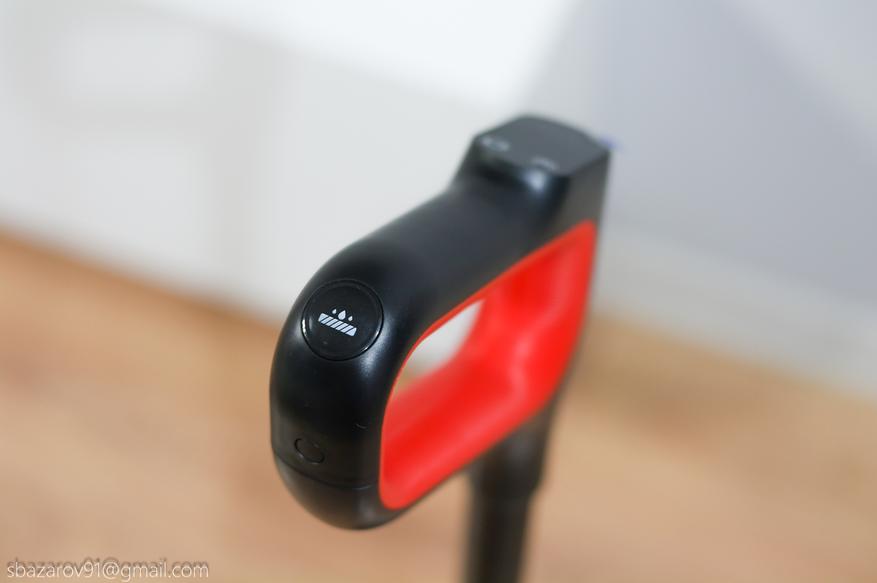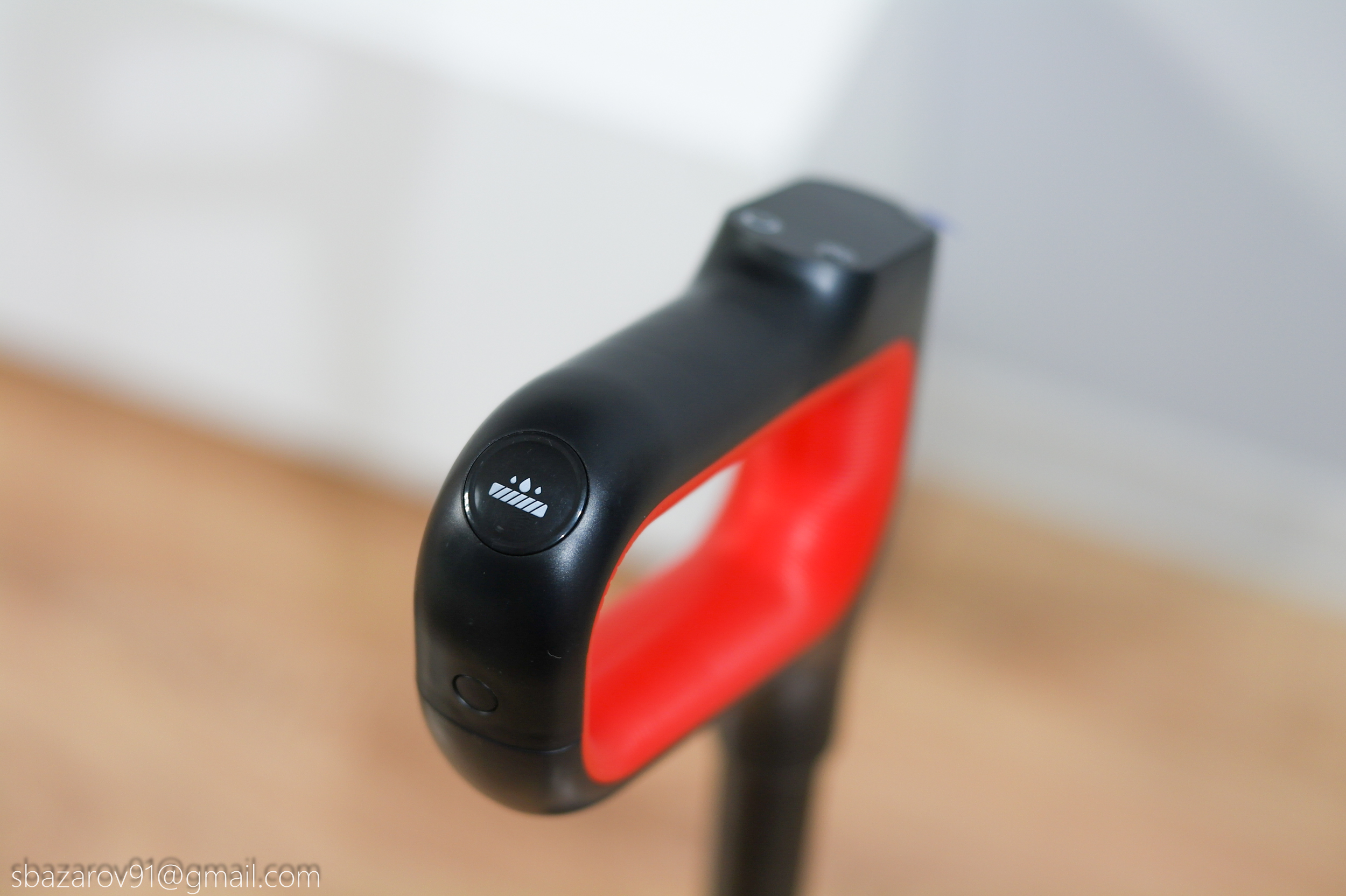 К финальной части пылесоса относится рукоятка с органами управления, которая устанавливается внутри основного корпуса. В отличие от остального корпуса, ручка получила яркую красную вставку. На верхней части рукоятки можно обнаружить небольшой LED-дисплей с большим количеством пиктограмм, а на противоположной стороне кнопку запуска самоочистки.