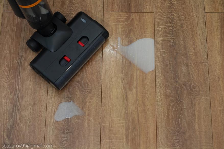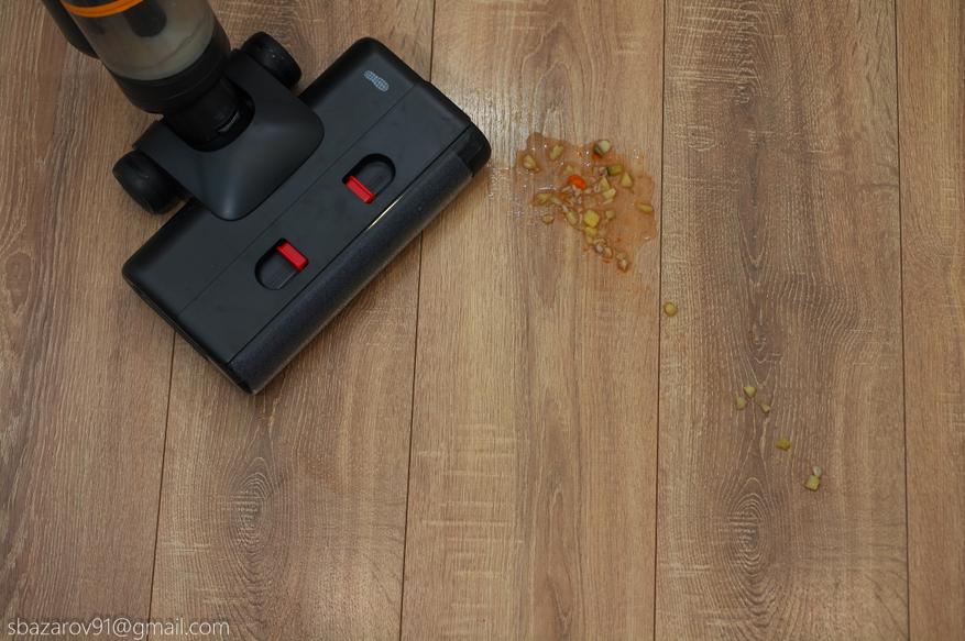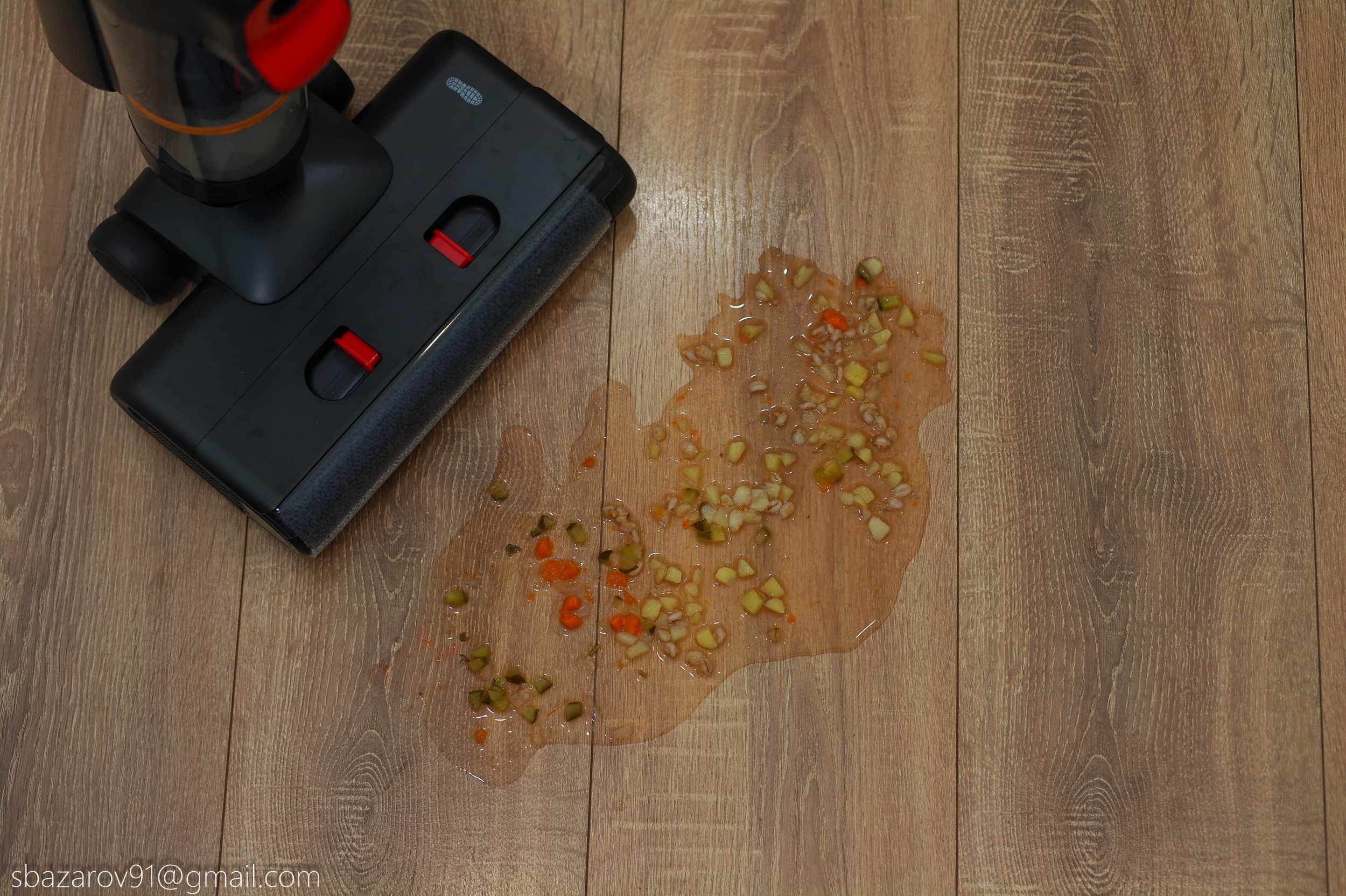 Далее я усложнил задачу, разлив рассольник с остатками пищи. В отличие от молока, суп обычно содержит твердые компоненты, такие как картошка, мясо и морковь. Как и в предыдущем тесте оценим возможности по сбору и последующей мойке на примере одного прохода. Покрытие — ламинат, режим работы — автоматический. За один проход пылесос собрал практически все продукты, параллельно вымыв пол за собой. Ну, а полный цикл уборки такой «лужи» занял не более 15 секунд.