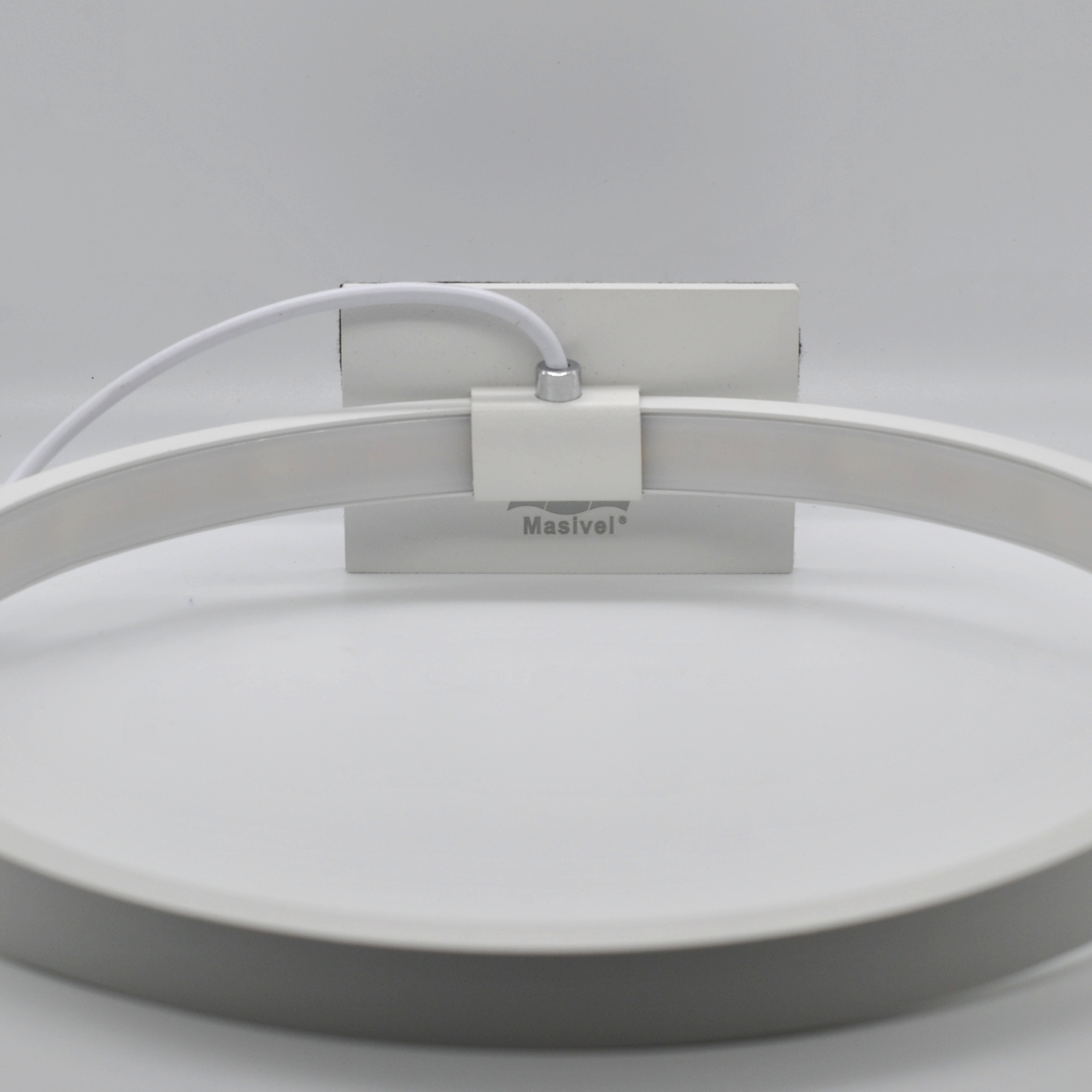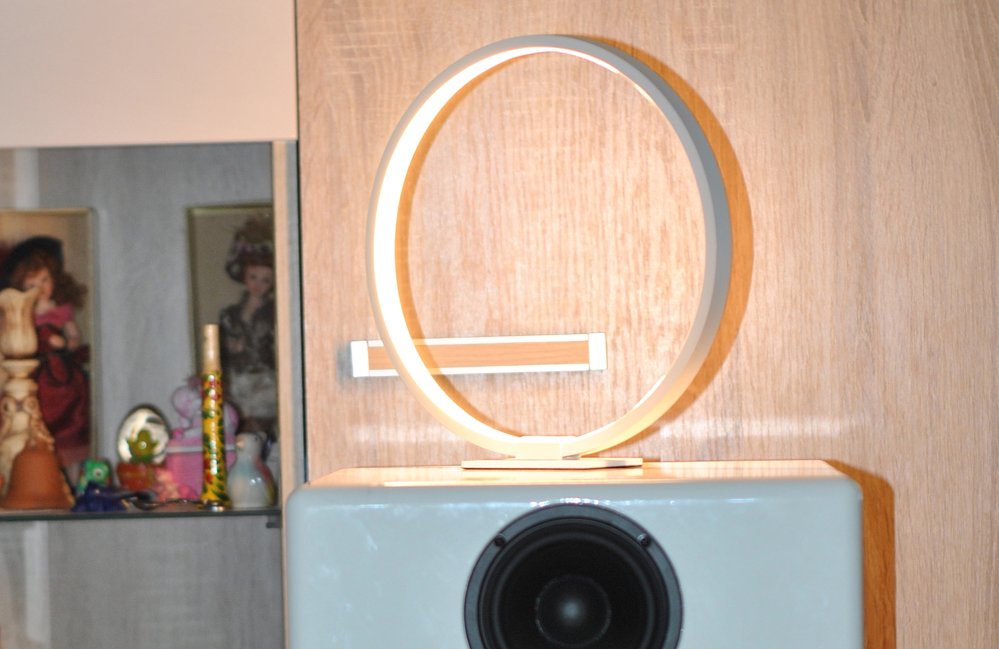 Дизайн в духе минимализма: узкой кольцо, матовый рассеиватель и небольшая подставка. Корпус из алюминия, в моем случае покрашен белой порошковой краской. Конструкция жесткая. «Хвостик» кабеля из лампы 16 см.