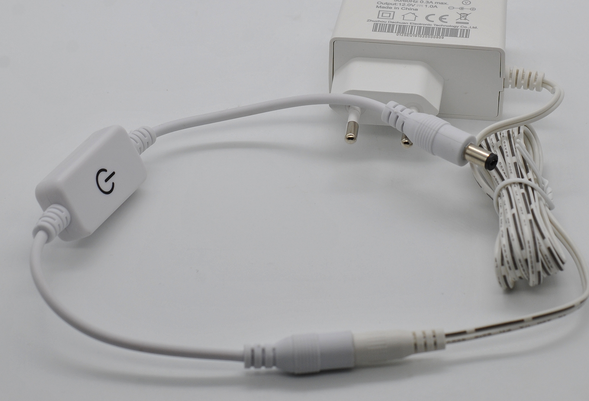 Блок регулировки включается в разрыв блок питания-лампа. Он оснащен кабелем общей длиной 30 см с такими же разъемами. Одна кнопка сенсорная: включает/выключает при нажатии и при удержании регулирует яркость от 30 до 100%.