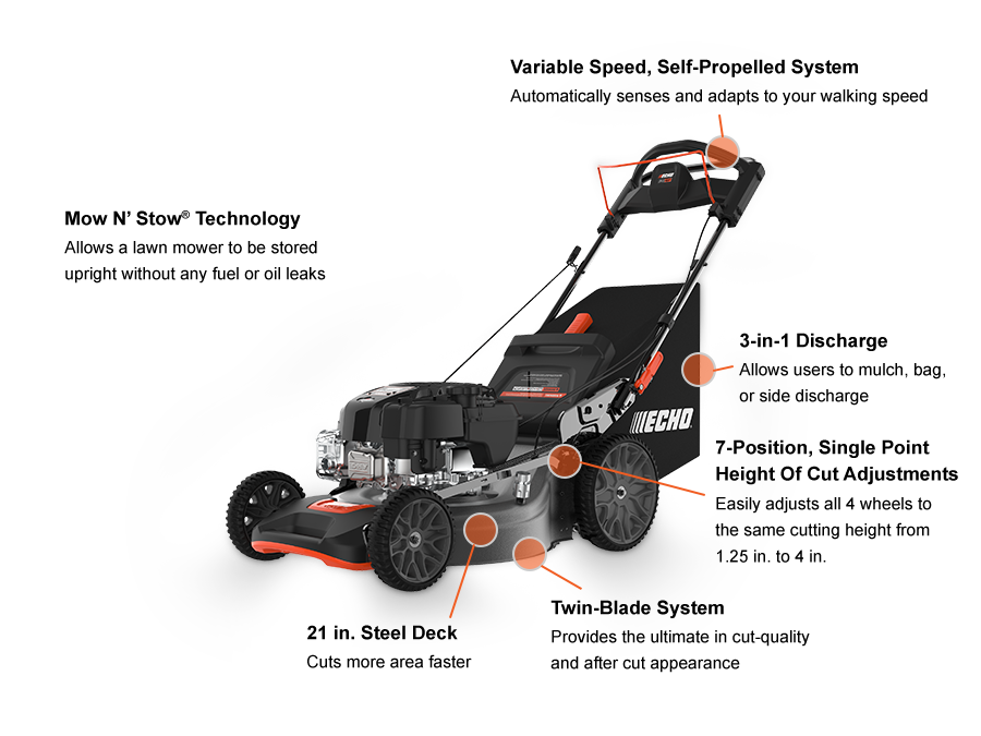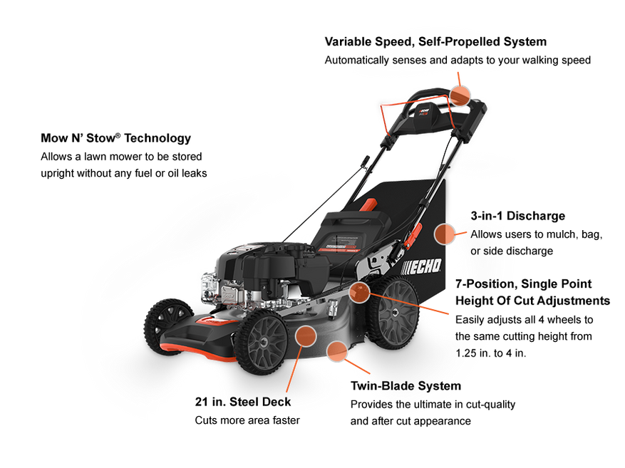 Самоходная газонокосилка предназначена для использования в домохозяйствах и отличается рядом функций. ECHO LM-2119SP оснащена 21-дюймовым стальным режущим диском. Платформа оснащена встроенным быстросъемным разъемом, который позволяет подсоединять садовый шланг для уборки остатков скошенной травы. Конструкцией под платформой предусмотрен пластиковый экран, который защищает узлы вращения от попадания воды и грязи. Производитель предусмотрел регулировку высоты среза травы от 1,25 до 4,0 дюймов (3,2-10,1 см).