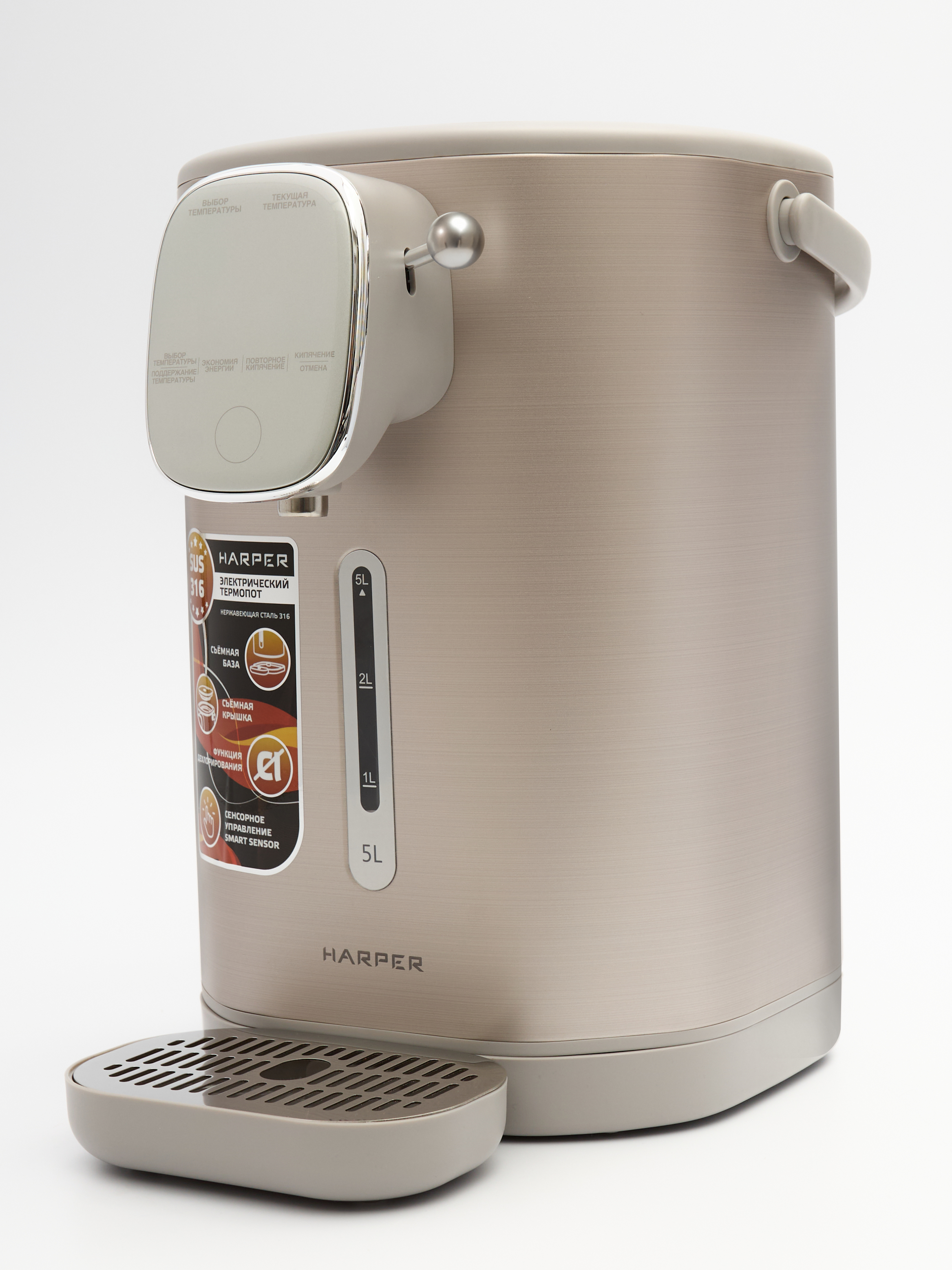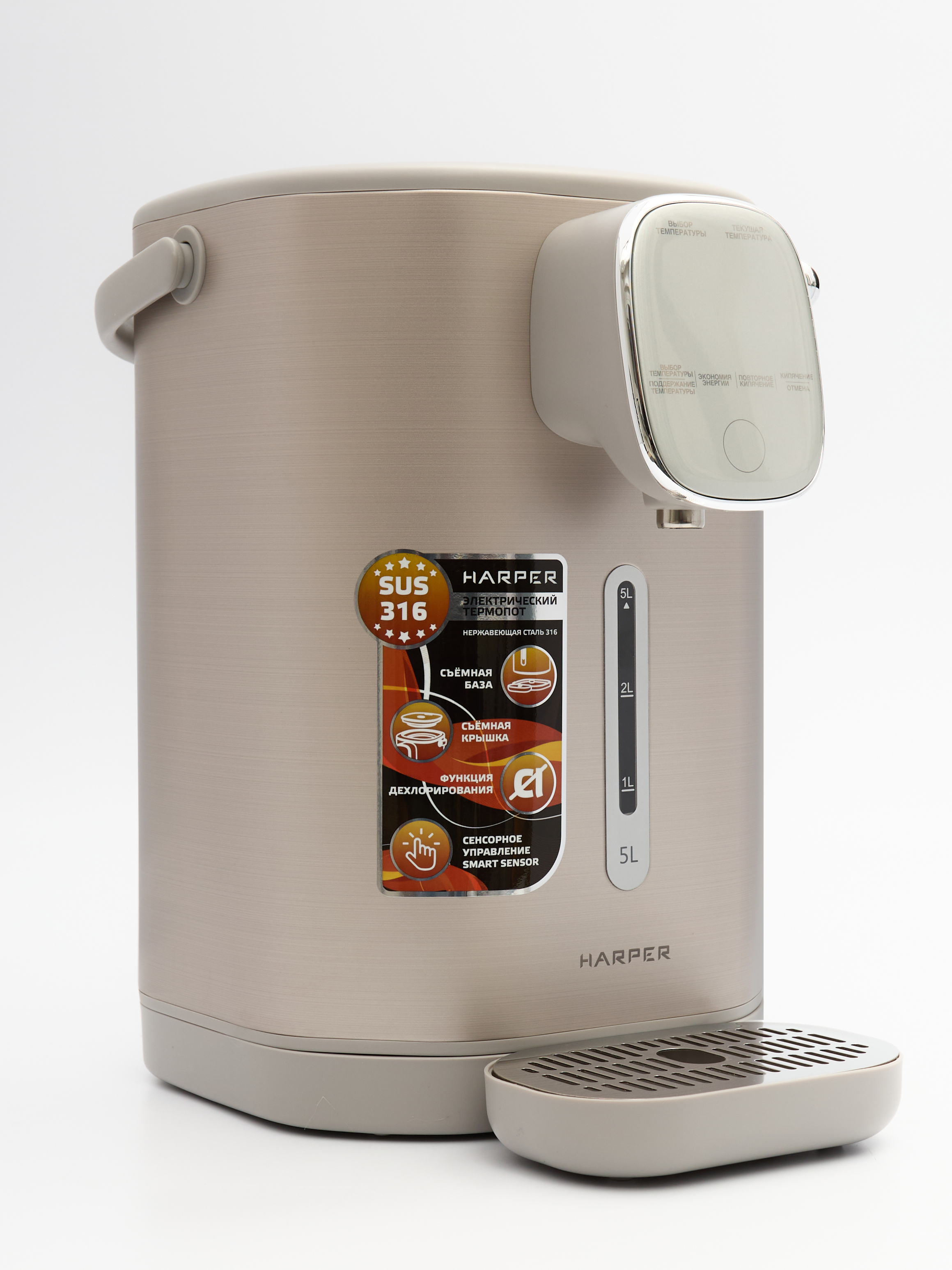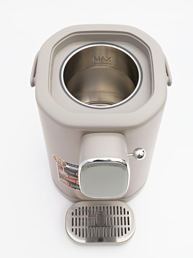 Термопот оснащен баком объемом 5 литров из нержавеющей стали марки SUS316. Данный материал содержит молибден, что обеспечивает повышенную устойчивость к коррозии и агрессивным средам, а также применяется в пищевой промышленности и медицине.