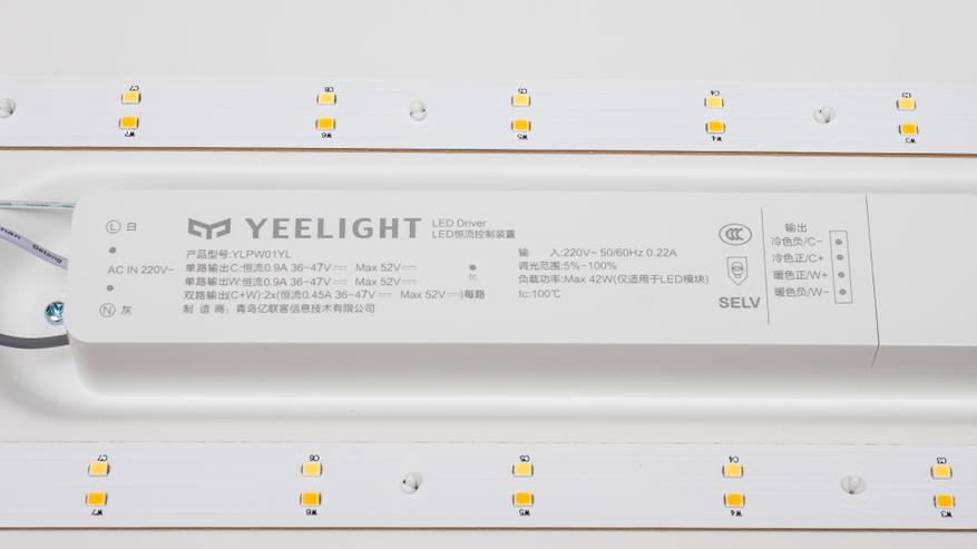 Как я уже сказал, лампа оснащена 120 светодиодами, 50 на 50 — желтыми и белыми, которые расположены попарно, на 6 полосах.