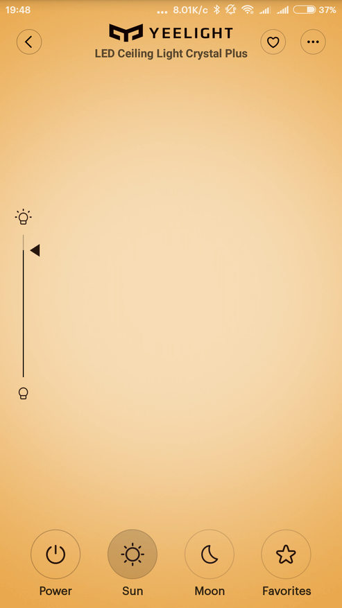 Приложение — совершенно стандартное для светильников Yeelight. На главном экране внизу 4 кнопки — включение, основное освещение, ночник, избранное. Яркость регулируется свайпом вверх вниз, цветовая температура — вправо влево.
