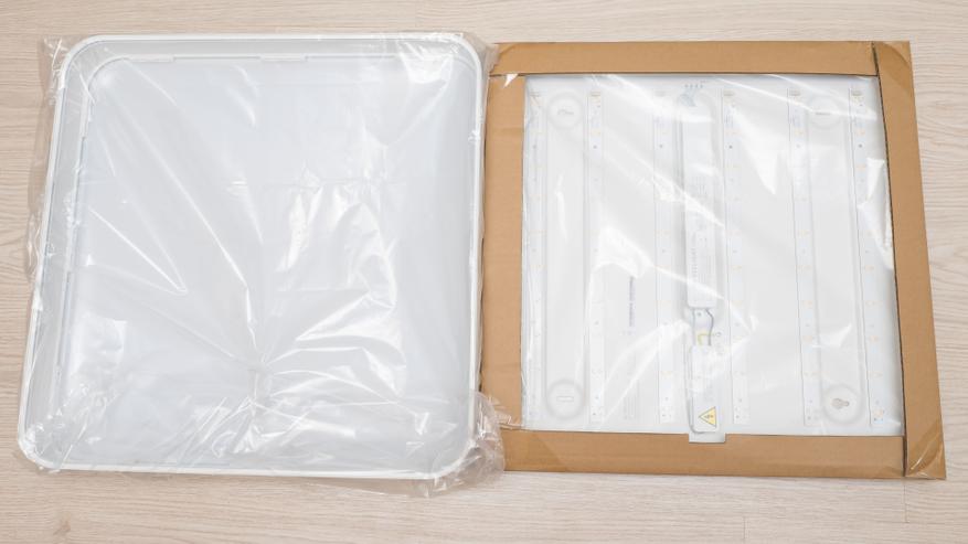 Люстра приехала в разобранном виде — матовый плафон отдельно, металлическая основа с диодами — отдельно. Основа дополнительно упакована в картон. Кстати размер светильника — полметра на полметра, толщина около 7 см.