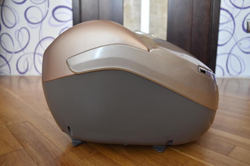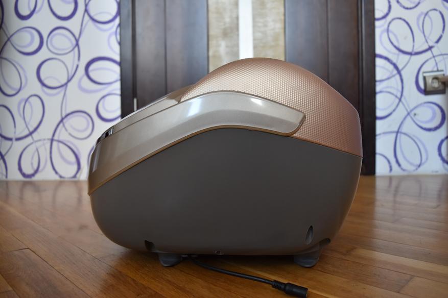 Прибор представлен в интересном дизайне. Корпус выполнен из комбинированного по цвету и текстуре пластика. Но цвета отлично гармонируют. Верхняя панель, на которой расположился модуль управления имеет золотистый цвет и глянцевое покрытие с мелкими вкраплениями. Углубления для размещения ног окантованы пластиком с рифленой структурой. Основание выполнено из серого матового пластика. Корпус не маркий. Стоит отметить, что все части корпуса крепкие. Массажер достаточно габаритный и тяжелый.