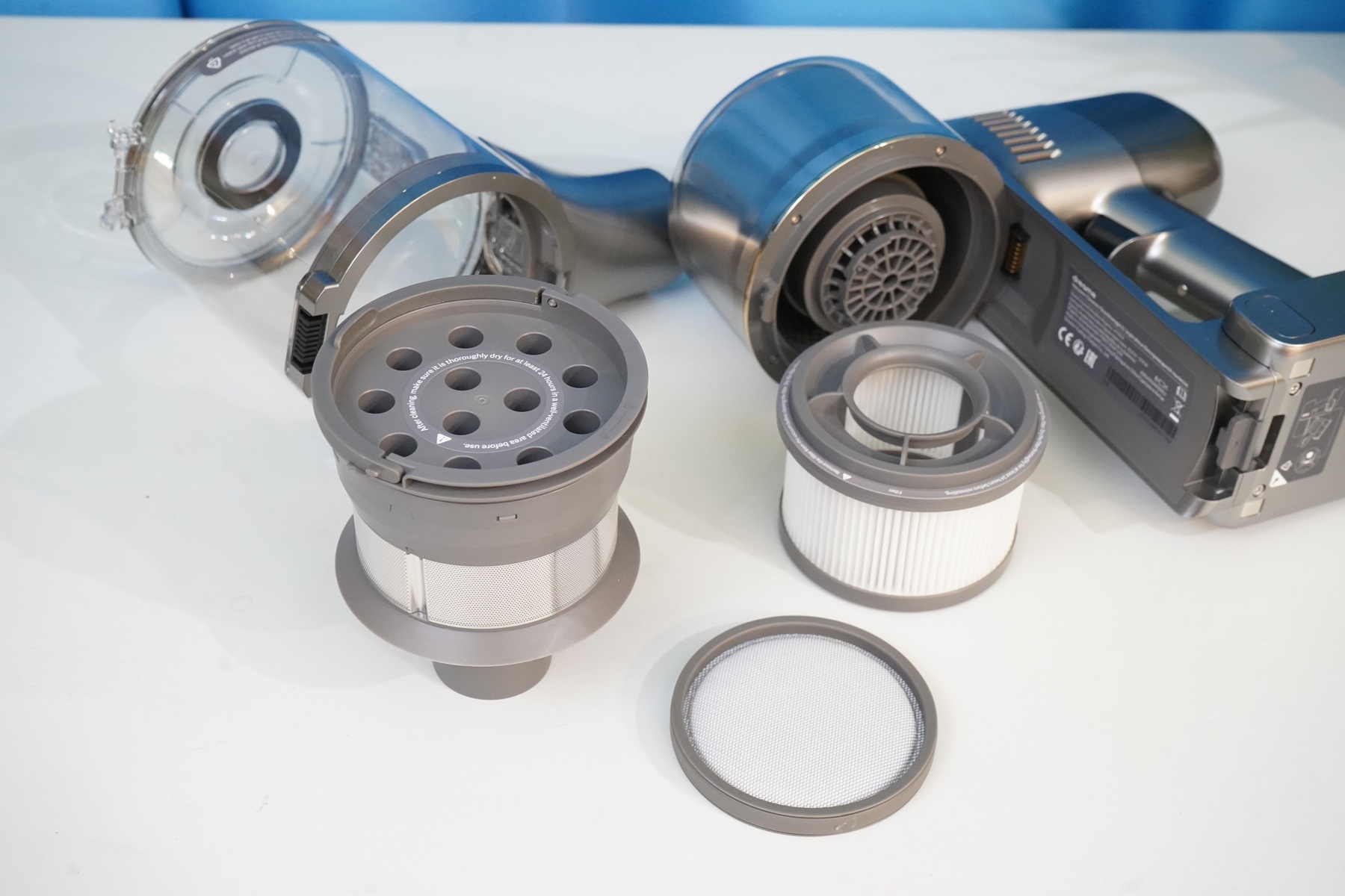 Собственно говоря, чтобы выбросить мусор, достаточно открыть нижнюю крышку-клапан мусоросборника и вытряхнуть собранную пыль/мусор куда-либо. А вот для очистки системы фильтрации удобнее будет снять прозрачный корпус колбы мусоросборника, а затем уже разобрать на составляющие: циклонную колонну с металлической сеткой грубой очистки, фильтр-диск, а также моторный HEPA-фильтр патронного типа. Циклонная колонна состоит из 12-каналов, то есть это честный мультициклонный фильтр.