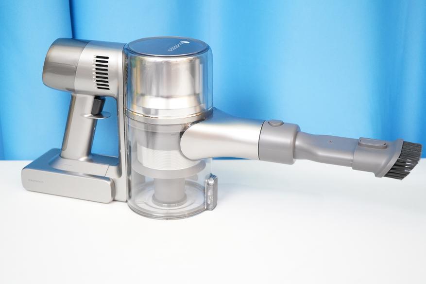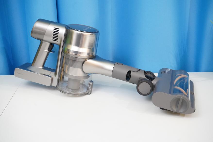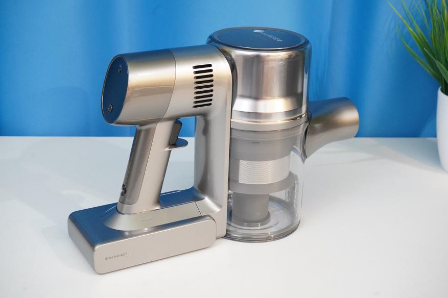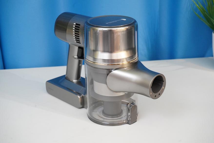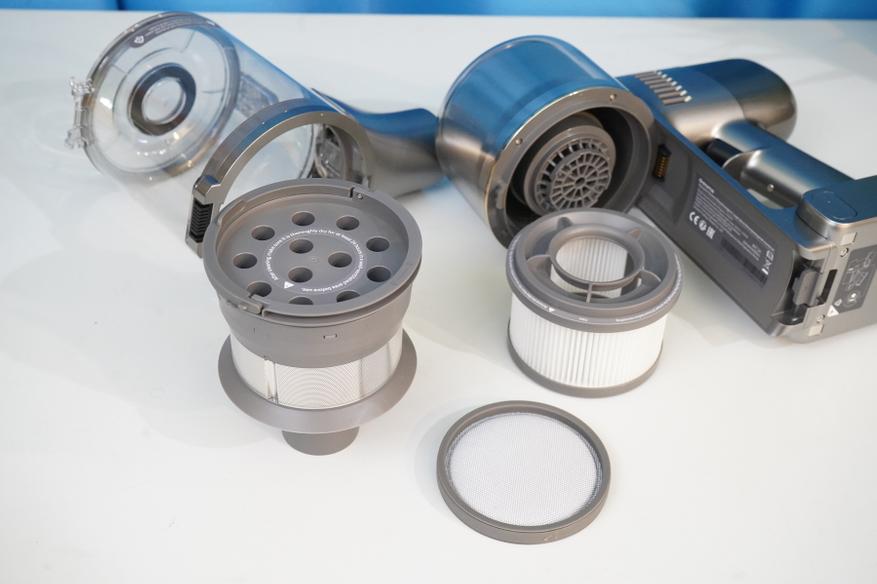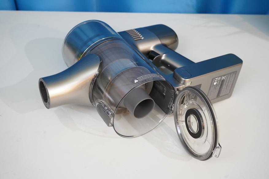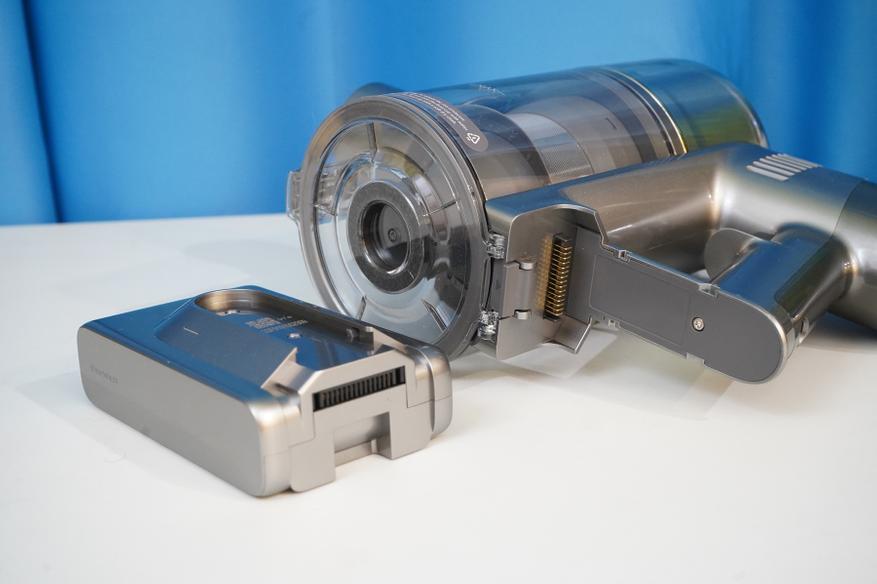 Сам по себе пылесос состоит из моторного модуля (корпуса) на который устанавливается АКБ и мусоросборник. Там же располагается система фильтров (несколько ступеней фильтров от грубой металлической сетки до тонкой HEPA-очистки), а также кнопки запуска/управления и цветной дисплей. Рукоятка имеет небольшой угол наклона таким образом, чтобы при уборке было удобнее удерживать пылесос в сборе. Конструкция более или менее продумана, мусоросборник можно полностью снять, разобрать, а фильтры — извлечь для очистки. Да и АКБ выполнена съемной в форм-факторе слайдера.