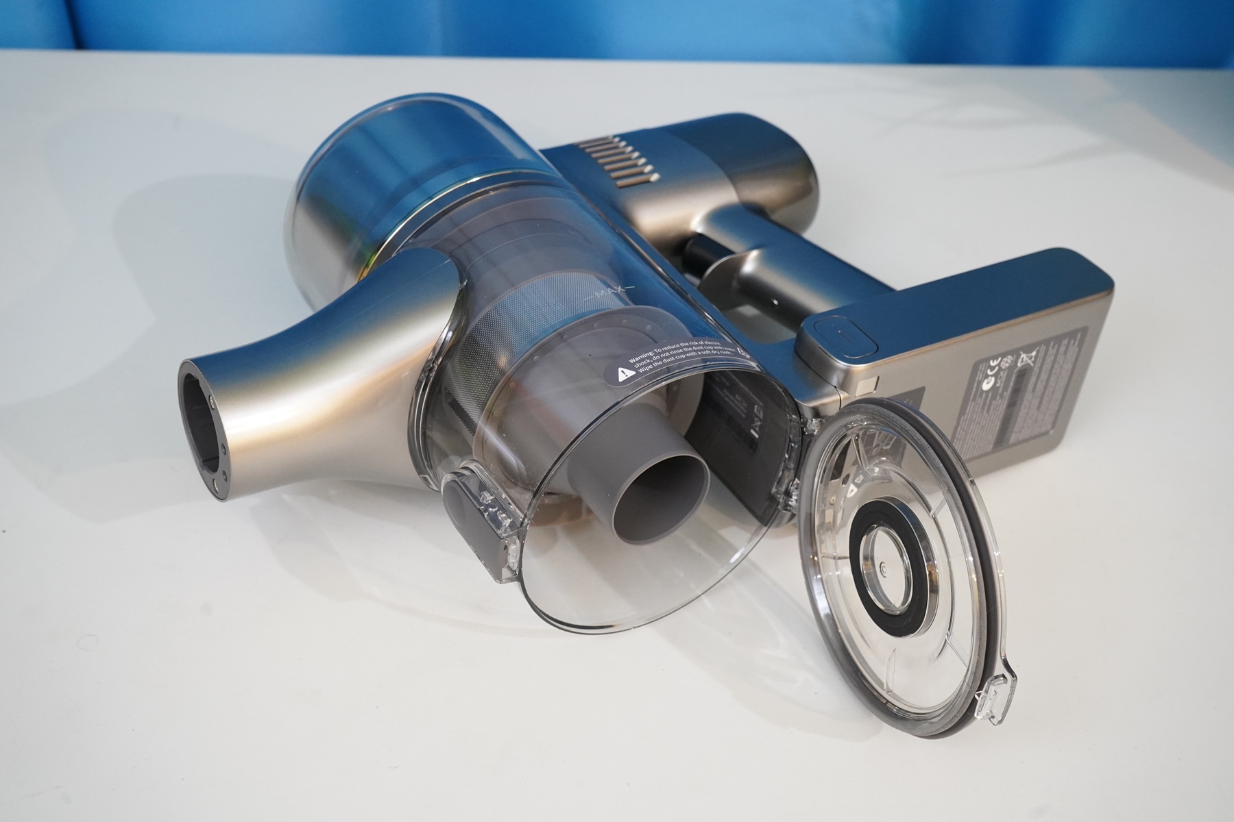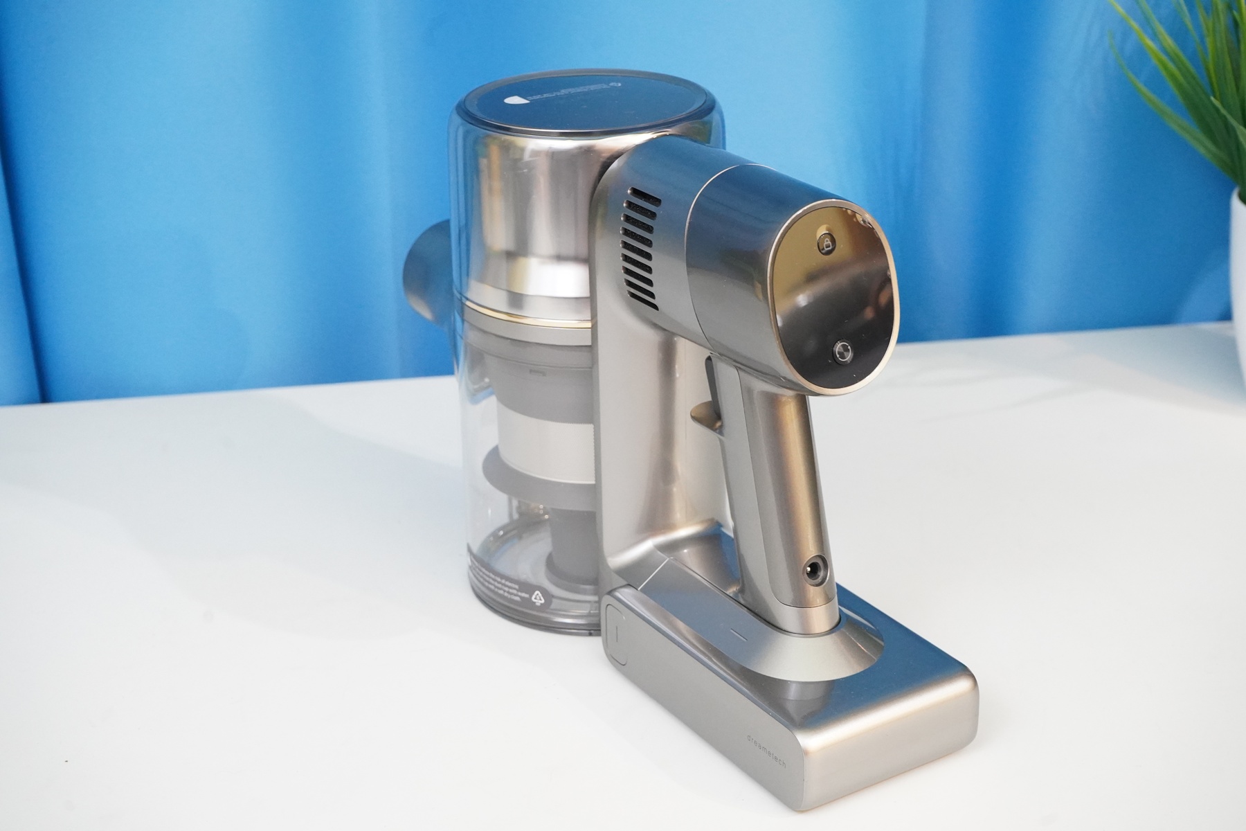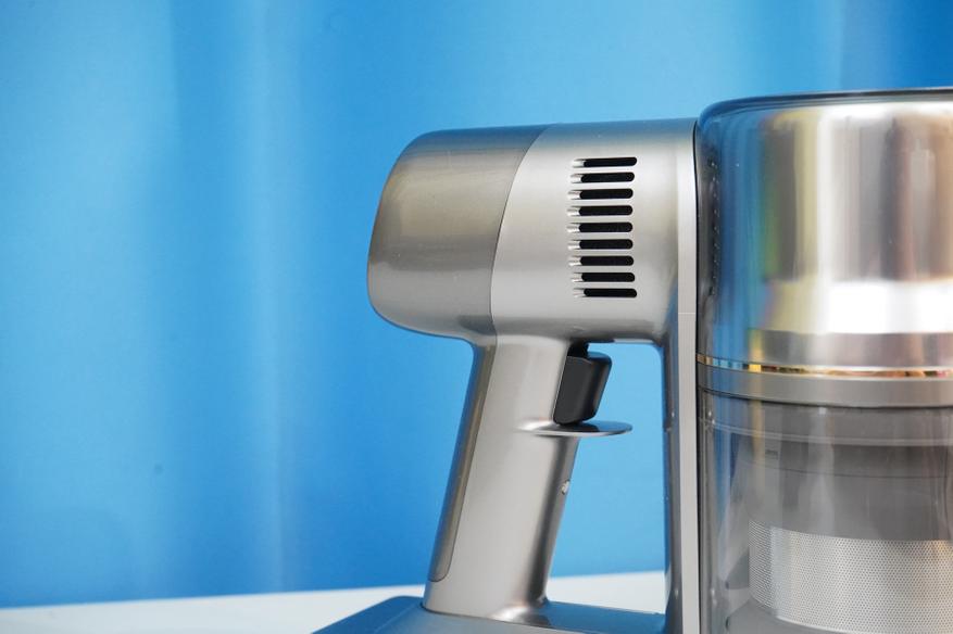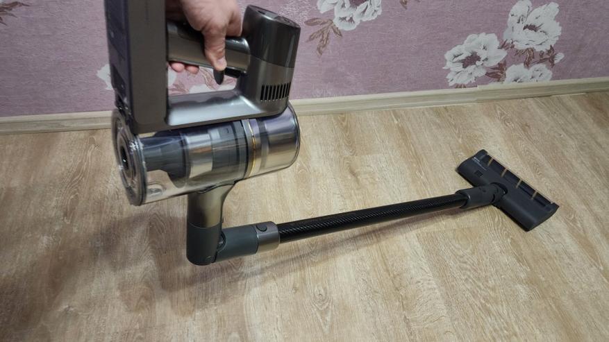 Сам по себе пылесос состоит из моторного модуля (корпуса) на который устанавливается АКБ и мусоросборник. Там же располагается система фильтров (несколько ступеней фильтров от грубой металлической сетки до тонкой HEPA-очистки), а также кнопки запуска/управления и цветной дисплей. Рукоятка имеет небольшой угол наклона таким образом, чтобы при уборке было удобнее удерживать пылесос в сборе. Конструкция более или менее продумана, мусоросборник можно полностью снять, разобрать, а фильтры — извлечь для очистки. Да и АКБ выполнена съемной в форм-факторе слайдера.